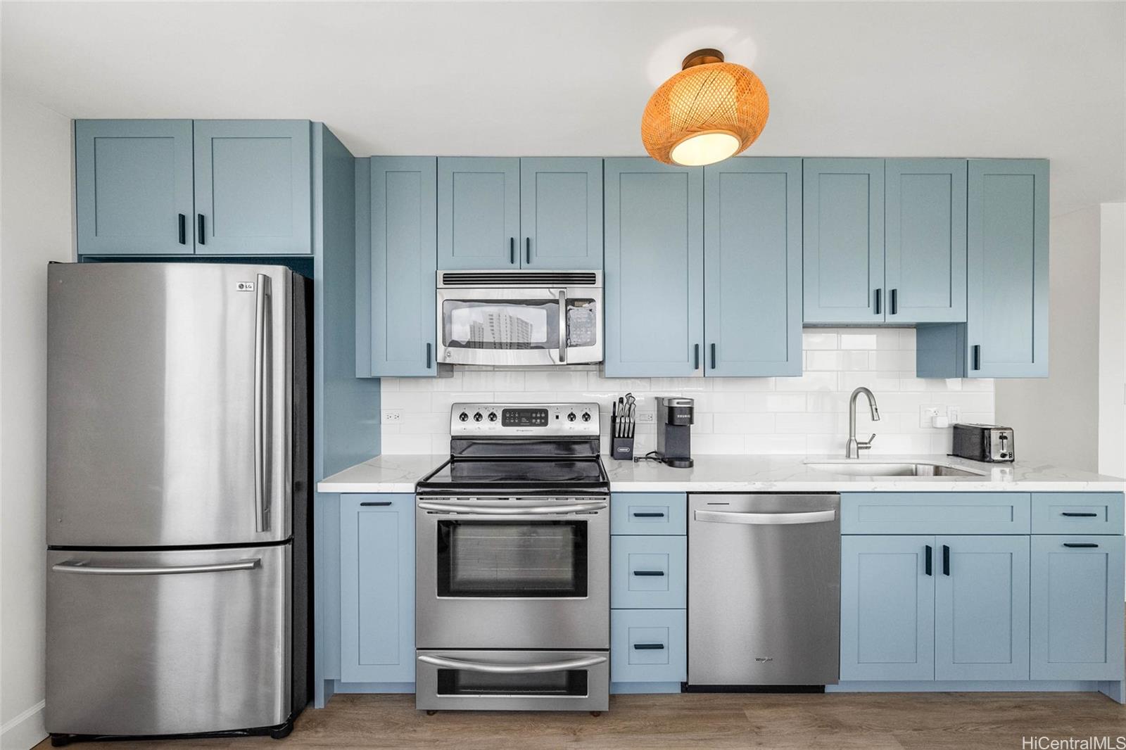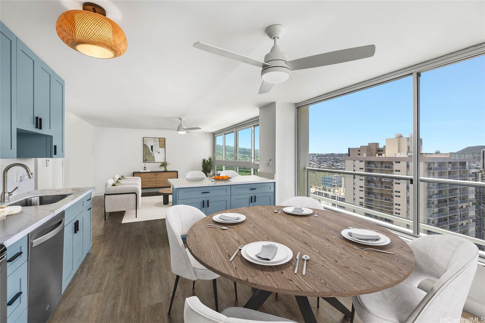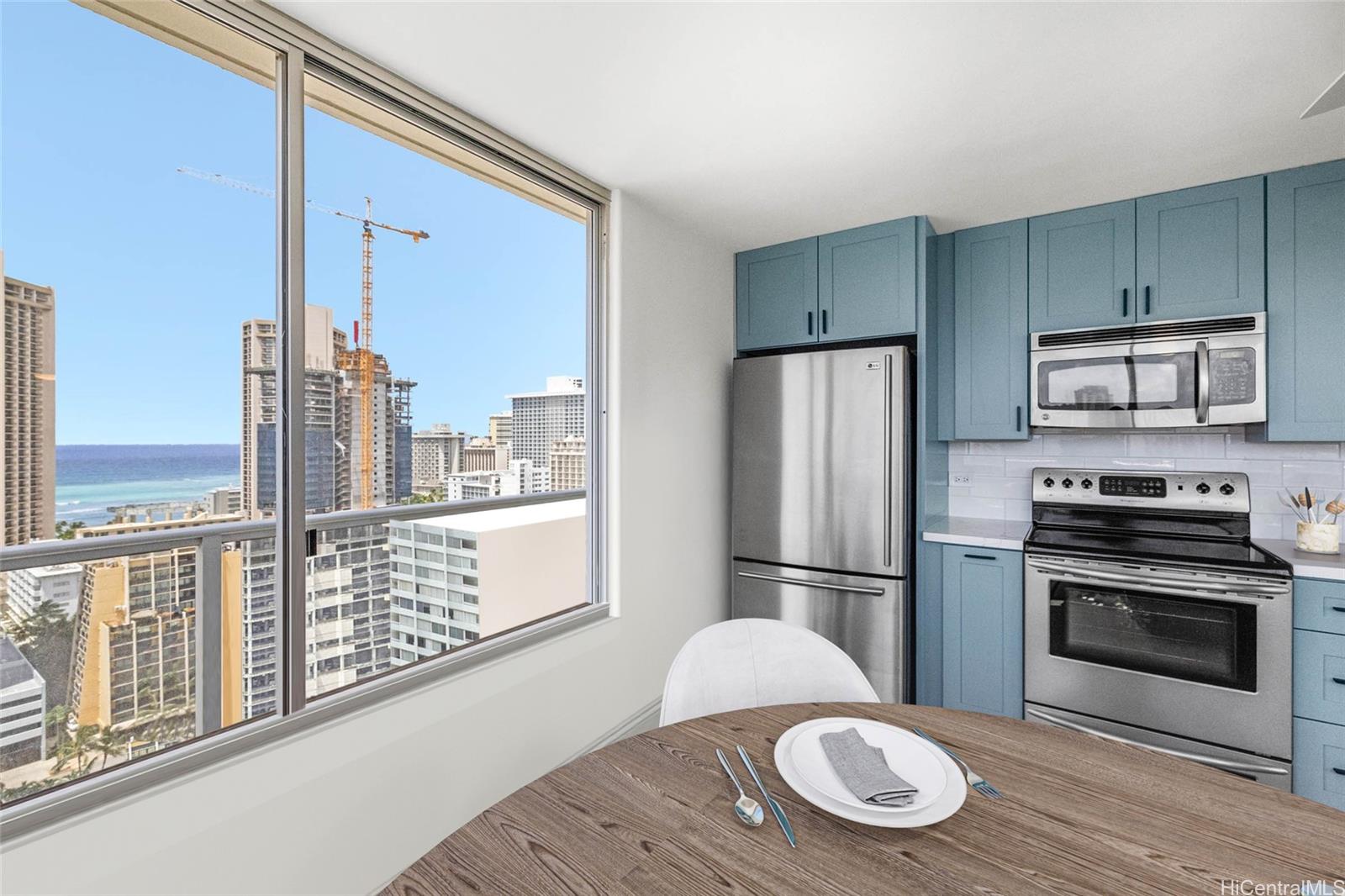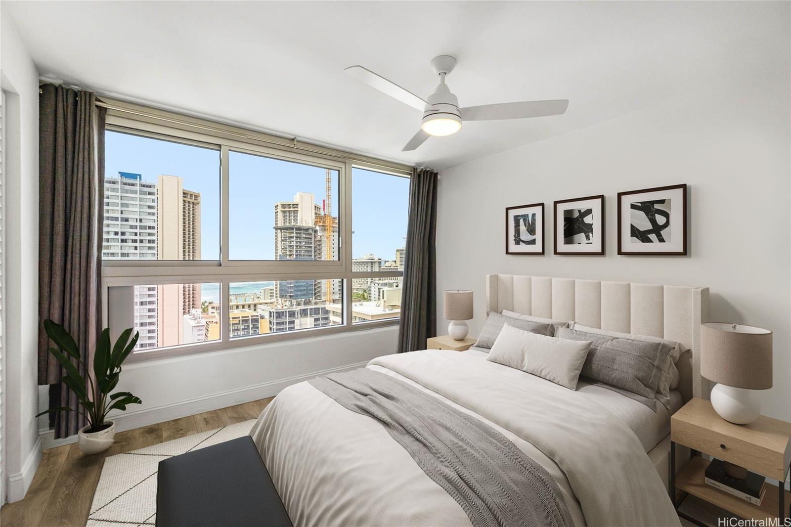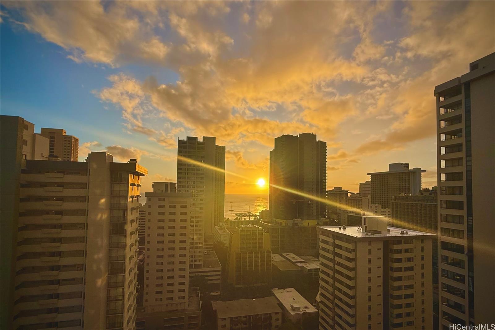 Sun, Sand & Surf! Experience easy island living at Waikiki Townhouse in this highly desired “04” corner-end unit with only 4 units per floor. Incredible expansive windows framing panoramic views spanning from Diamond Head & Ala Wai golf course to the ocean by day transitioning to spectacular sunsets & twinkling city lights by night. Enjoy a spacious layout with enclosed lanai on the preferred Diamond Head side w/an open floor plan that connects living, dining & kitchen spaces seamlessly. NEW Electrical Panel & Fully renovated in 2024 with ~$75K in upgrades, featuring smooth ceilings (no popcorn), vinyl plank flooring, modern kitchen w/custom cabinets & stainless steel appliances, beautiful tiled bathroom, ceiling fans & washer/dryer. Assigned parking available via waitlist (avg. 2–4 months). This secured, pet-friendly bldg w/res manager has bike/surfboard storage & guest parking. VA APPROVED! Waikiki is the iconic playground of Honolulu’s south shore, renowned for its world-famous beaches, premier shopping, diverse dining & vibrant nightlife. More than just a destination, it’s a lifestyle!