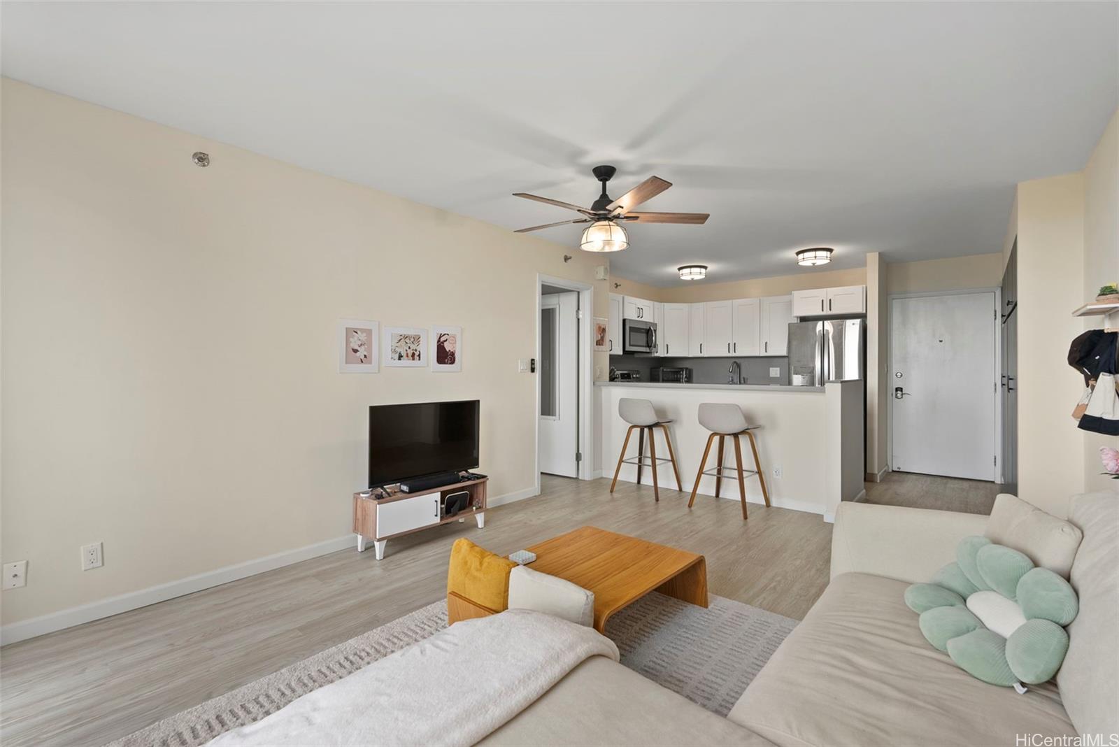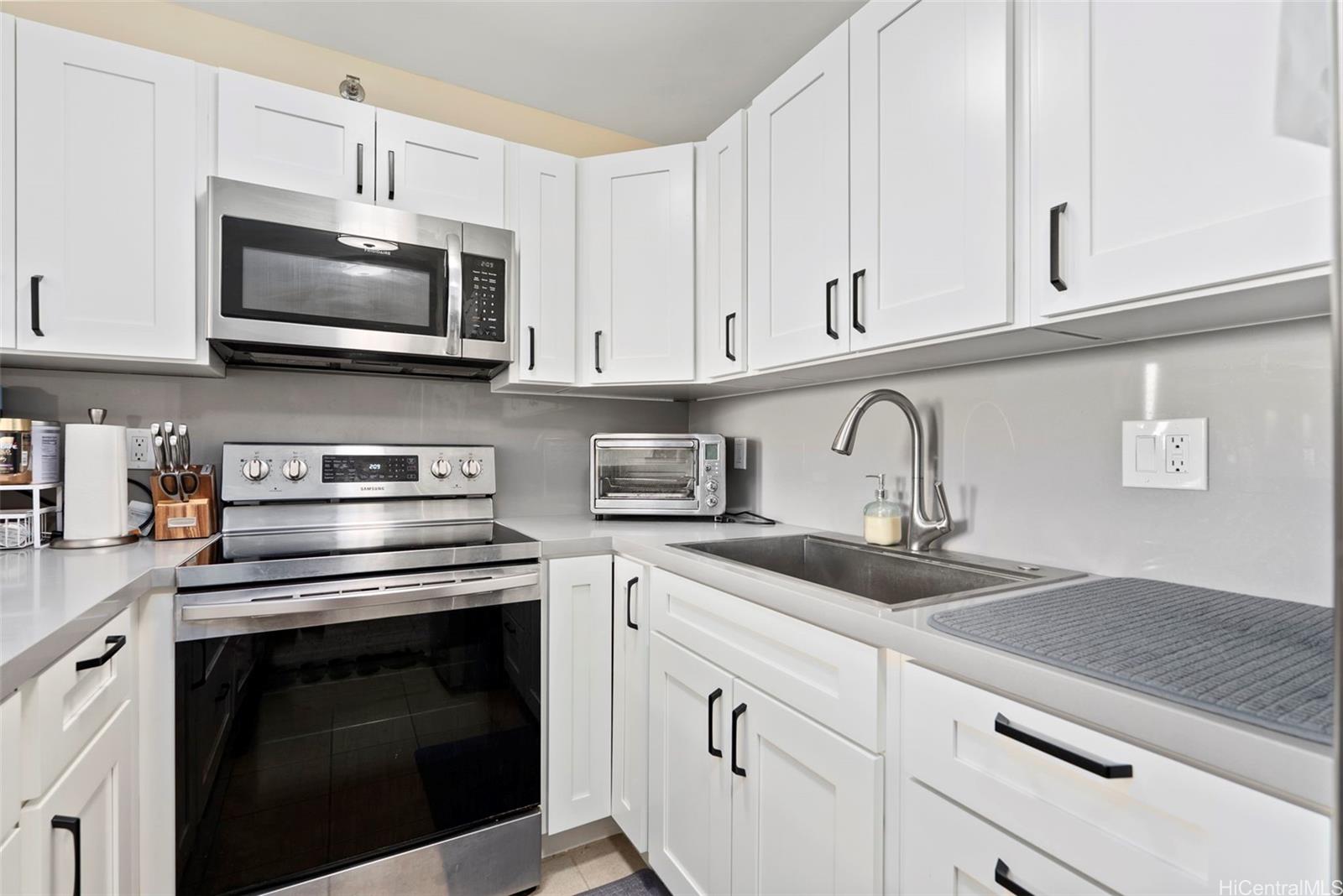 Conveniently located on a low floor on the preferred side, this 1bedrm, 1 bath condo at Pearl Regency has a lanai overlooking the neighborhood. Meticulously kept and recently renovated featuring smooth finished ceilings, AC, ceiling fan, vinyl plank flooring, fully upgraded kitchen with new cabinetry, quartz countertops, stainless steel appliances, and a glazed shower. Enjoy the convenience of an in-unit front load washer/dryer, an assigned parking stall, car wash area, & additional storage. Pearl Regency is a pet friendly well-maintained high-rise community, hurricane insured, fire sprinklers, 24-hr security on site, and generous guest parking. Amenities include a pool, kiddie pool, jacuzzi, tennis court, playground area, exercise room, clubhouse, BBQ area, and pavilion- perfect for entertaining or relaxing. Additional bike, surfboard storage, and motorcycle parking available. Located near Pearlridge Shopping Center and Pali Momi Medical Center, bus route, minutes from Pearl Harbor, Hickam AFB, airport, dining, schools, and freeway access. Don't miss your chance to live in comfort, style, and convenience in the heart of Aiea!