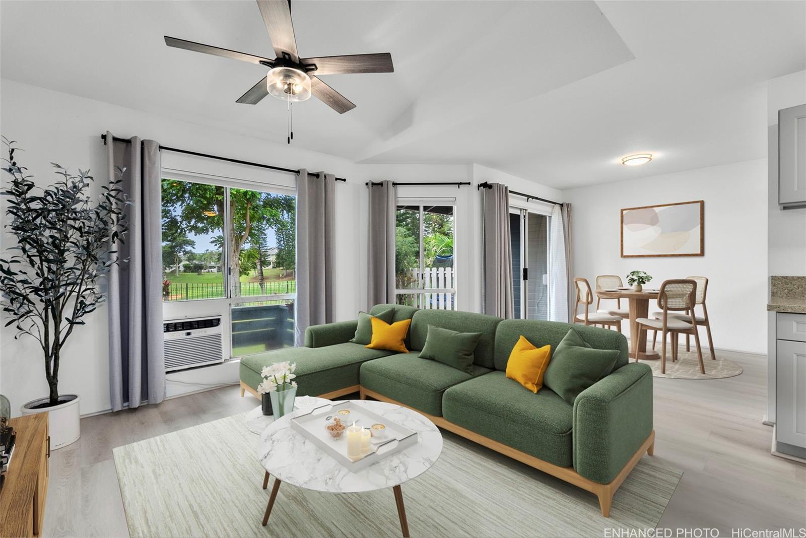 Welcome to this beautifully renovated 3-bedroom, 2.5-bathroom townhome, with direct golf course frontage. This unit offers the comfort & privacy of a single-family home in this highly sought-after Waikele community. This home has been thoughtfully updated with elegant finishes, including a sleek, modern kitchen featuring quartz countertops, new cabinetry, and stainless steel appliances. Luxury vinyl plank flooring adds a touch of sophistication, while the updated bathrooms offer a spa-like retreat. The spacious two-car garage provides convenient direct access to the kitchen, while the fully fenced, landscaped backyard provides an ideal outdoor space for entertaining or enjoying the lush golf course views. With its excellent layout and abundant natural light, this home truly feels like a private retreat. Located in a prime central Oahu location, you'll enjoy easy access to Waikele Shopping Center, H-1 Freeway, Central Oahu Regional Park, and the Waipio Soccer Complex. Whether you're shopping, dining, or enjoying outdoor activities, everything is within reach. Don’t miss your chance to see this exceptional property—schedule a showing today! A few photos have been virtually enhanced.