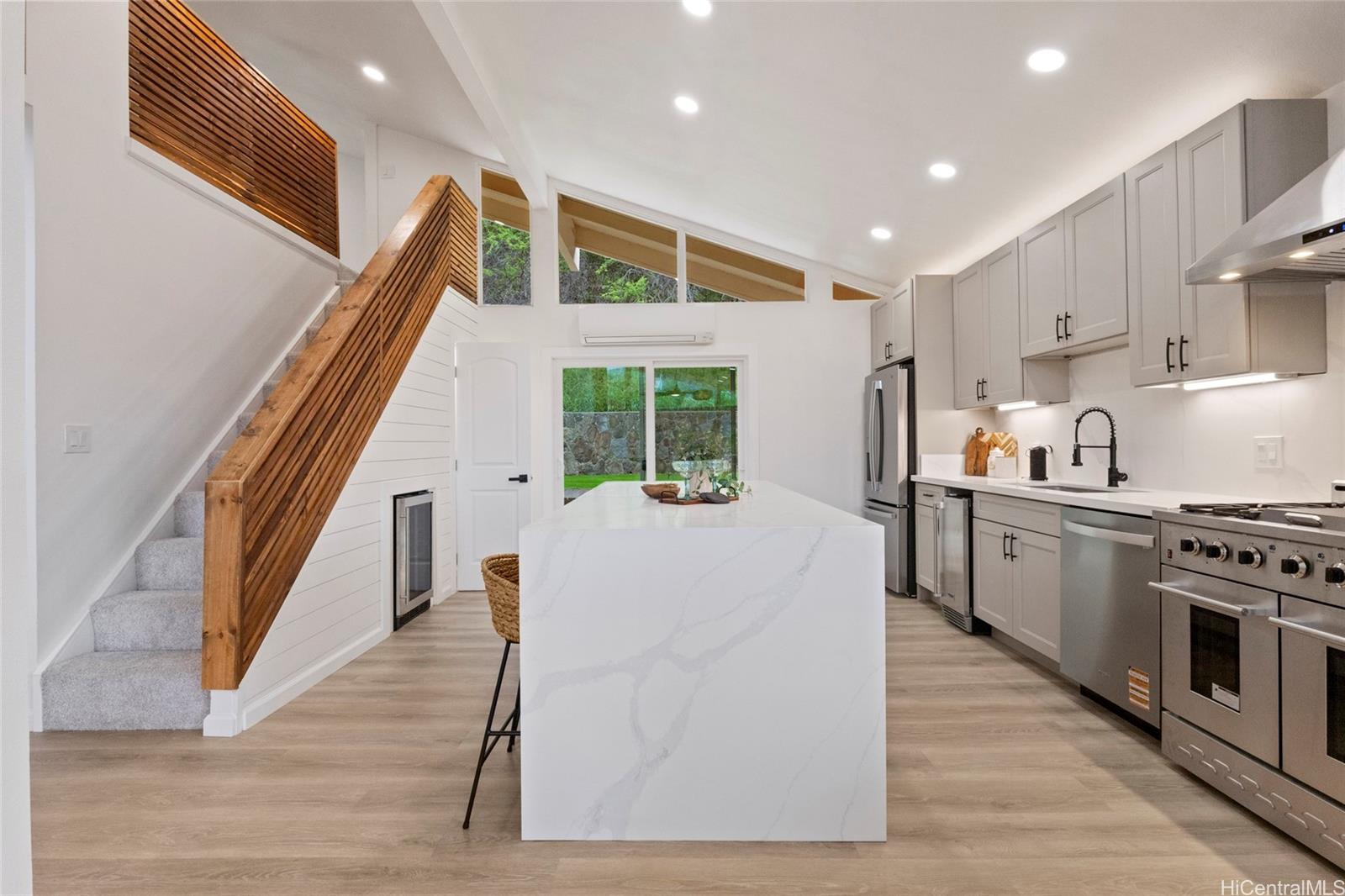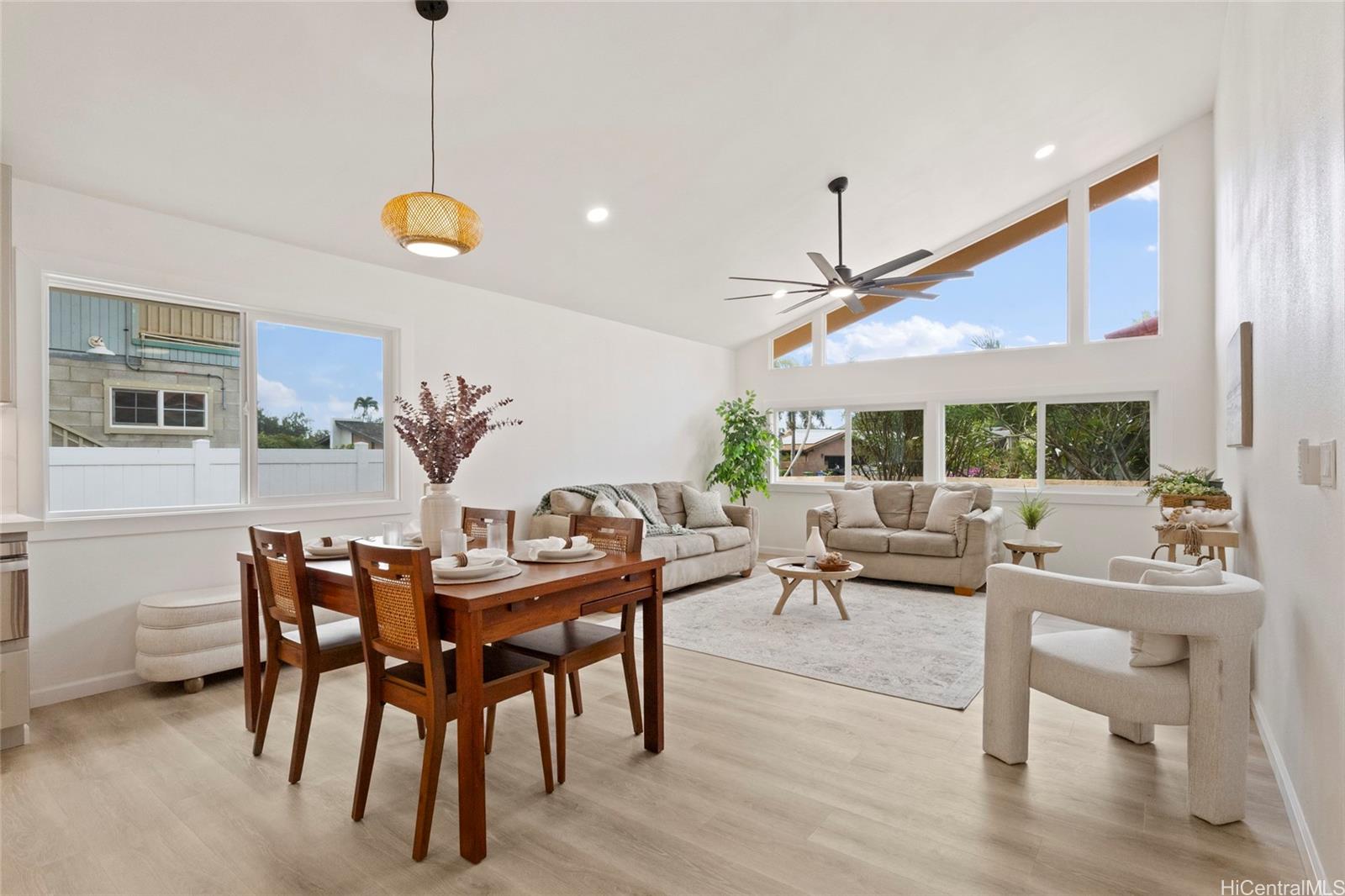 Beautiful Kalama Valley home comes with 4 bedrooms and 2 bathrooms. The main floor is 1,566 sq ft and the upstairs loft offers and additional 406 sq ft. This home has been tastefully upgraded with new luxury vinyl flooring throughout, new kitchen cabinets, and quartz countertops. The vaulted kitchen and dining room flow seamlessly to the open concept living room with tons of natural light from the large windows. The over 8,000 sq ft lot offers usable outdoor space that is perfect for entertaining. Enjoy all the benefits of living in Hawaii Kai with the top rated public schools, beautiful beaches, and close proximity to shopping.