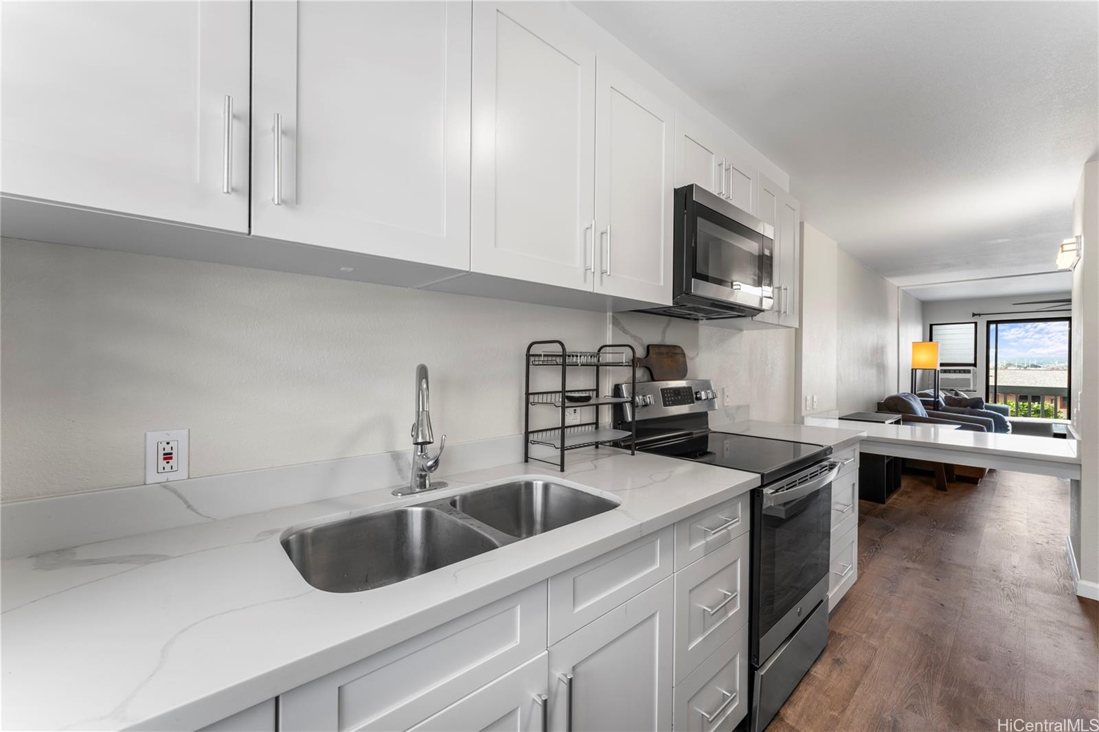 Welcome to Pearl Horizons, a highly desirable, pet-friendly community in the heart of Aiea. This beautifully and fully remodeled 2-bedroom, 1.5-bath with a washer and dryer in unit features a spacious floor plan with stunning views of Pearl Harbor and the mountains. Enjoy a recently renovated kitchen with quartz countertops, new cabinetry, and stainless steel appliances, along with modernized bathrooms featuring sleek vanities and updated countertops. Pearl Horizons offers resort-style amenities including a swimming pool, whirlpool, sauna, BBQ area, clubhouse, resident manager, and security patrol. Ideally located near Pearlridge Center, Waimalu Plaza, schools, freeway access, bus lines, and the Skyline rail station, with close proximity to Joint Base Pearl Harbor-Hickam. A biking trail around Pearl Harbor is just minutes away. Experience the perfect balance of island living and urban convenience.