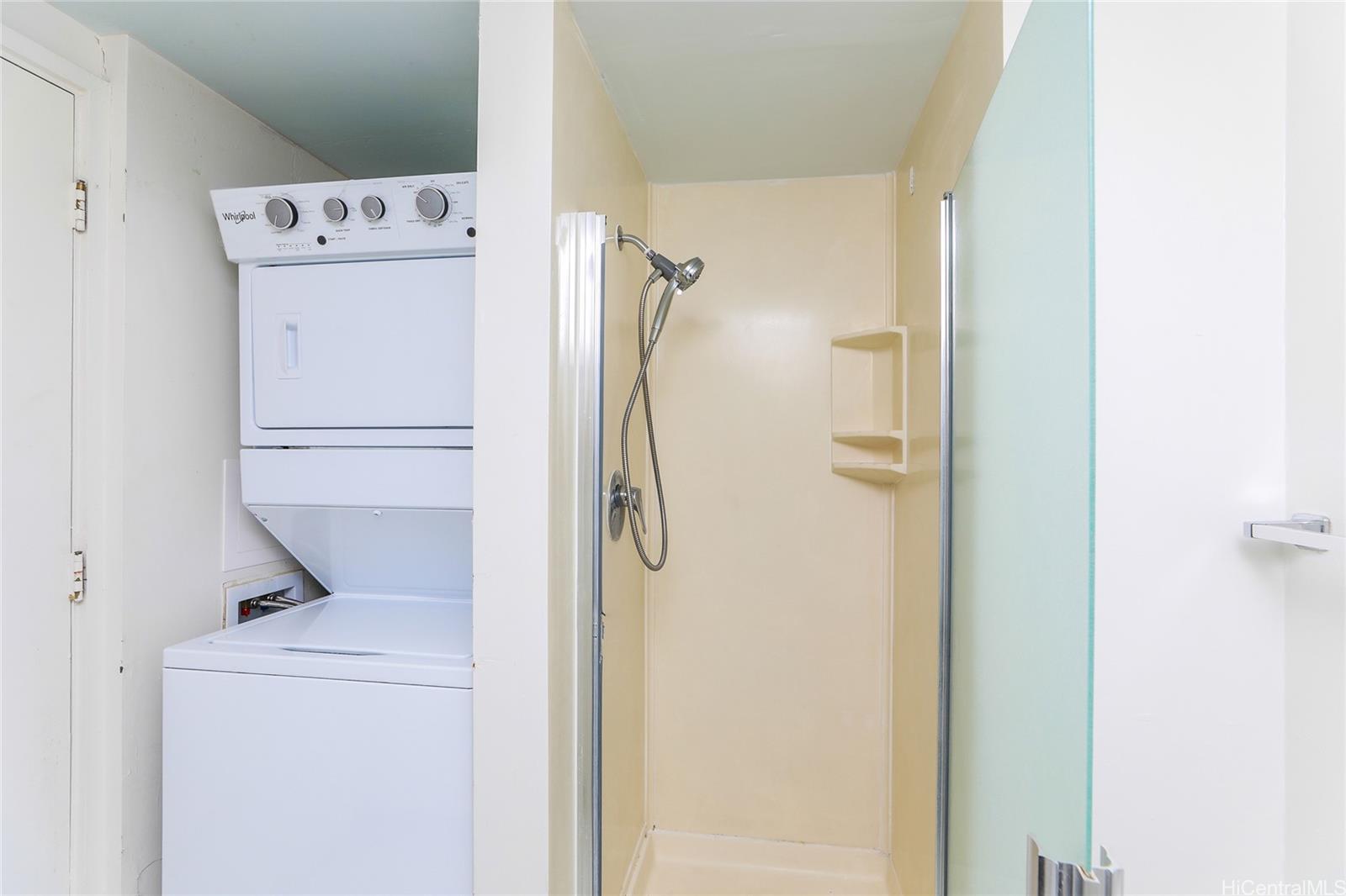 Aloha Towers - 12th floor 2-bedroom, 2-bath condo with over 1,000 square feet of interior living space and a convenient covered parking stall on street level. The tiled, covered lanai offers both ocean and city views and extends the living area for relaxing or entertaining. The living room and both bedrooms are carpeted, while the kitchen and bathrooms feature ceramic tile flooring. The kitchen comes equipped with a gas range/oven, refrigerator, dishwasher, and a stack washer/dryer for added convenience. One bathroom offers a walk-in shower and the other includes a bathtub, providing options for different preferences. All appliances and the unit are to be conveyed in AS IS condition.