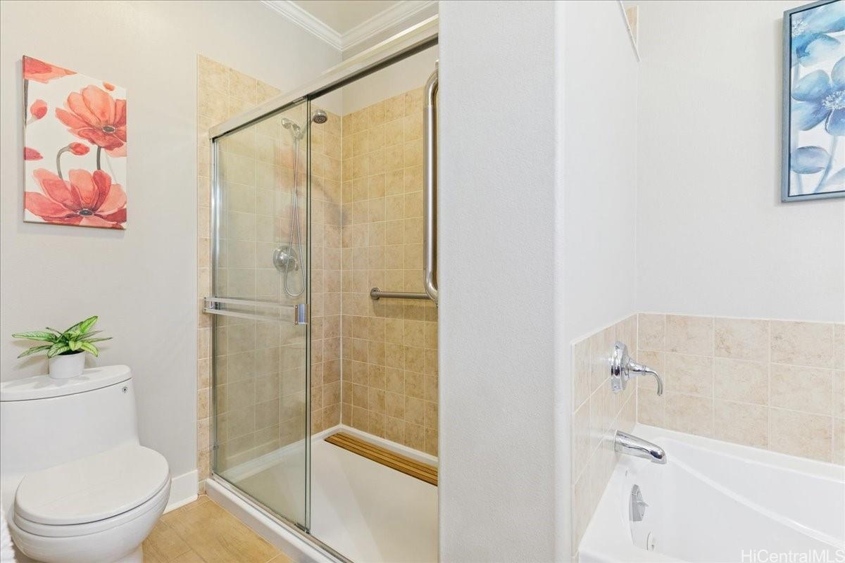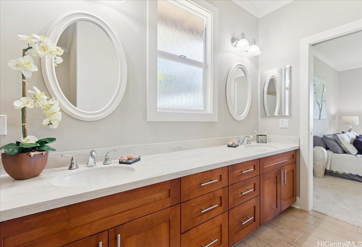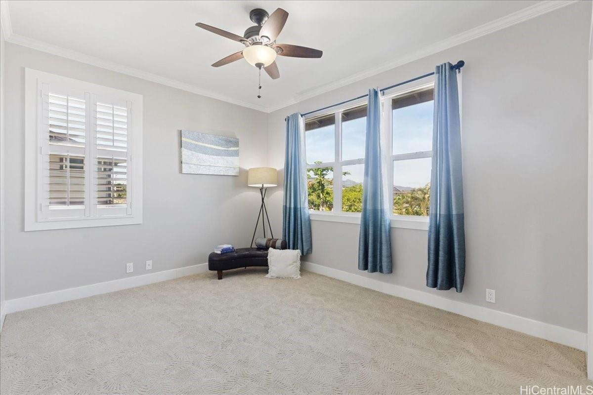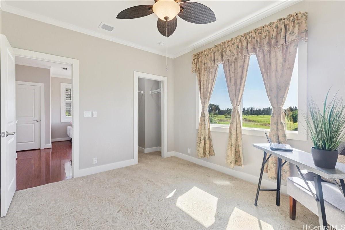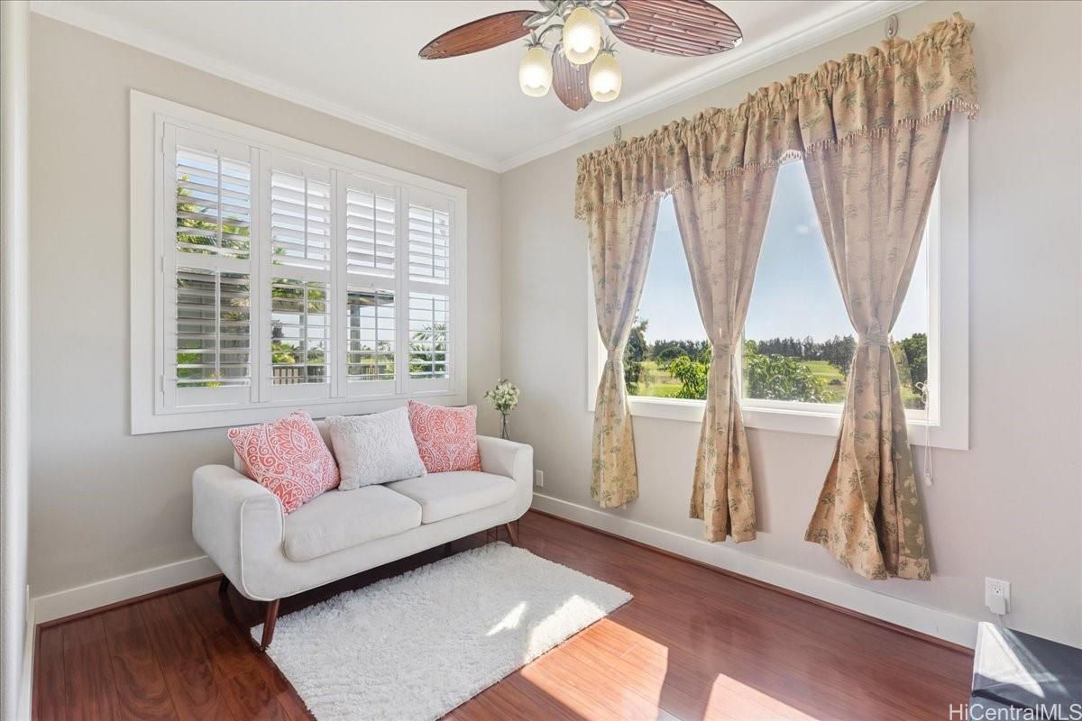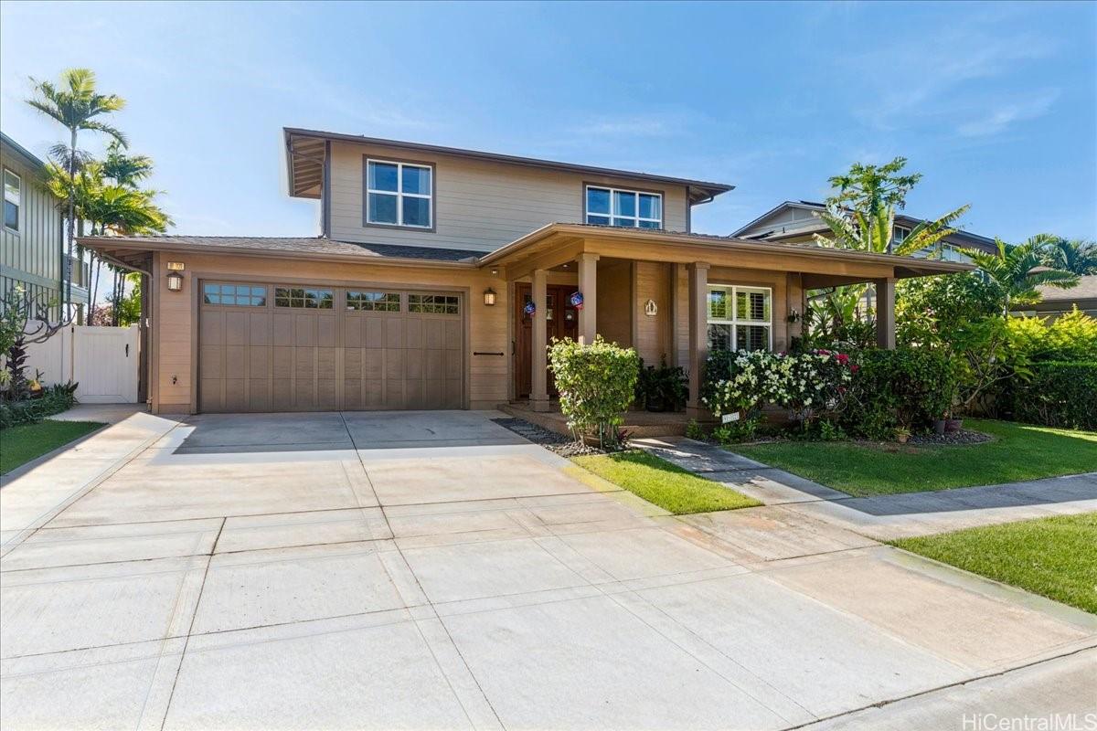 Luxurious island living awaits in this 4-bedroom, 2.5-bath executive home overlooking the 6th hole (A course) of the Hawaii Prince Golf Course. This residence features a spacious open floor plan, a gourmet kitchen with stainless steel appliances and a large pantry, and an expansive downstairs primary suite with a walk-in shower and soaking tub. The upper level offers a loft for an office or media area with views of the lush green fairways along with three comfortably sized bedrooms. Enjoy a beautifully landscaped yard that enhances the island lifestyle with lilikoi, lemons, bananas, and green onions. A covered lanai ideal for outdoor gathering and relaxation. Key highlights of this home includes central A/C, solar water heating, owned 19 PV panels, high ceilings, plantation shutters, and a 2-car garage with driveway parking. No maintenance fees! Adventure in and about Ewa to the many community events, various shopping centers, eateries, and numerous golf courses, and more in this thriving community.