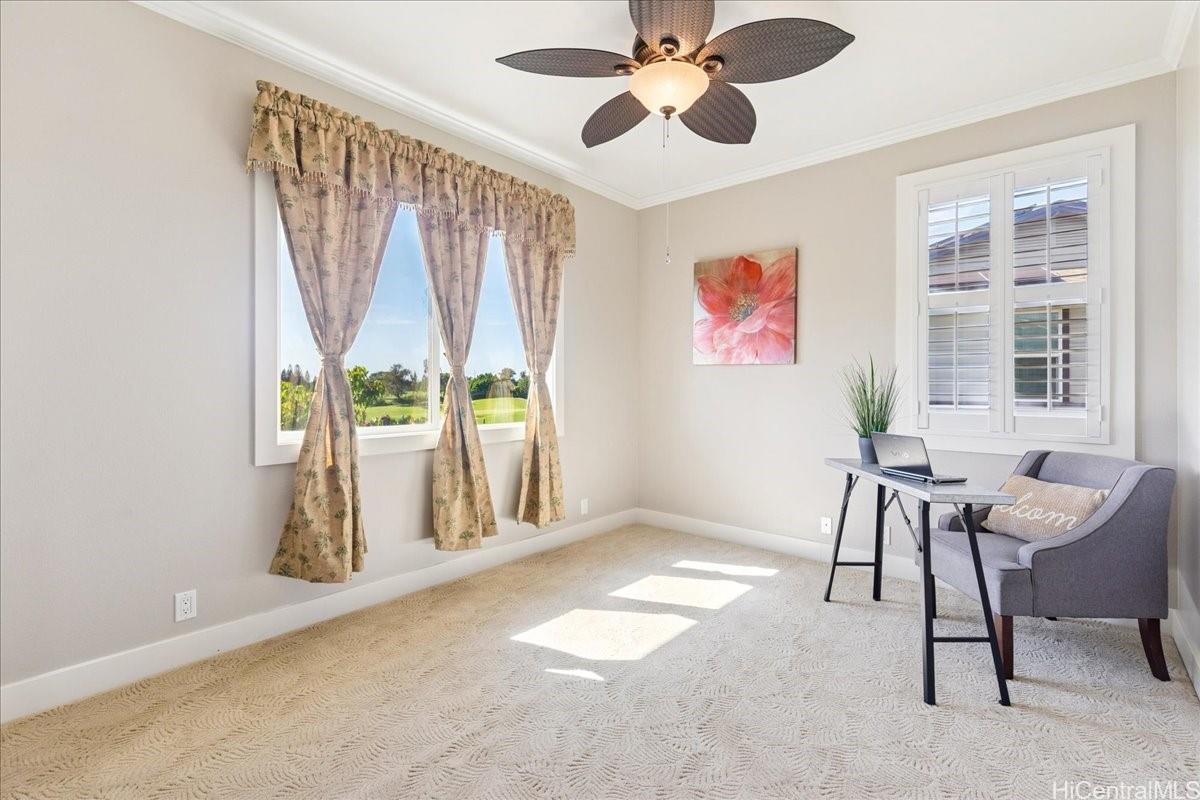 ハワイ・プリンス・ゴルフコースの6番ホール(Aコース)を見下ろす、4ベッドルーム、2.5バスルームのエグゼクティブ・ホームで、贅沢なアイランドライフをお楽しみください。広々としたオープンフロアプラン、ステンレス製家電と大型パントリーを備えたグルメキッチン、そしてウォークインシャワーとバスタブを備えた広々とした1階の主寝室を備えています。2階には、緑豊かなフェアウェイの景色を望むロフトがあり、オフィスやメディアスペースとしてご利用いただけます。さらに、快適な広さのベッドルームが3室あります。リリコイ、レモン、バナナ、ネギが美しく手入れされた庭は、アイランドライフをより一層引き立てます。屋根付きのベランダは、屋外での集まりやくつろぎに最適です。この住宅の主な特徴は、セントラルエアコン、太陽熱温水器、19枚の太陽光発電パネル、高い天井、プランテーションシャッター、そして車寄せ付き駐車スペース付きの2台用ガレージです。管理費はかかりません!エヴァとその周辺を冒険して、この活気あるコミュニティの多くのコミュニティイベント、さまざまなショッピング センター、飲食店、多数のゴルフ コースなどを体験してください。
