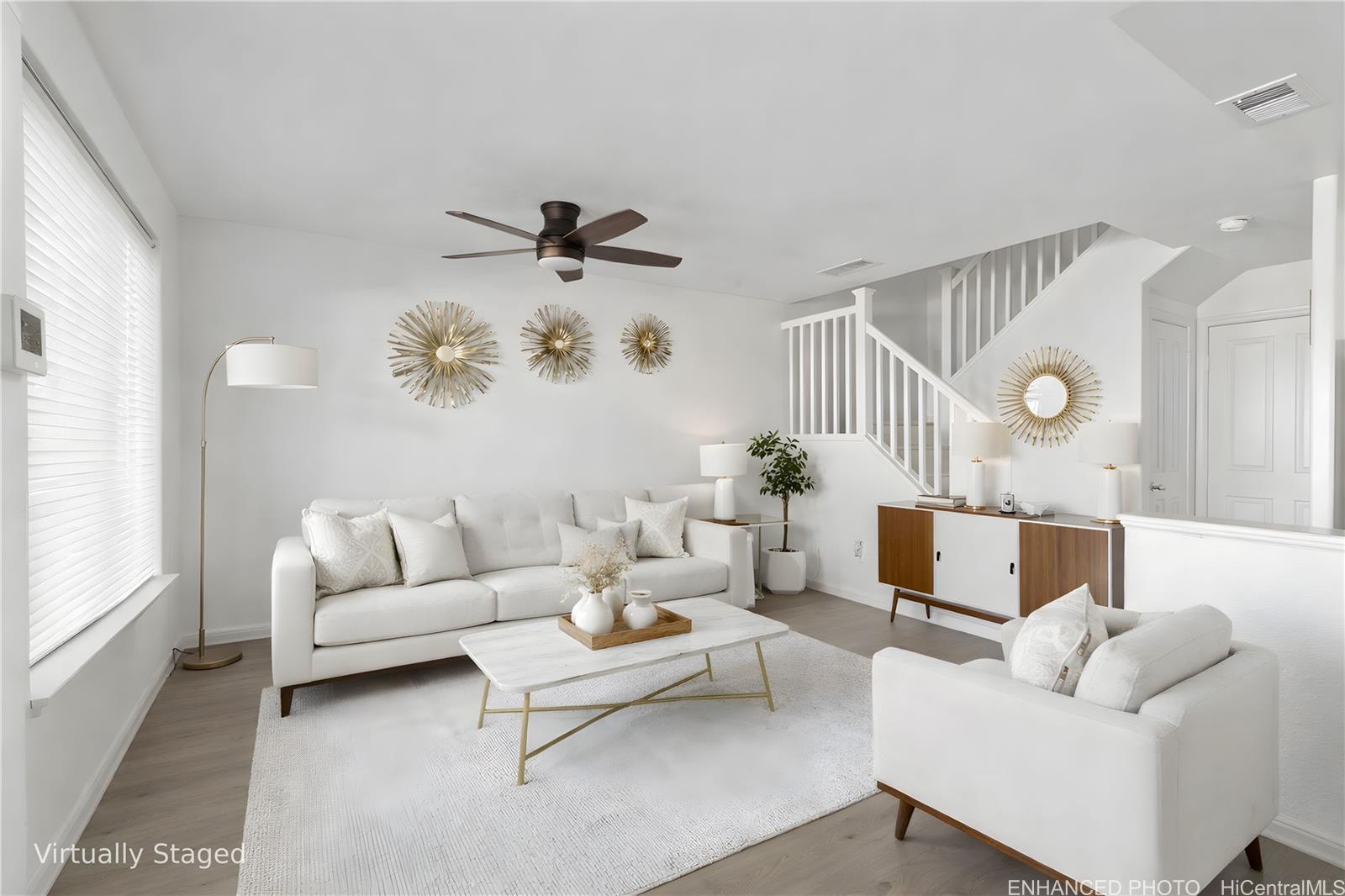 Welcome home. This beautifully appointed 3 bed, 2 bath townhome offers the perfect blend of comfort and style in one of West Oahu's most desirable communities. Featuring a thoughtful layout from living to dining and kitchen spaces creates a seamless flow on the lower level. On the second floor, the bedrooms are well proportioned and positioned. The primary bedroom features an en suite bathroom.