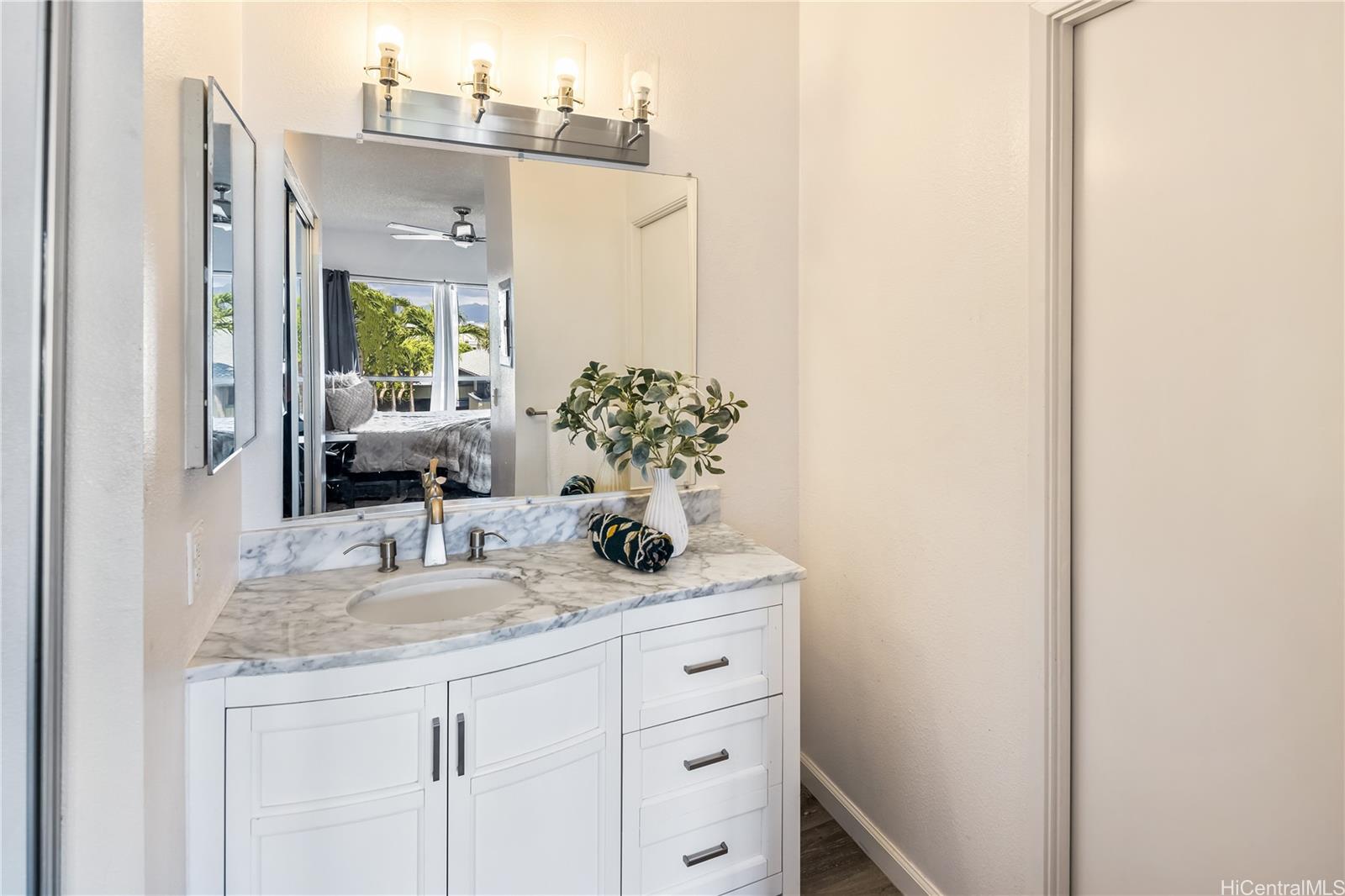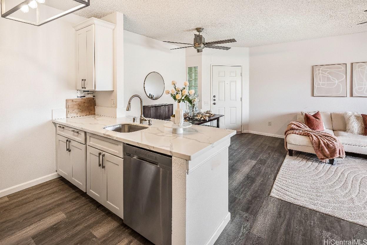 This modern, open-concept residence at Sunrise offers a sleek aesthetic and an inviting sense of space throughout. Designed for both comfort and style, the home features a generous living area that flows seamlessly to a spacious lanai—ideal for unwinding at the end of the day. Both bedrooms are well-proportioned, providing a calm and relaxing retreat.The unit includes two bedrooms, two full bathrooms, and two parking stalls. Vinyl plank flooring complements the home’s clean, modern design, while the updated kitchen and bathrooms showcase tasteful finishes that enhance the overall sophistication.Conveniently located near Foodland, Longs Drugs, banks, gas stations, Ka Makana Ali?i, Laulani Village, golf courses, public parks, and a variety of dining and shopping options, this home offers contemporary living with everyday convenience. Assumable VA Loan at 2.75% interest rate with an approximate loan balance of $298,335.