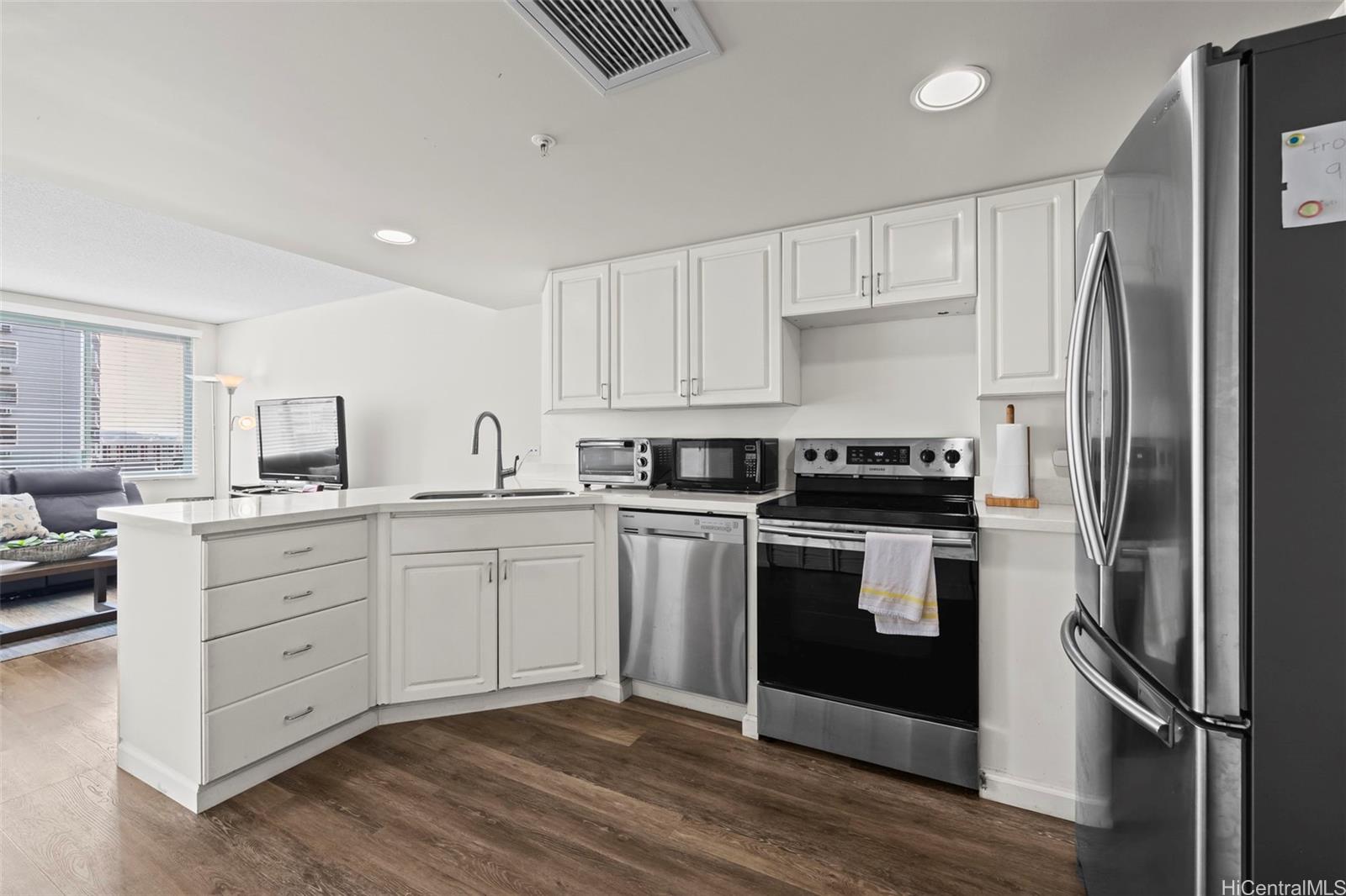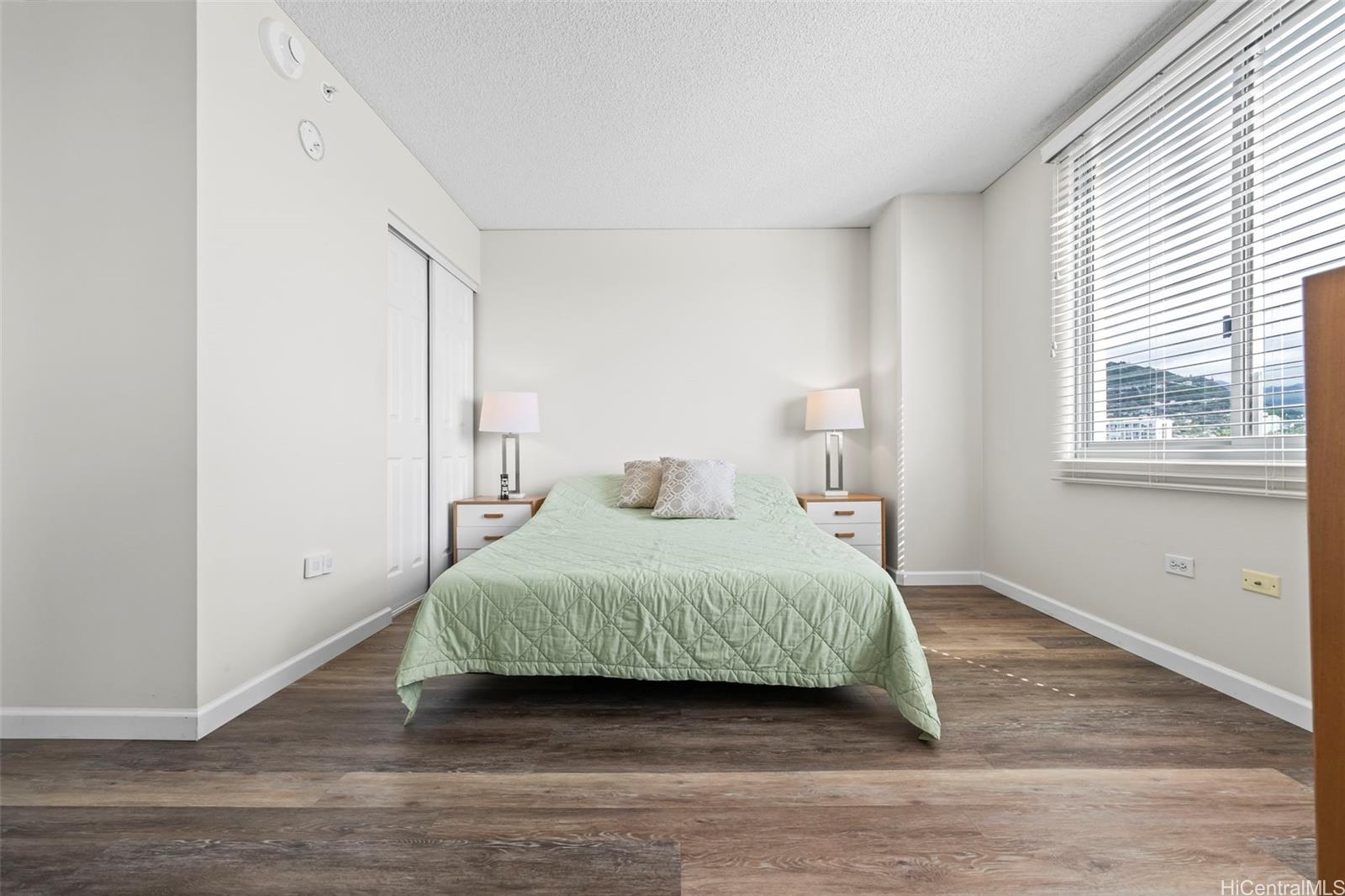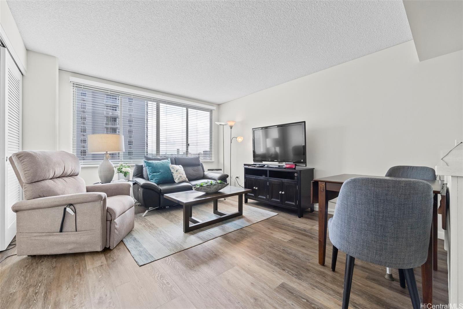 Peace and tranquility await you at One Kalakaua Senior Living! This 2 bed, 1 bath unit has been lovingly cared for over the years and features all the classic home comforts you could want: stainless steel kitchen appliances, vinyl plank flooring, a convertible living space with sleek sliding doors, and huge windows that let in tons of natural sunlight with city views of Honolulu. The large quartz counter top is perfect for home cooks to whip up a feast, and the ADA accessible bathroom is a huge plus with no step-in to the shower, and grab bars strategically placed throughout. The building itself offers a wide range of amenities including, but not limited to, a library, dining room, gym, music room, pool, cafeteria, and outdoor rocking chair seating area so you can enjoy a cold drink with your friends on warm summer days. Just minutes away from Ala Moana, Salt at Kakaako, and Ward Village. Must see to fully appreciate all this unit has to offer!