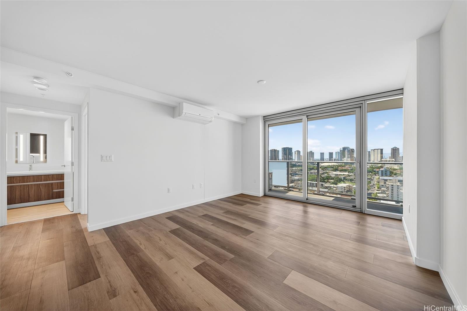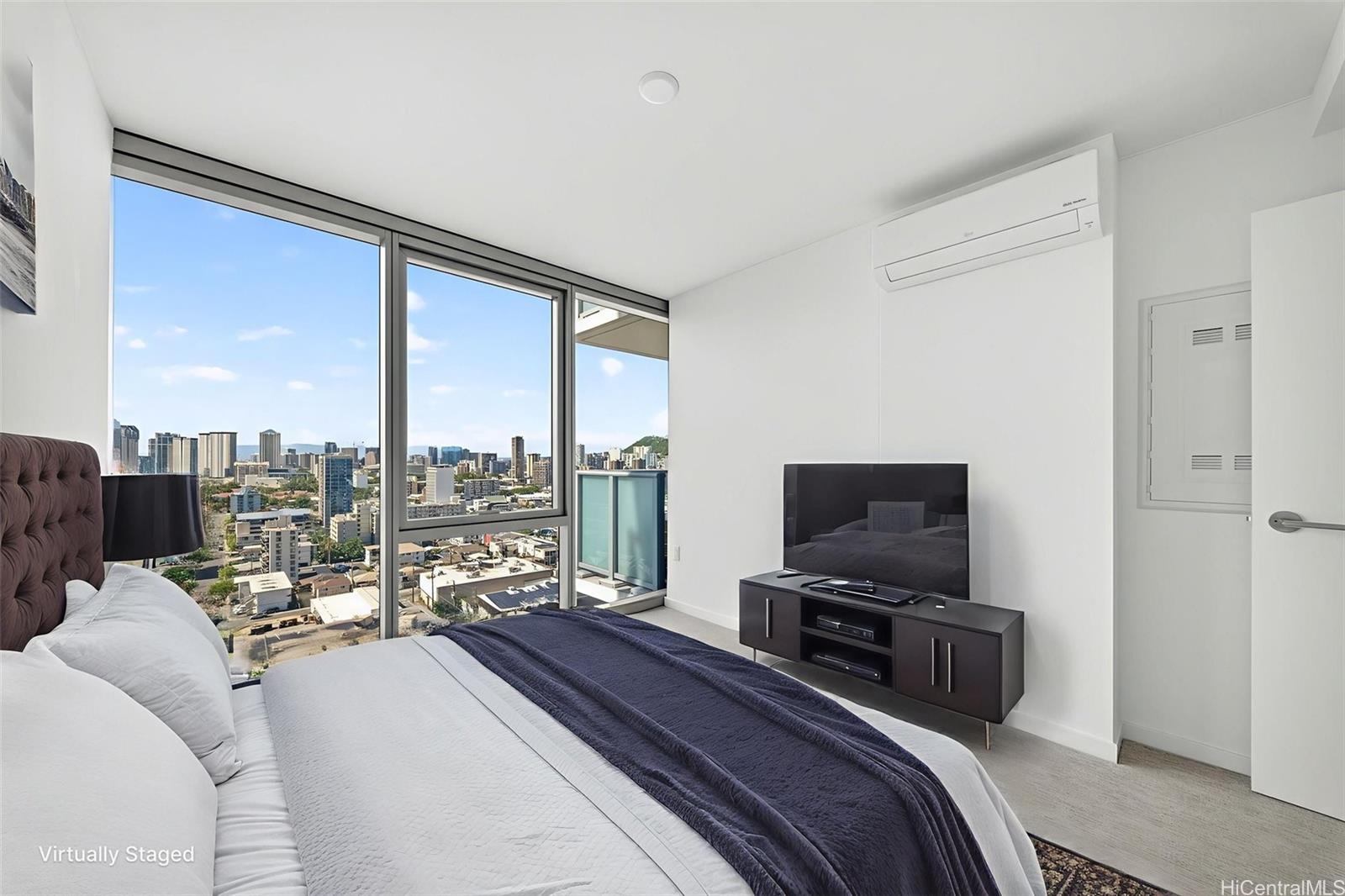 This one-bedroom residence offers the city views along with expansive floor-to-ceiling windows that fill the space with natural light. The open-concept layout features quartz countertops, luxury vinyl plank flooring in the living areas and kitchen, split AC in every room, and a private lanai to take in both city and ocean vistas.