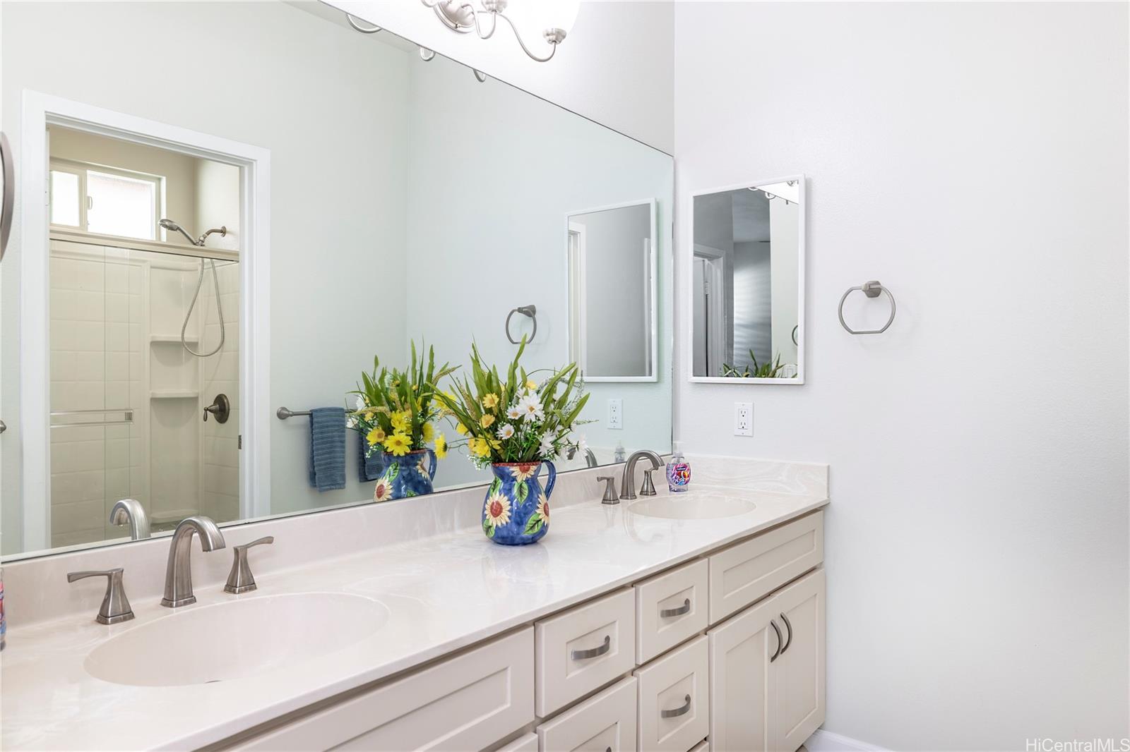 This beautifully upgraded single-level home is located in the desirable Kawena at Mehana community in Kapolei. The property features a fully remodeled kitchen with granite countertops, modern cabinetry with soft-close doors, built-in pullouts, and stainless-steel appliances. The open-concept floor plan provides seamless flow between the living, dining, and kitchen areas, making it ideal for everyday living and entertaining. Thoughtful upgrades throughout include new vinyl plank flooring, polyresin shutters, newly installed gutters, and a Mitsubishi split system AC for enhanced comfort. Additional energy-efficient improvements include leased solar panels and a solar water heater. The home also offers a Vivint alarm system, three spacious bedrooms, two bathrooms, and freshly painted interior and exterior finishes. Residents of Mehana enjoy access to community amenities including a pool, basketball courts, dog park, bike paths, restaurants, shops, and nearby medical facilities. Conveniently situated, this home is just minutes from Ka Makana Ali‘i Shopping Center, the Kroc Center, freeway access, rail transit, and the Ko Olina Resort area.
