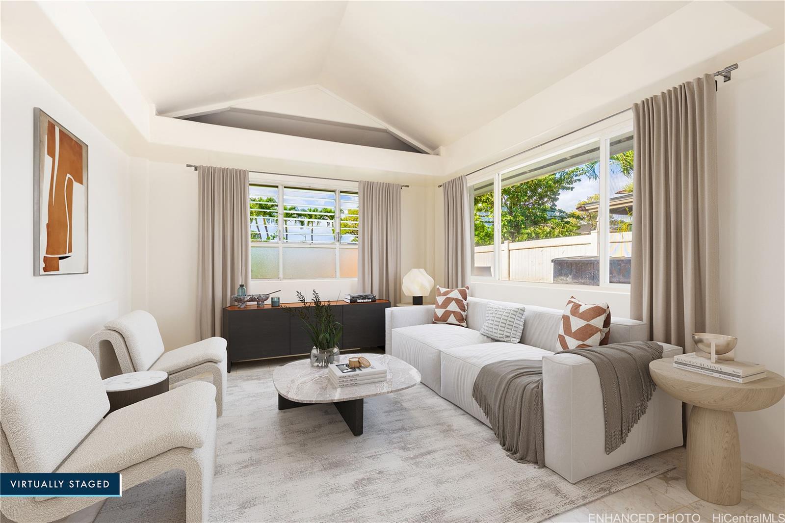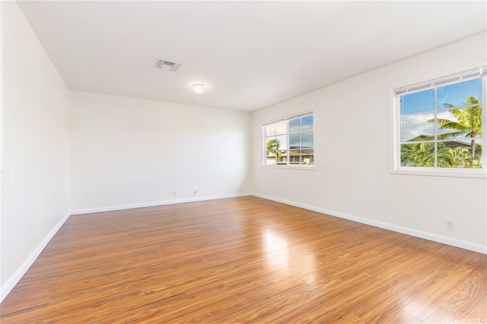 Rarely available, spacious and updated 4-bedroom, 3-bath, single family home in the desired Ewa Gentry Breakers community! Wonderful upgrades and renovations abound! Enjoy your modern and spacious kitchen, expanded dining room + pantry, laminate flooring, newer central A/C system, 41 leased PV panels and much more! Wonderfully spacious 3-bedrooms+ 2-bath upstairs with a huge loft space -- perfect for use as a den, home office, guest room, 2nd living room, etc. A 2nd primary bedroom on the first floor plus an expanded downstairs living room creates the perfect option for an in-law suite or guest room! Situated on a large level lot with no rear neighbors, a huge covered patio and an oversized driveway, this well-kept home is ready for all of your needs! Take advantage of a VA Assumable Loan at a historically low 2.25% interest rate + NO maintenance fees and an affordable $50.00 monthly association fee! Note: One or more photos may have been enhanced.