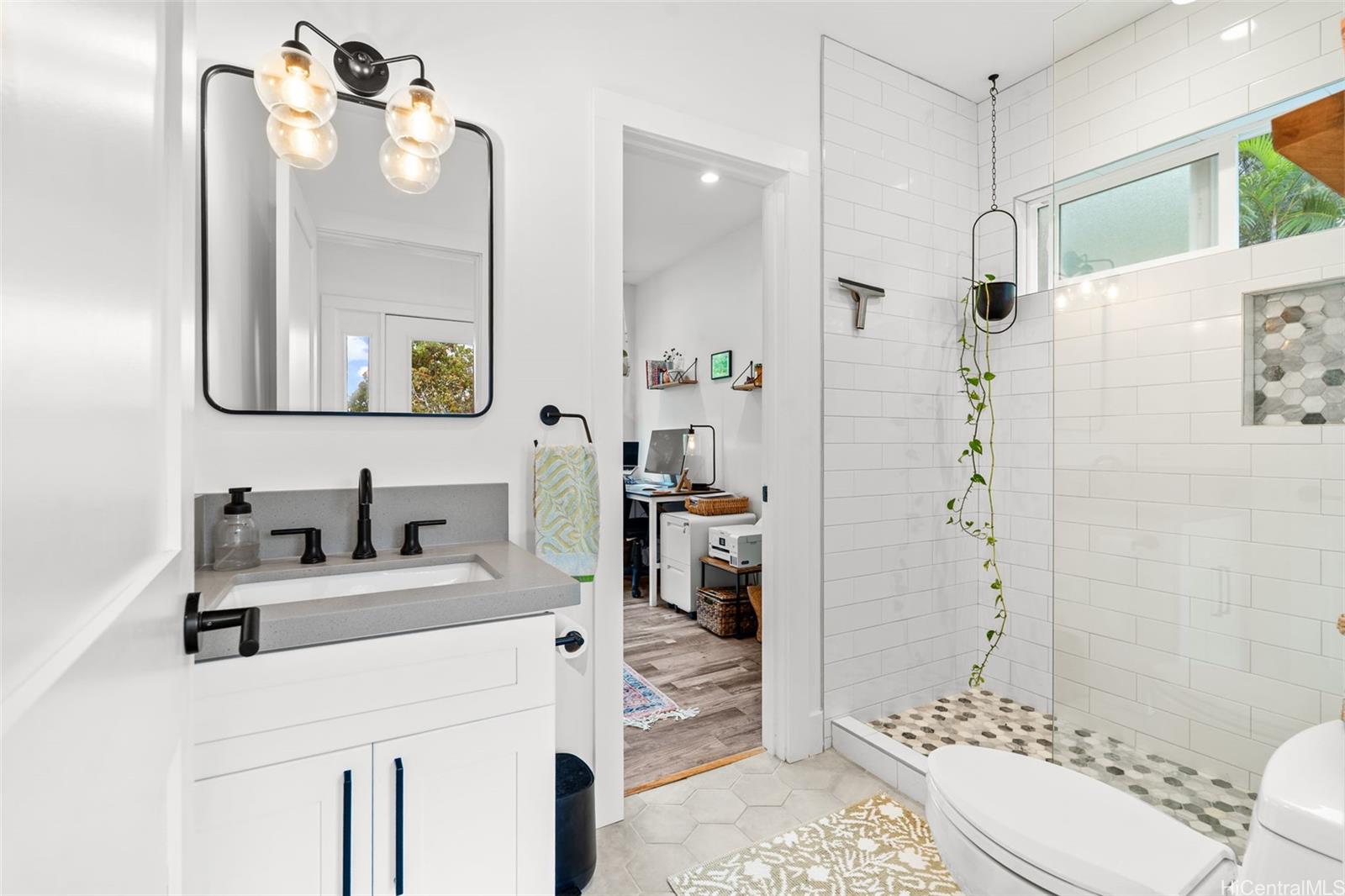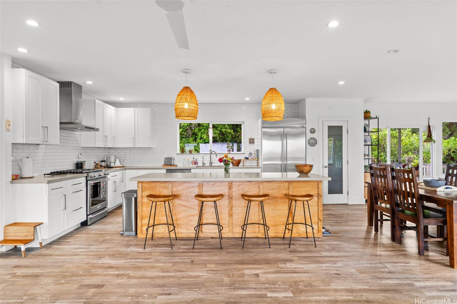 A large wraparound lanai anchors the home, creating a seamless indoor-outdoor connection. Ideal for entertaining or quiet moments alike, the lanai features a dedicated outdoor dining area with a full dining table, surrounded by integrated tropical planting that enhances privacy while framing the dramatic ocean backdrop. This expansive outdoor living space becomes a natural extension of the home—perfect for sunset dinners, morning coffee, and year-round enjoyment of the North Shore lifestyle.
