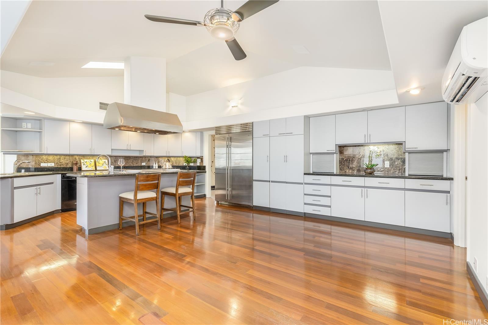 Rare opportunity in Pearlridge Estates—this exceptionally large residence offers over 5,000 square feet of interior living space, a true standout for the area. The spacious layout provides exceptional flexibility with multiple separate living areas, ideal for extended family living or entertaining guests. The gourmet kitchen is equipped with a Sub-Zero refrigerator, Viking gas range, and double wall ovens, and is complemented by a formal dining room and a sunny breakfast nook. Skylights throughout the home create an airy feel, enhanced by oversized ceiling heights. You’ve never seen a primary suite like this—an expansive bedroom with an enormous walk-in closet, along with a private study located downstairs that offers direct access to the garage. Enjoy breathtaking 180-degree views showcasing the ocean, coastline, and city lights. This is a truly rare luxury retreat—unlike anything else in Pearlridge Estates.