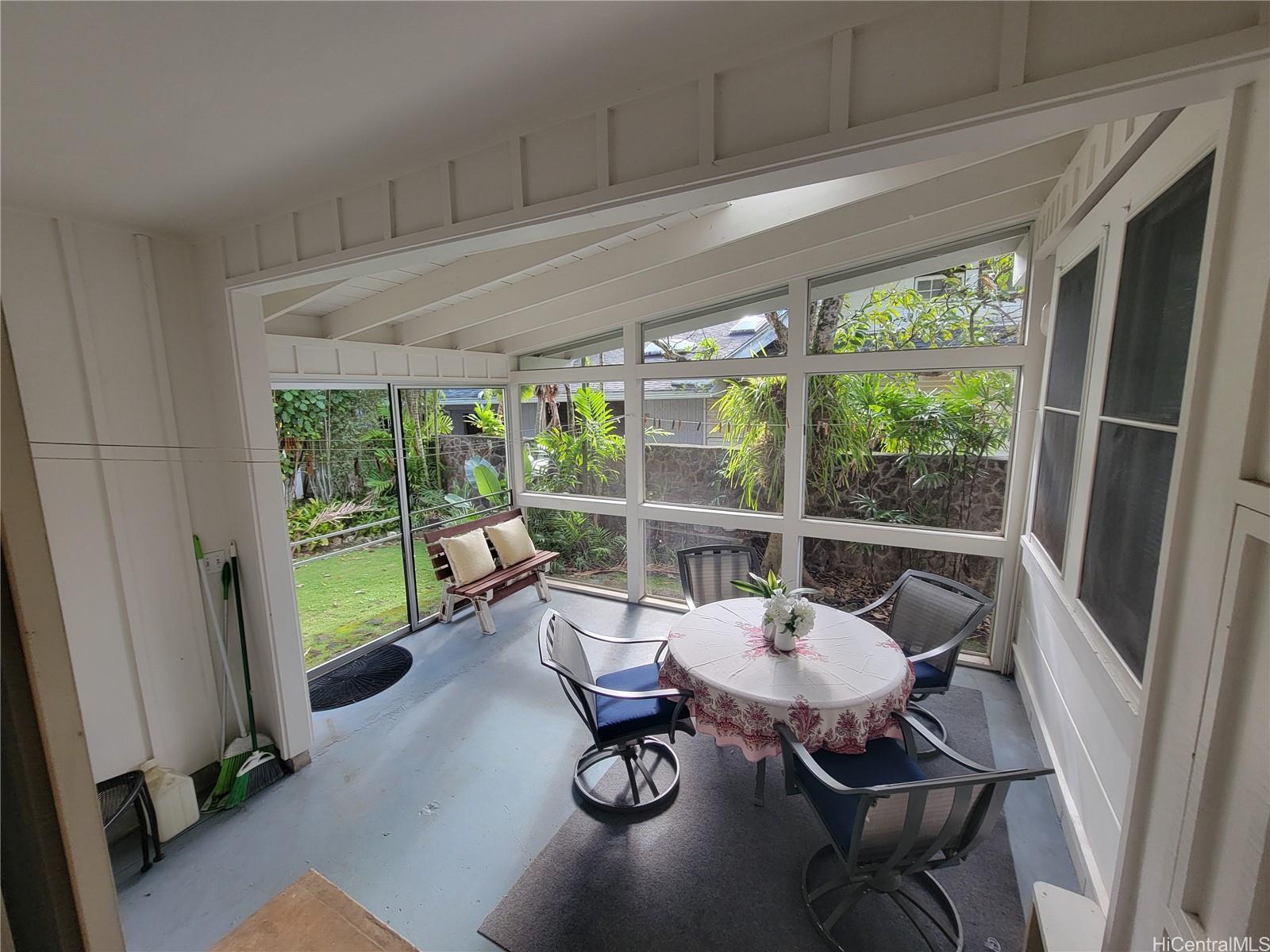 The home features a stylish open kitchen with a step-down breakfast bar, perfect for casual mornings, along with an adjacent dining area ideal for everyday meals or entertaining. Relax and unwind in the screened-in lanai, where cool Manoa breezes flow as you dine or enjoy the peaceful view of the garden backyard—an ideal space for quiet moments or gatherings with family and friends.