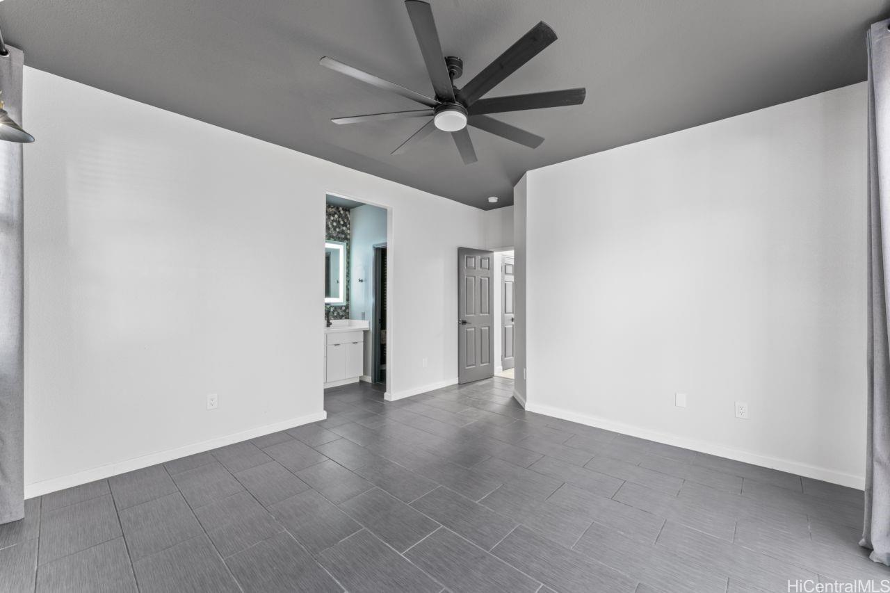 Corner lot home in the desirable Iwalani community of Kapolei. THREE PARKING STALLS!!! This property features a 2-car garage, an additional parking stall to the right of the home, and 15 owned photovoltaic panels for energy efficiency and long-term savings. The fully fenced yard offers generous outdoor space, perfect for relaxing or entertaining. Grand vaulted ceilings create a bright, open atmosphere throughout. The kitchen includes smart appliances and ample cabinetry, ideal for everyday living. Recently added split AC units provide comfort and coolness year-round. A full bedroom and bathroom on the first floor offers flexibility for guests, multi-generational living, or a home office. The primary suite also includes an updated shower bath and a custom closet with built-in organizers. Upstairs, you’ll find two additional bedrooms with built-in closets and a beautifully remodeled guest bathroom. The spacious backyard is easily accessible from both the dining area and the primary suite, creating seamless indoor-outdoor living. Ideally located near top schools, UH West Oahu, and Ka Makana Alii Mall, this desirable floor plan and prime location truly make this home a must-see.