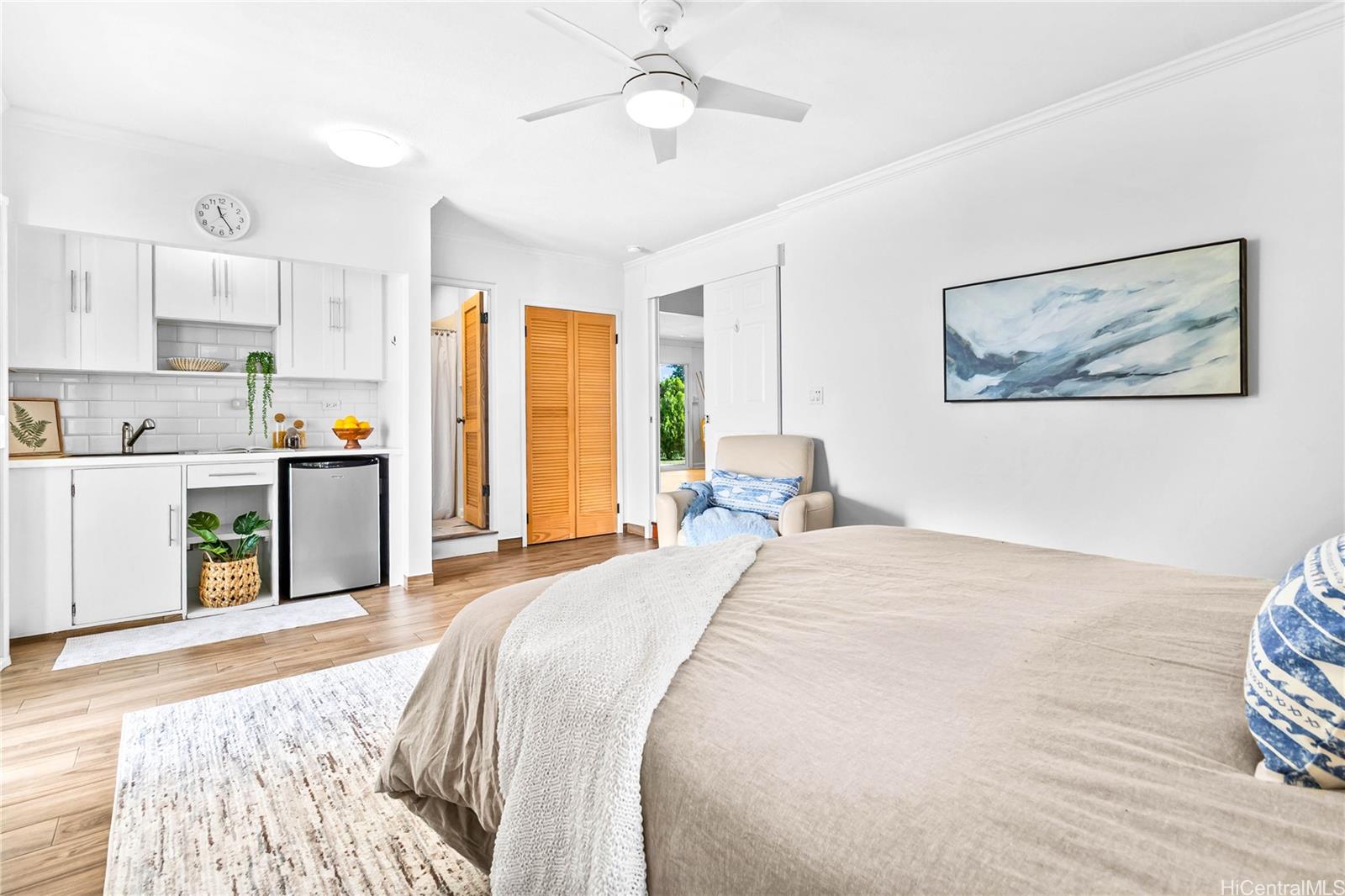 This spacious single-level home offers refined island living with exceptional indoor-outdoor flow. The main residence features 4 bedrooms and 3 bathrooms with light-filled living spaces, and tasteful finishes throughout. Designed for both everyday living and entertaining, the home opens to expansive covered quartzite lanais and a well-appointed outdoor kitchen area, ideal for hosting gatherings. The primary bedroom is a private retreat, featuring a full bath, wet bar, and its own patio with direct access to the outdoors. Set on a fully fenced lot of over 10,000 square feet, the property is complemented by lush tropical landscaping, a resort-style pool, and spa—creating a tranquil setting. A separate ADU above the garage adds versatility, offering a private entrance, kitchen, bathroom, outdoor lanai, and mountain views—well suited for extended family or guests. Additional highlights include an owned photovoltaic system, generous storage, and thoughtful indoor-outdoor connections. Located on a quiet street in desirable Kailua, just minutes from beaches, shopping, dining, and town amenities, this exceptional property blends comfort, flexibility, and island lifestyle.