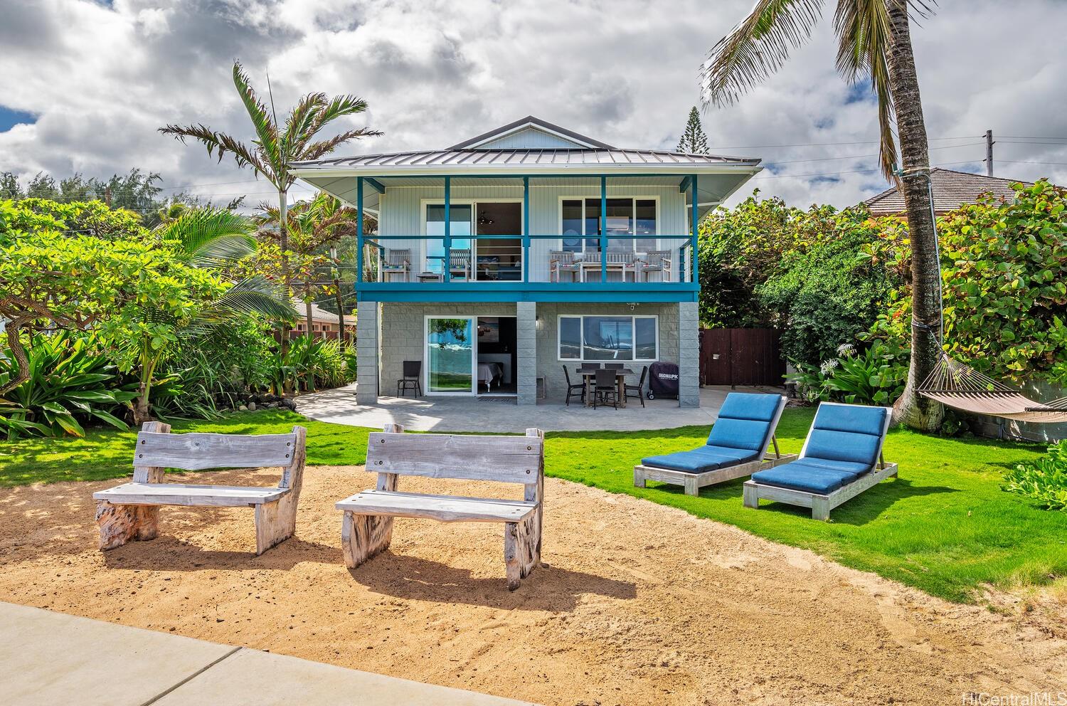 Oceanfront (occasionally beachfront) home, across from Sacred Falls in beautiful Punaluu. This immaculate home offers 4 bedrooms, 3 baths with 2 primary suites, one on the ground floor and the other on the second floor, with separate entrances. Rent the upstairs and keep the downstairs suite for yourself. Or enjoy the home and rent out the 1 bedroom downstairs for extra income. Relax and enjoy the beautiful, clear views of the beach, ocean, and Ko’olau Mountain Range. Take a stroll on the sandy beach and dip in the clear blue waters of Punaluu. This is a great beach house for snorkeling, kayaking, surfing, fishing, swimming, and or just relaxing. Punaluu is known for its beauty and slow pace of life. The home is fully decorated with beautiful art, quality furniture, kitchenware, and linens, so it's ready for you to enjoy and can be included in the sale. The area feels and looks like the coastline of Tahiti. Come live the relaxing and simple life Punaluu has to offer! The home has a sea wall with stairs allowing you ocean access and peace of mind. Paradise awaits you and your family!