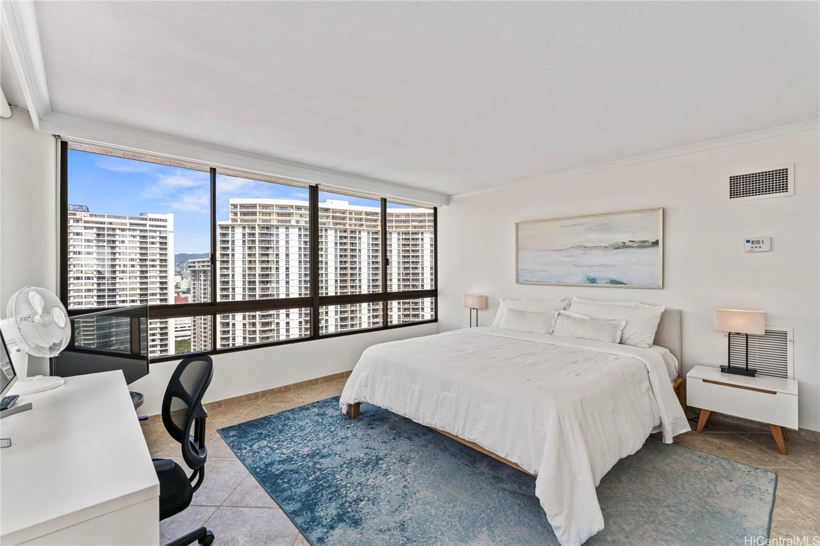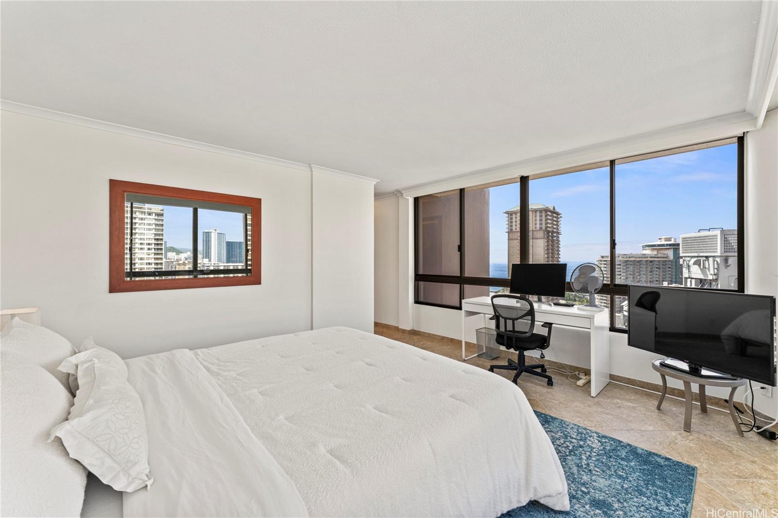 Enjoy fantastic ocean and Diamond Head views from this spacious 2-bedroom, 2-bath corner residence in a landmark building in Waikiki. This high-floor unit offers an extra-large wrap-around lanai, creating seamless indoor-outdoor living and a true “house in the sky” feel. Exquisitely remodeled, the home features quality finishes, a bright open layout, and motorized blinds for added comfort and convenience. Ideally located just minutes from world-famous beaches, dining, entertainment, and Ala Moana Shopping Center, this residence delivers the best of island living in the heart of Honolulu. Welcome to your piece of paradise.