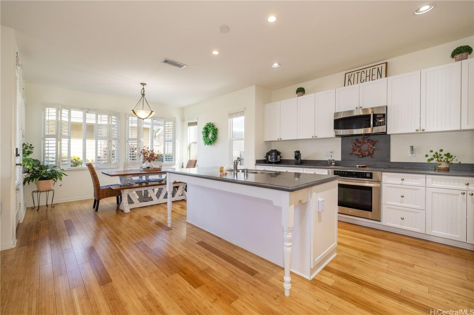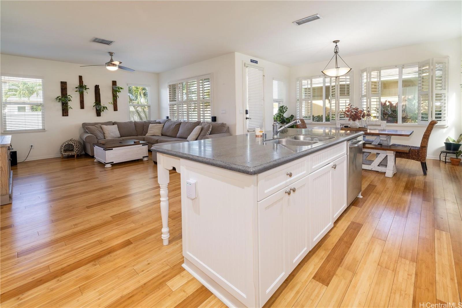 Spacious 4-bedroom, 2.5-bath home on a corner lot, featuring Berber carpeting upstairs, upgraded shaker cabinets, 42 NEW windows, plantation shutters and a large yard perfect for outdoor enjoyment. The primary suite offers an ensuite bathroom with a garden soaker tub and step-in shower. Energy-efficient photovoltaic panels help keep utility costs low. Conveniently located near shopping, Wai Kai and the esteemed Hoakalei Country Club. Monthly association fees cover essential amenities such as internet, basic cable, access to a dog park, and resort-style recreation center with tennis and pickleball courts, pool and hot tub.