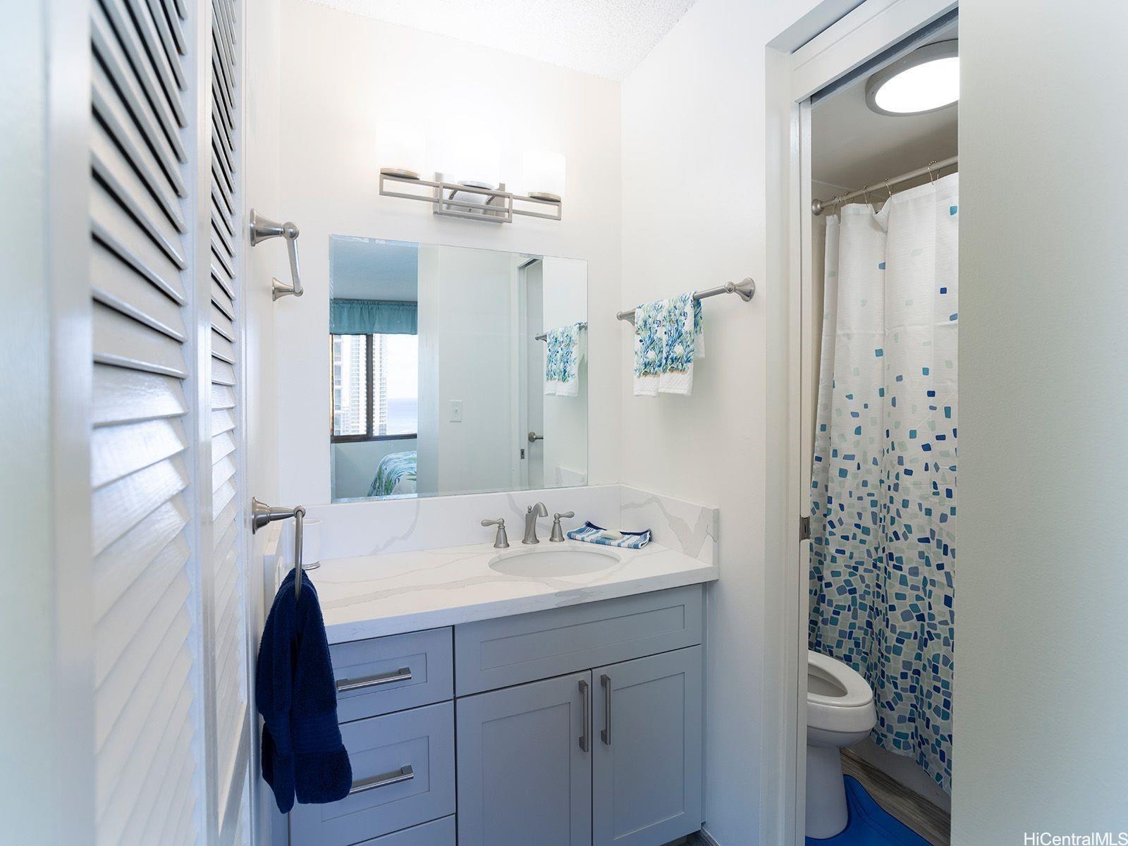 This exquisitely renovated one-bedroom, one-bath end-unit offering a serene, ocean view. This elegant home features generous closet space, custom remote-controlled blinds (Levitor) in both the bedroom and living room and new valances. Thoughtfully designed with modern finishes & exceptional attention to detail, the rare convenience of parking on the lobby level. A truly sophisticated residence also includesated retreat combining comfort, privacy, and the charm of Waikiki. Renovations were done in 2022 and included remodeling the kitchen, replacing the kitchen counters, vanity cabinet & lavatory cabinet. The linen closet was transforned to a smaller closet. There is a stainless steel full size stackable washer and dryer, new kitchen ligome renovations were done by the prior owner) Just minutes from the beach, shopping, restaurants, schools and churches. Kapi'olani Park, Ala Wai Golf Course. Bus stop is about half a block away. On the 5th floor is the pool, sauna, jacuzzi, pool deck and BBQ gas grills w/a valet kitchen. There is a doggie path on the side of the building. There is 24-hour security, a manager & great maintenance staff. Come take a look at your future home!