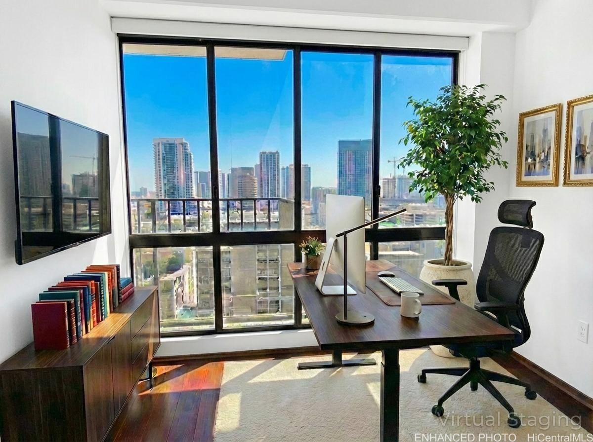 Enjoy executive living in this beautifully remodeled 2-bedroom, 2-bath residence at Harbor Square Town Tower, featuring a spacious 121 sq. ft. lanai with ocean views. This upgraded suite includes Bella Pietra travertine tile in the living area, Pergo wood flooring in both bedrooms, and custom Absolute Stone tile work in bathrooms and asbestos-free ceilings. The primary bath showcases Sapele Wood vanity with granite countertop and a custom-built Sapele bedroom closet system. The functional kitchen offers Radianz countertops, Sapele wood Cabinetry, Sub-Zero refrigeration, custom lighting, and upgraded appliances. Enjoy sweeping vistas of the Ward Village skyline, Punchbowl, Iolani Palace, and city lights. Located in the heart of Downtown Honolulu’s revitalization, you’re minutes from retail, grocery options, restaurants, banks, hospitals, HPU, Aloha Tower, and more perfect for those who want to work and play in the center of it all.