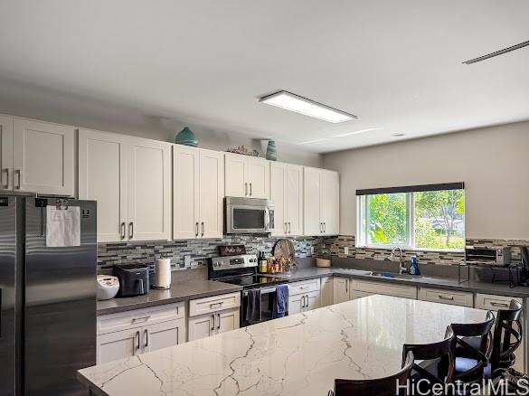 風通しの良いワヒアワに位置する、広々とした4ベッドルーム、2バスルームの一戸建て住宅です。プライベートな裏庭には、緑豊かな景色を望むパティオデッキがあります。フラッグロットCPRの敷地には私道全体が所有されており、5台以上の駐車スペースがあり、ホストやゲストに最適です。2021年築のこの住宅は、ウォークインクローゼット付きの広い主寝室、鏡付きクローゼットとプランテーションシャッター付きの広々とした寝室、そして十分な収納スペースを備えた新設のアイランドキッチンを備えています。