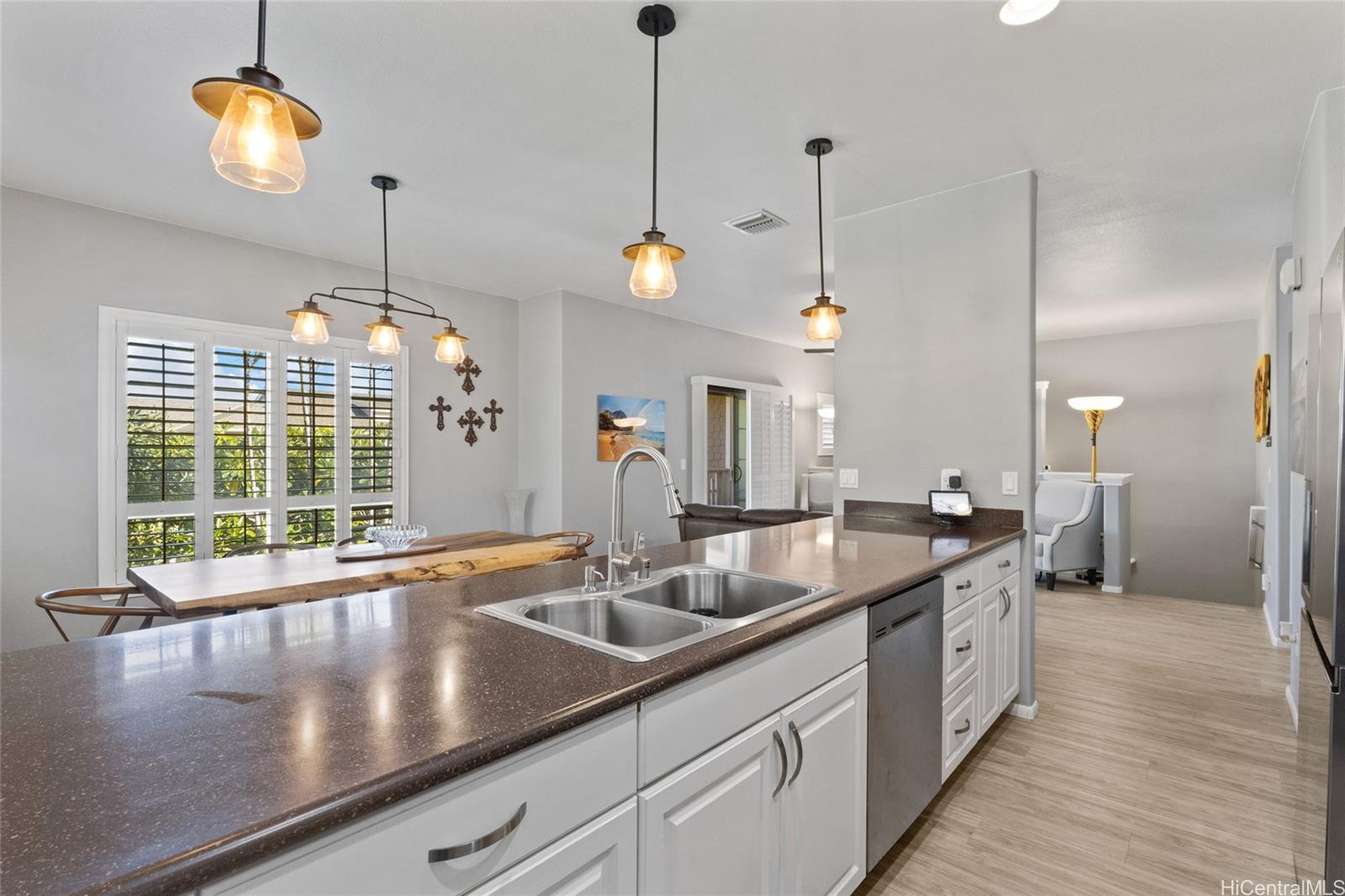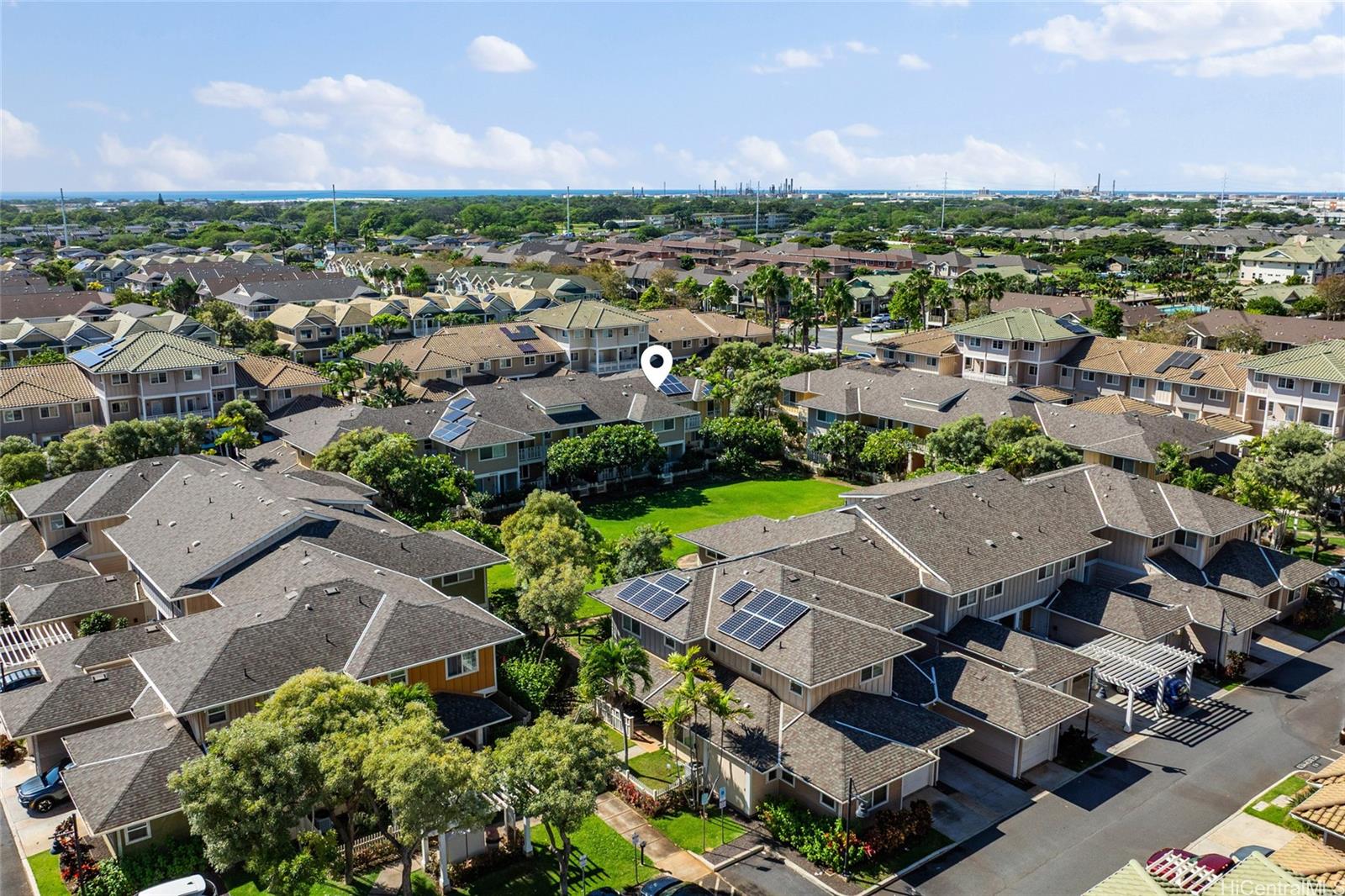 VA ASSUMABLE RATE AT 2.875%! Welcome to Nanala at Mehana! This 2 bedroom, 2 bathroom townhome is located in a prime location in Kapolei. Stepping inside, it immediately feels like home. You have a dedicated dining space, large kitchen with ample storage, and a spacious living area. This home features brand new ceiling fans, window shutters, and new LVP flooring throughout. Step outside your living area to a spacious lanai, perfect for enjoying the beautiful weather. With 2 bedrooms and 2 full bathrooms, you have a dedicated space for guests. Both bedrooms are equipped with custom closets and plenty of storage space. This home has been well kept and comes with a new water heater, microwave, Nest Thermostat, new toilets, leased Tesla solar panels, and automatic water shut-off detection. Outside in the front yard, enjoy new artificial turf and a patio with plenty of space for pets, kids, or BBQs. You are within minutes of Costco, Kapolei Commons, and plenty of restaurants and other shopping and activities.