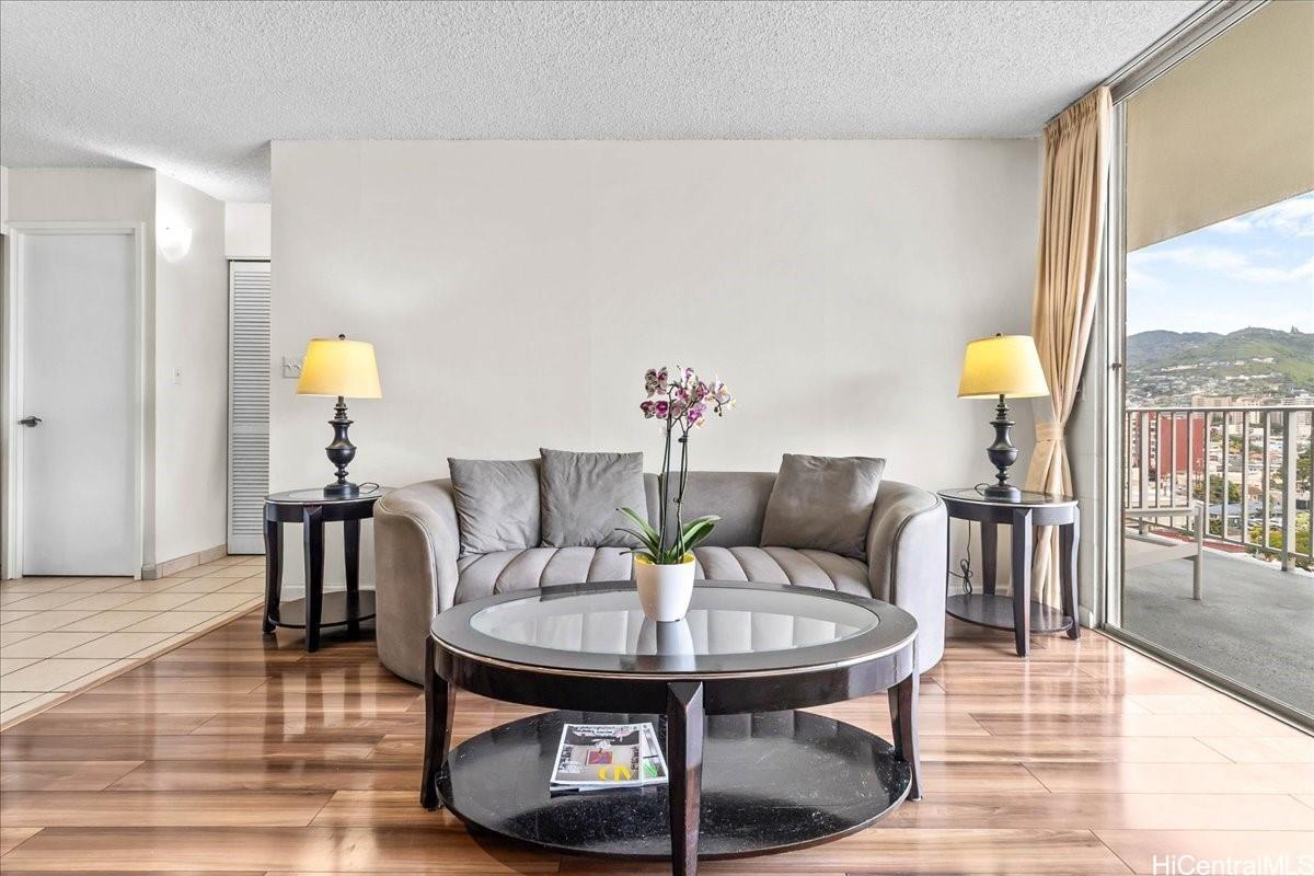 Spacious 1-bedroom 1-bath corner end unit with storage. Gorgeous wood flooring. Plus, an expansive 182 sf lanai to enjoy the cool, refreshing mountain breeze. The unit offers beautiful city and mountain views, a newly renovated bathroom (2024), in-unit washer and dryer and 1-covered full-size parking in a secure garage. Amenities include: rooftop pool and deck with spectacular ocean and city views, sauna, and BBQ area, and tennis court. On-site resident manager. Conveniently located next to the Hawaii Convention Center and Waikiki and bus lines. This unit is in a prime location, just minutes from Ala Moana Shopping Center, Don Quijote, Palama Market, Ala Moana Beach Park, the vibrant new neighborhood of Kakaako / Ward Village, and much more! The monthly maintenance fee includes hot water, internet, cable, gas, sewer, common area expenses, plus the upcoming fire sprinkler system installation.
