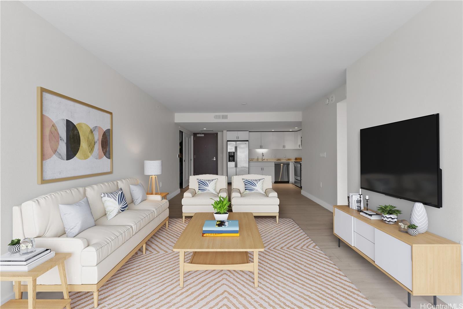 Best value at Symphony Honolulu! Rarely available 2-bedroom, 2-bath residence with 1 covered parking, offered under 900K This well-maintained home features a practical open floor plan with fresh interior paint, brand new carpet, vinyl flooring, split AC, and in-unit washer and dryer. Floor-to-ceiling windows bring in abundant natural light and frame beautiful city and mountain views. Pet-friendly building.