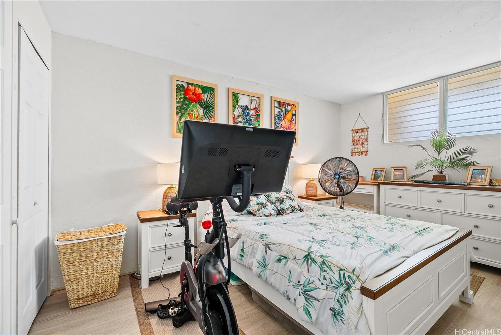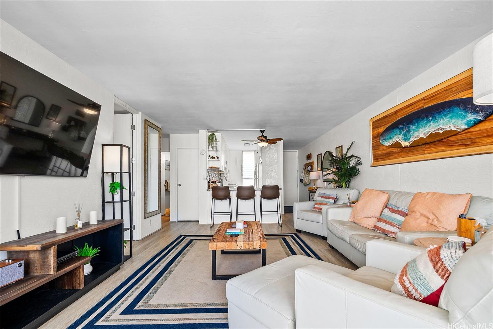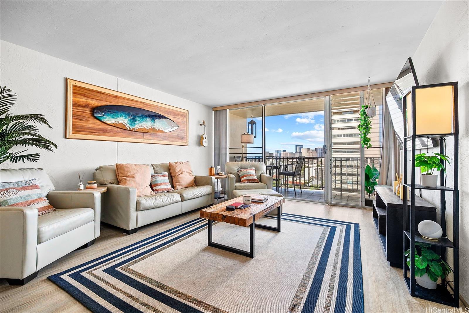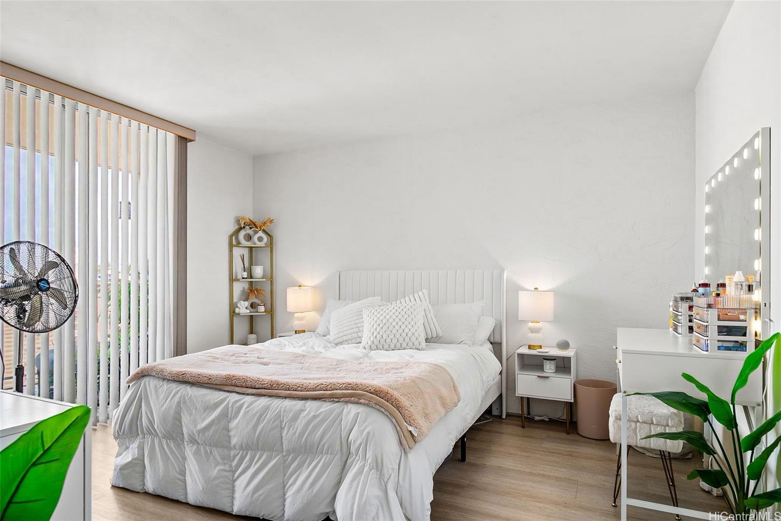 Recently upgraded furnished condo like a model home. Beautiful, tall white kitchen cabinets, nice appliances - including washer (new)/dryer in unit and dishwasher. Neutral decor and new luxury vinyl plank flooring. Enjoy the amazing 15th floor views of the mountains, Honolulu, and the Pacific. The covered lanai is the width of the condo with relaxation area and outdoor dining. Great value. It is a leasehold property and the lease expires in 2049. Everything is included! Curated local artwork, lovely leather living room furniture, beach essentials (chairs, umbrellas, snorkel gear). To access building there is a key entry, then a key entry to elevator area (both have call box for guest access). Programmable keyless entry for your front door. Wall mounted televisions. Check out the LED vanity mirrors in the bathroom and primary bedroom vanity. Building allows units to be rented, but the shortest term lease is 12 months. Perfect investment property - close to beach, easy access to H1, bases, hospitals. Also, an affordable way to buy Hawaii real estate as a primary or secondary home. Public OPEN HOUSE Sunday, Feb 22nd 1-4:00