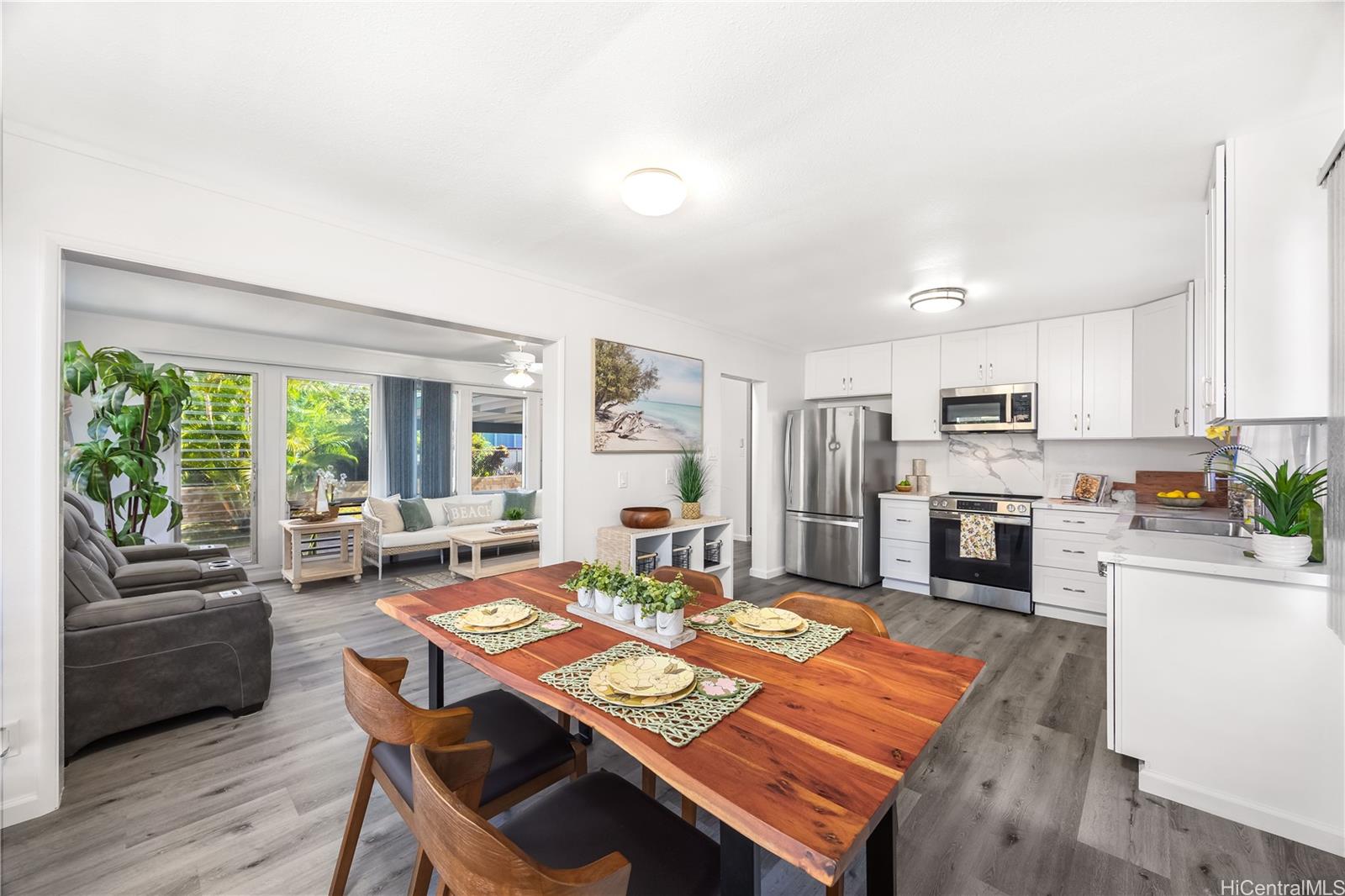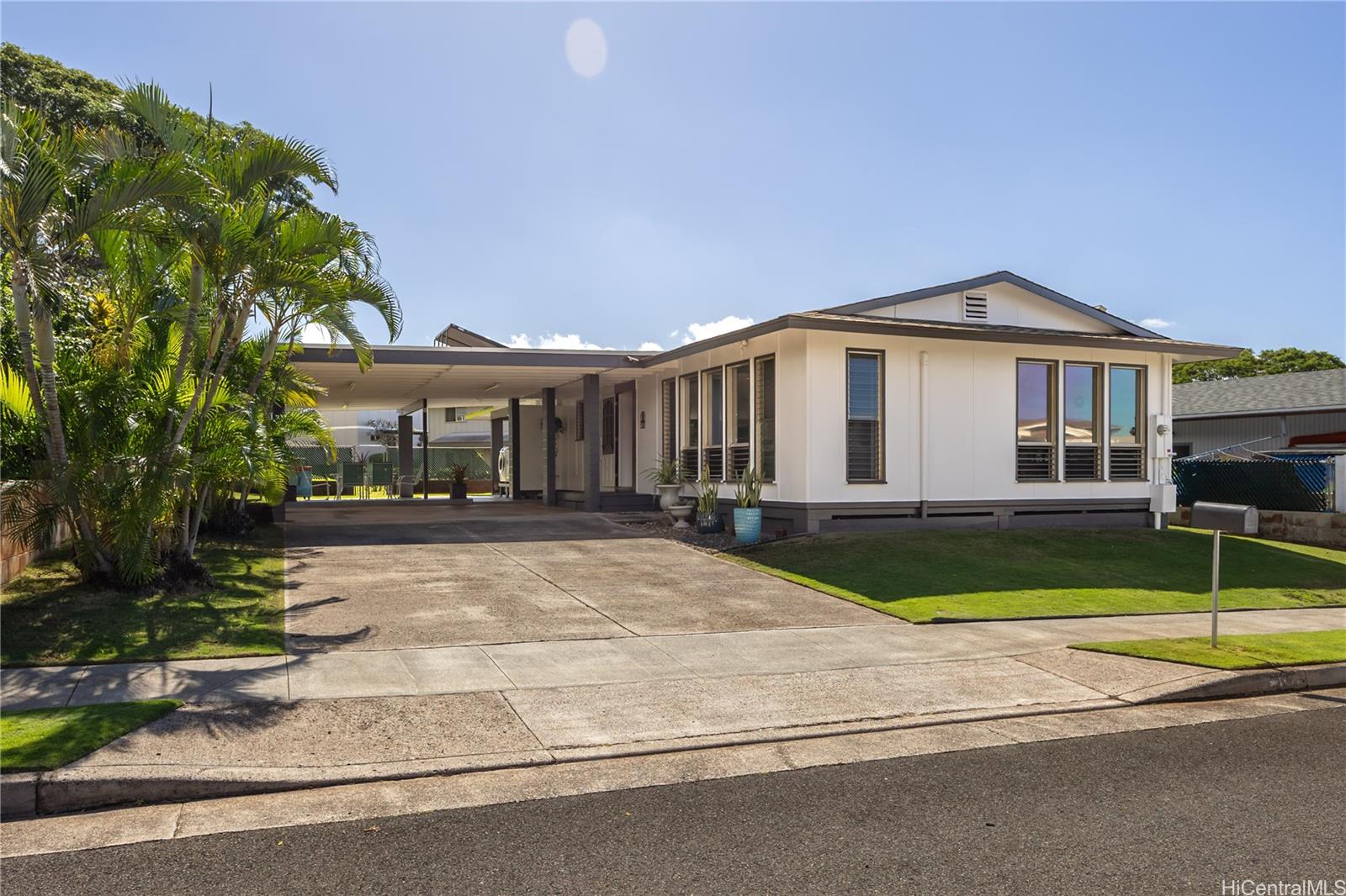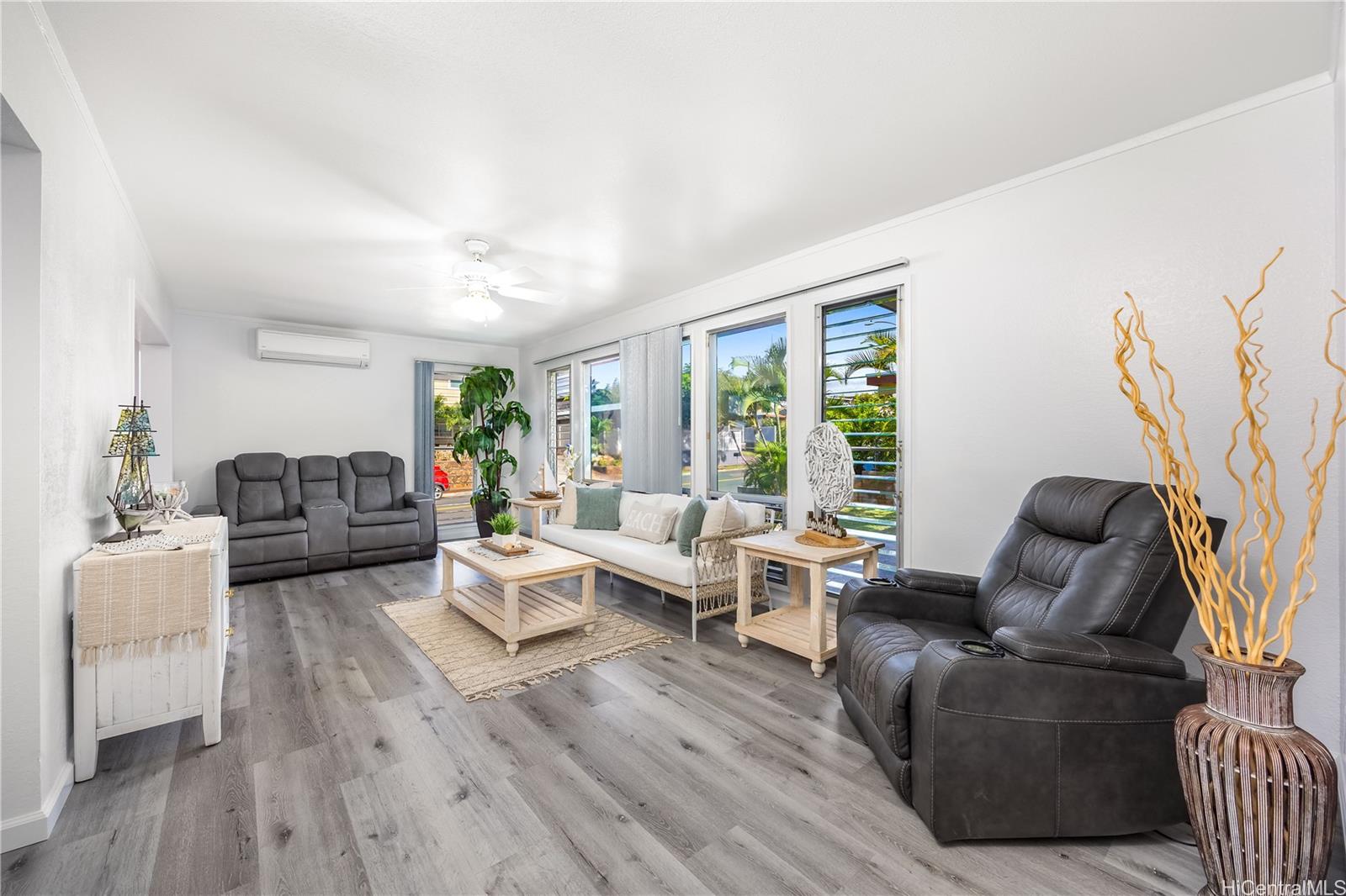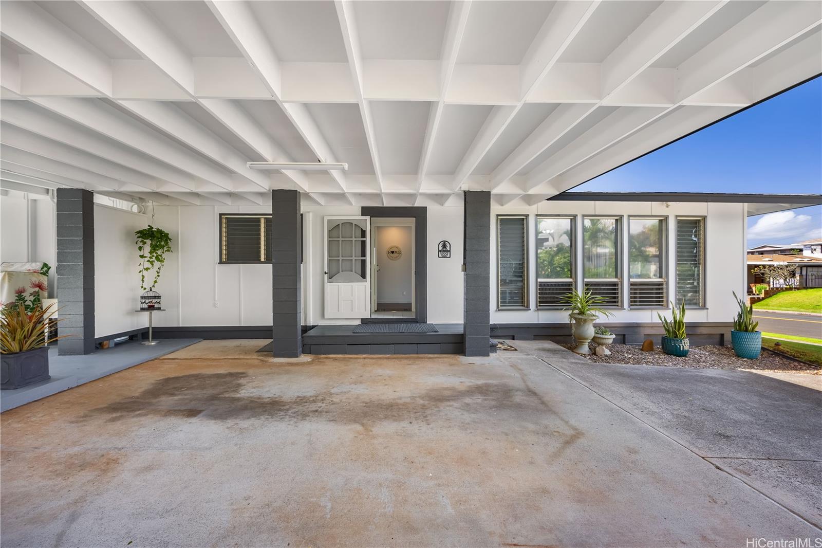 Rarely available 5-bedroom, 2-bath home centrally located in desirable Pearl City with quick and easy access to H-1, H-2 and H-3. This beautiful home radiates island charm. Completely renovated from top to bottom showcasing modern design, style and comfort. Step inside to a bright living experience beaming with natural light, brand-new interior and exterior paint and stylish luxury flooring. Featuring a fully upgraded kitchen with sleek countertops, custom cabinets and brand-new dishwasher, microwave hood and range oven. Both bathrooms have been transformed into spa-like retreats with premium features including rainfall shower heads and elegantly designed tiled showers. Stay cool with split AC units throughout. Drastically lower utility bills with 17-OWNED PV panels (NEM) and a solar water heater system. Enjoy relaxing or entertaining in the large covered patio, carport and outdoor areas. Great community in a prime location near shopping, dining, parks and recreation center. A true must-see!