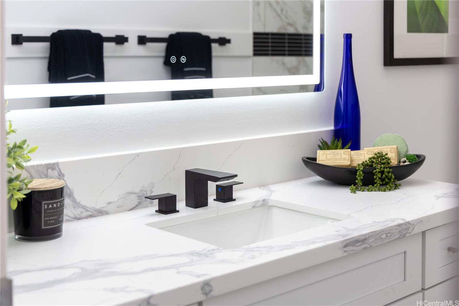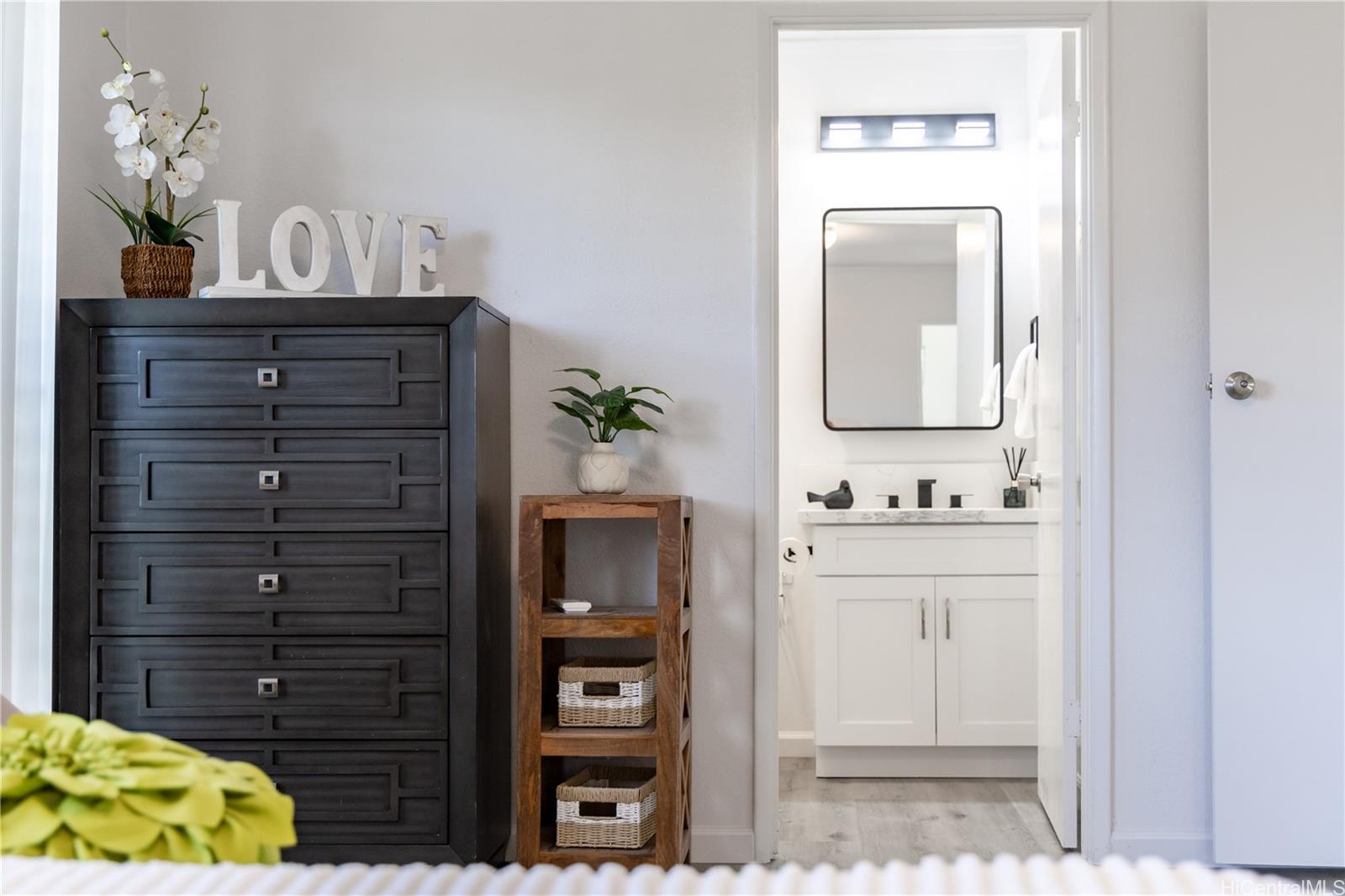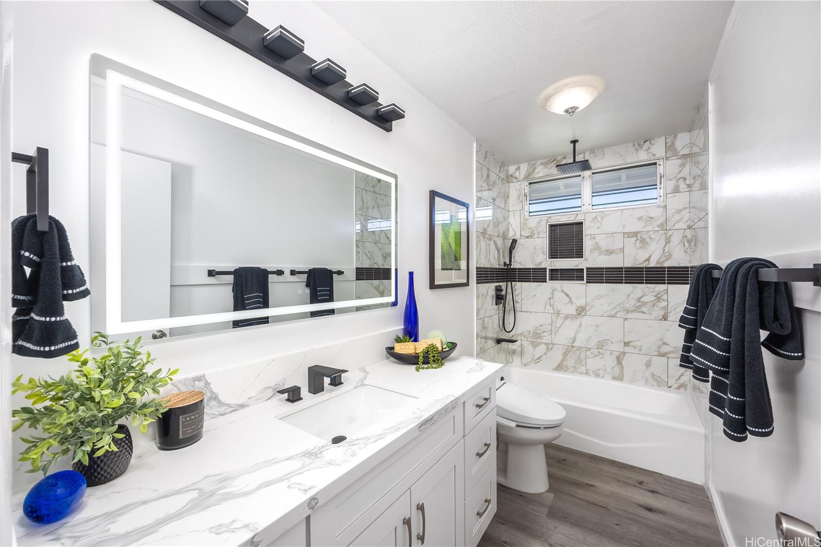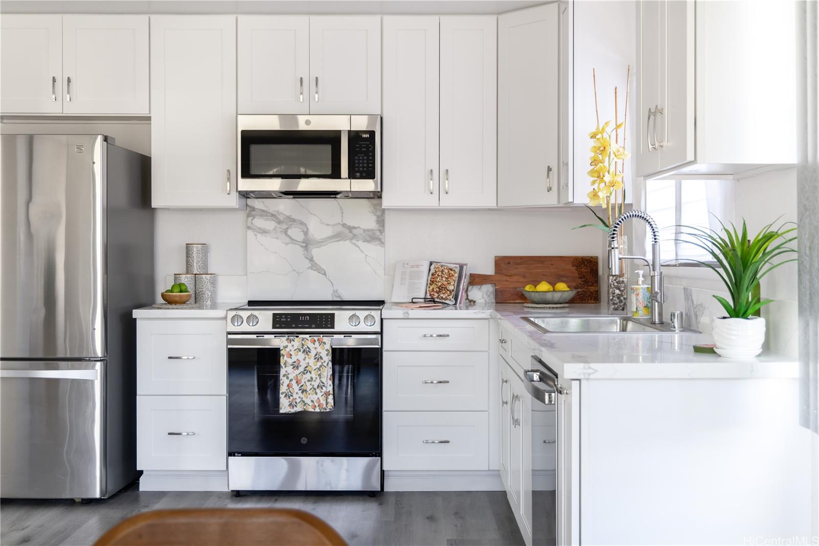 Rarely available 5-bedroom, 2-bath home centrally located in desirable Pearl City with quick and easy access to H-1, H-2 and H-3. This beautiful home radiates island charm. Completely renovated from top to bottom showcasing modern design, style and comfort. Step inside to a bright living experience beaming with natural light, brand-new interior and exterior paint and stylish luxury flooring. Featuring a fully upgraded kitchen with sleek countertops, custom cabinets and brand-new dishwasher, microwave hood and range oven. Both bathrooms have been transformed into spa-like retreats with premium features including rainfall shower heads and elegantly designed tiled showers. Stay cool with split AC units throughout. Drastically lower utility bills with 17-OWNED PV panels (NEM) and a solar water heater system. Enjoy relaxing or entertaining in the large covered patio, carport and outdoor areas. Great community in a prime location near shopping, dining, parks and recreation center. A true must-see!