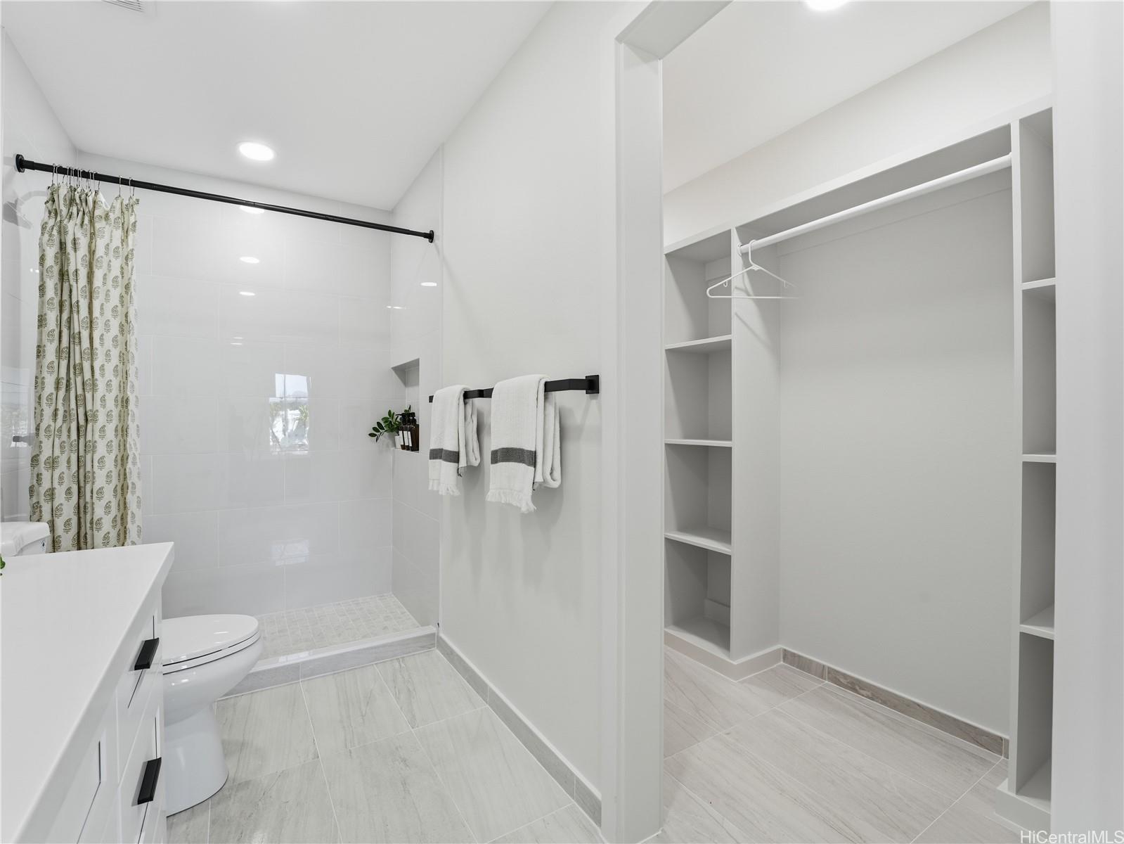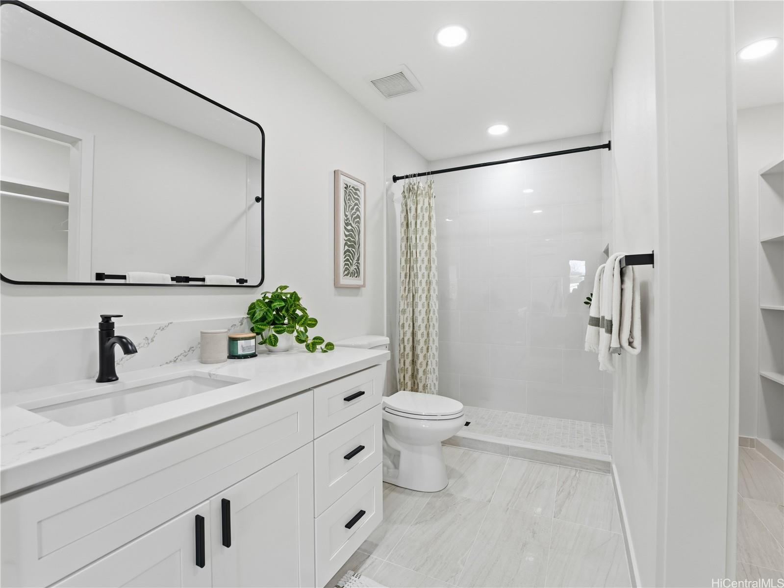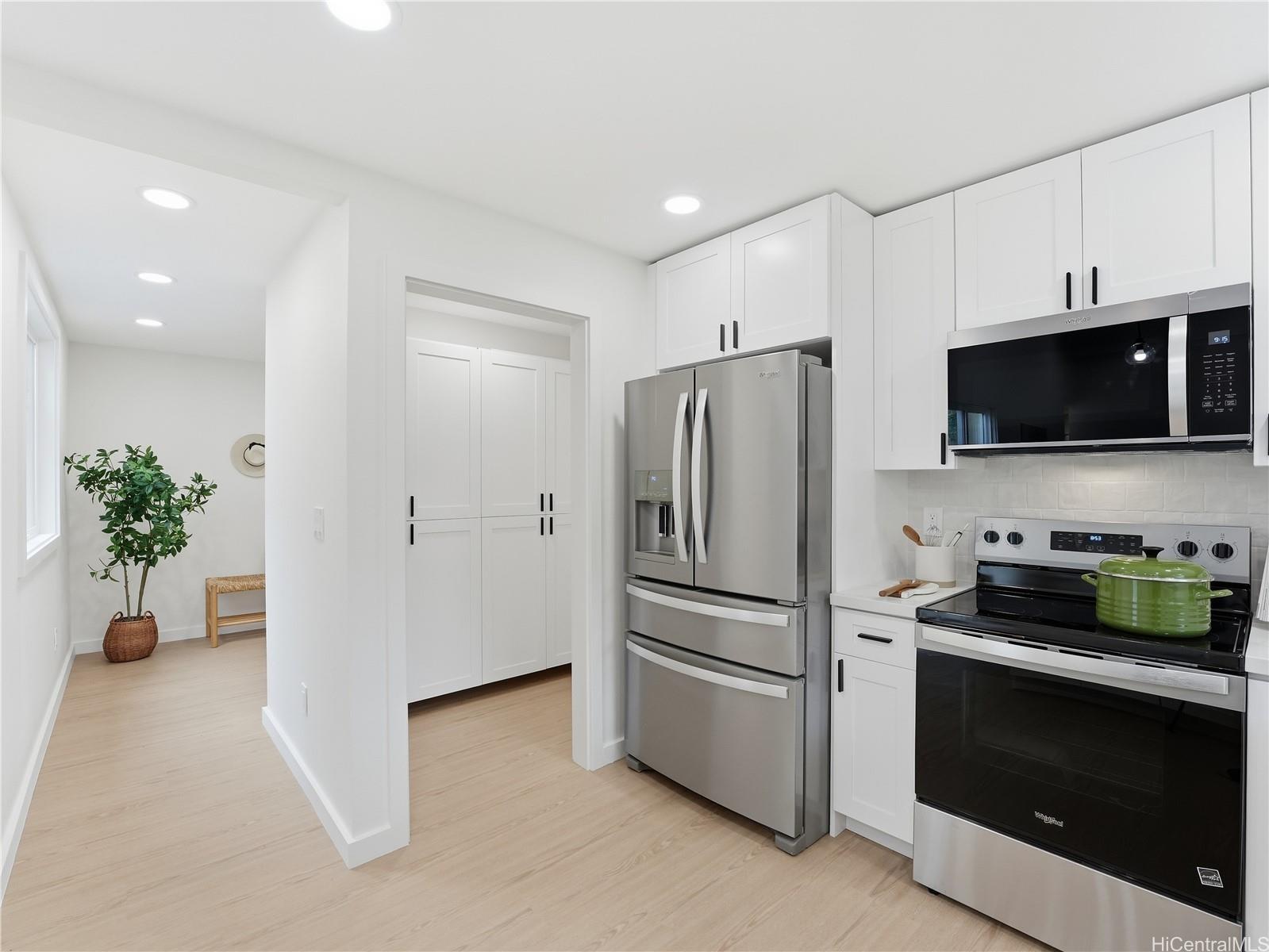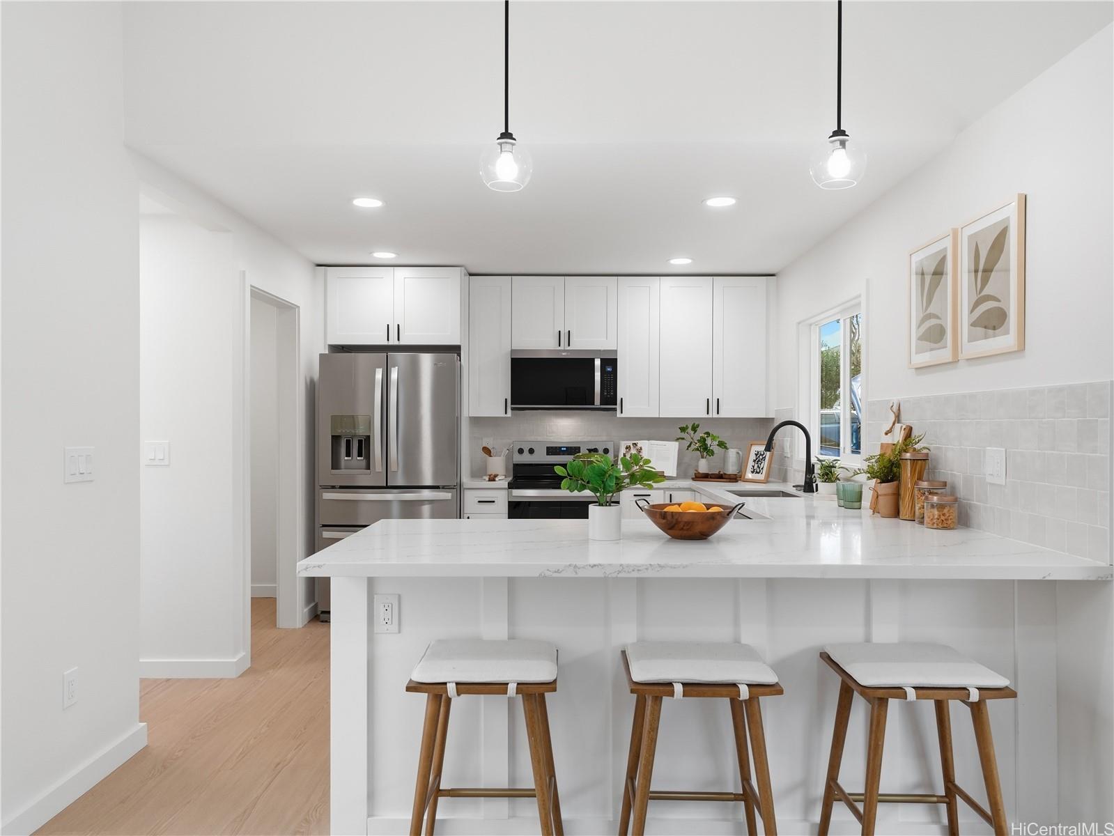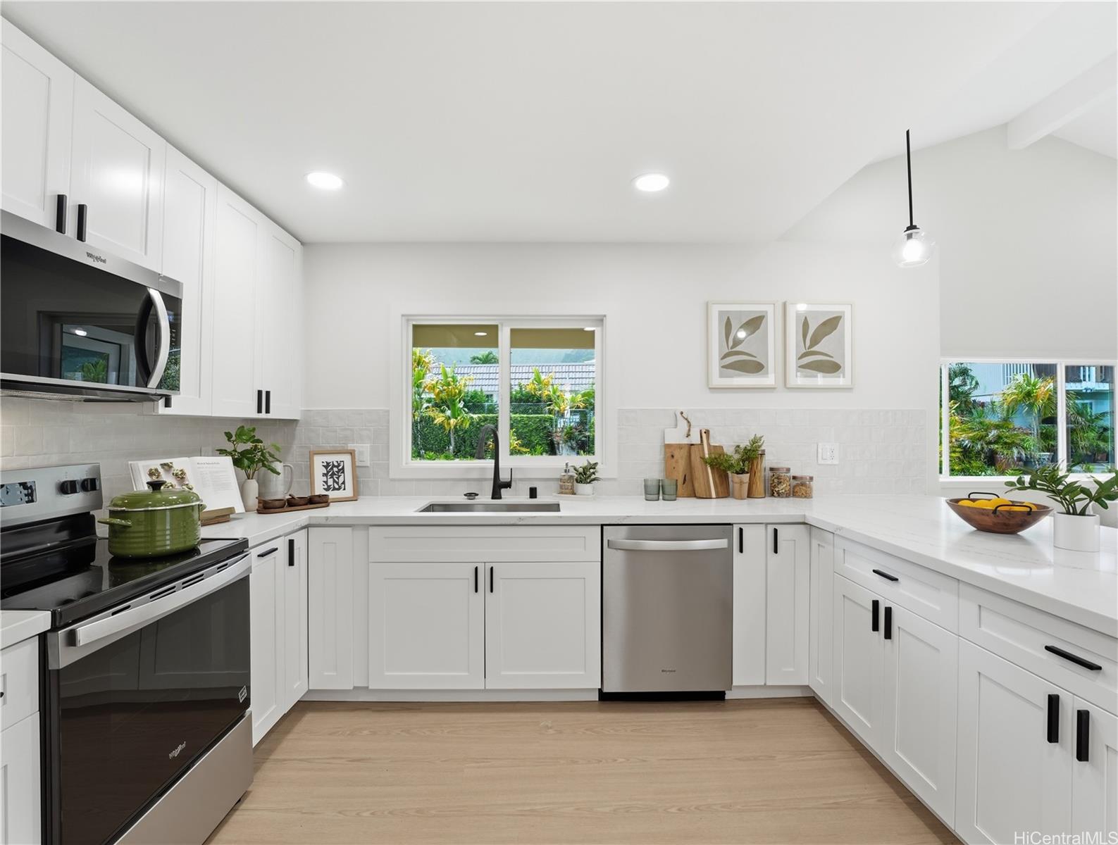 Soaring A-frame ceilings enhance the open living, dining, & kitchen spaces with natural light. Oversized double-pane windows frame lush mauka backdrops from nearly every room. A quartz peninsula with seating for four anchors the kitchen, paired with new stainless steel appliances and a generous walk-in pantry.