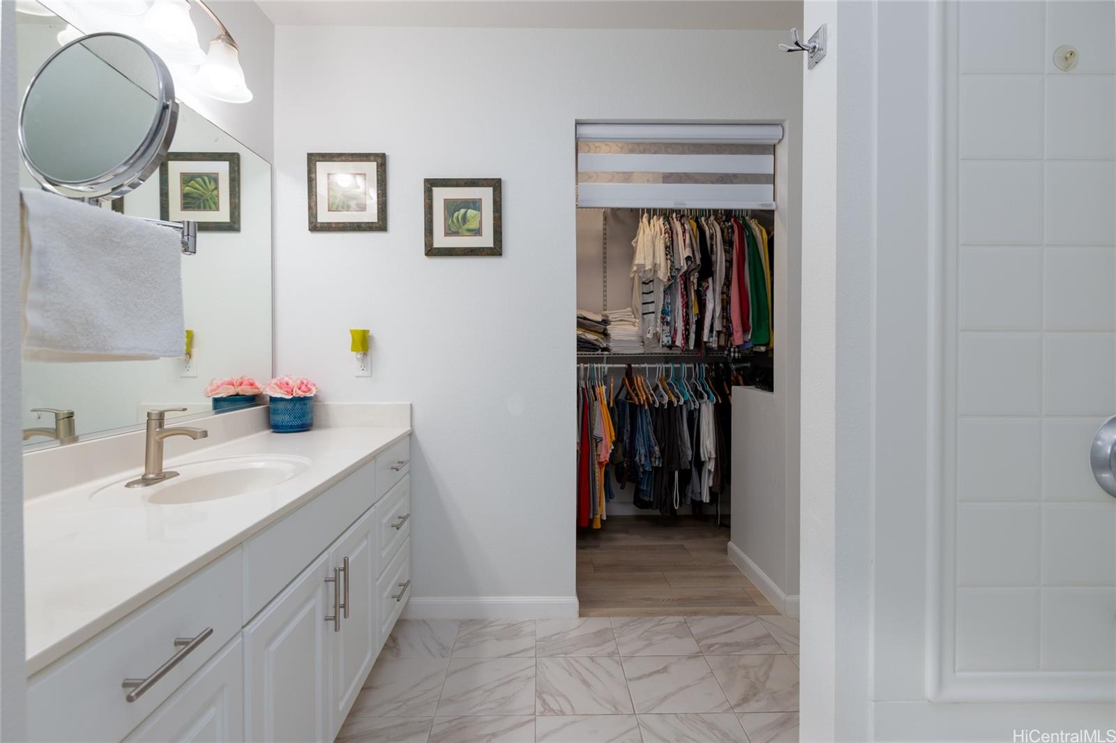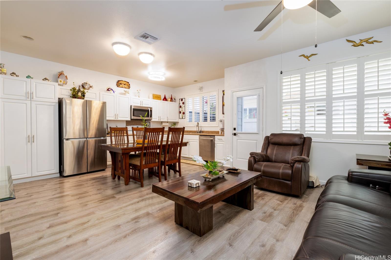 Thoughtfully upgraded with elegant plantation shutters, modern vinyl plank flooring and an extra third parking space for added flexibility. This home is equipped with 21 owned solar panels for energy savings for the new homeowner to enjoy. Conveniently located near guest parking and just minutes from Laulani Village Shopping Center for shopping, banking, dining and daily essentials for comfort and efficiency. Must see to appreciate!