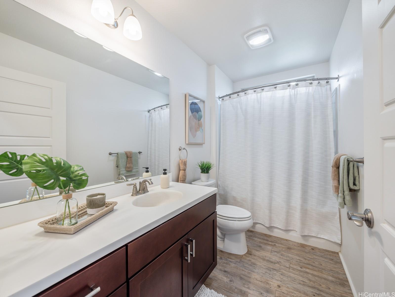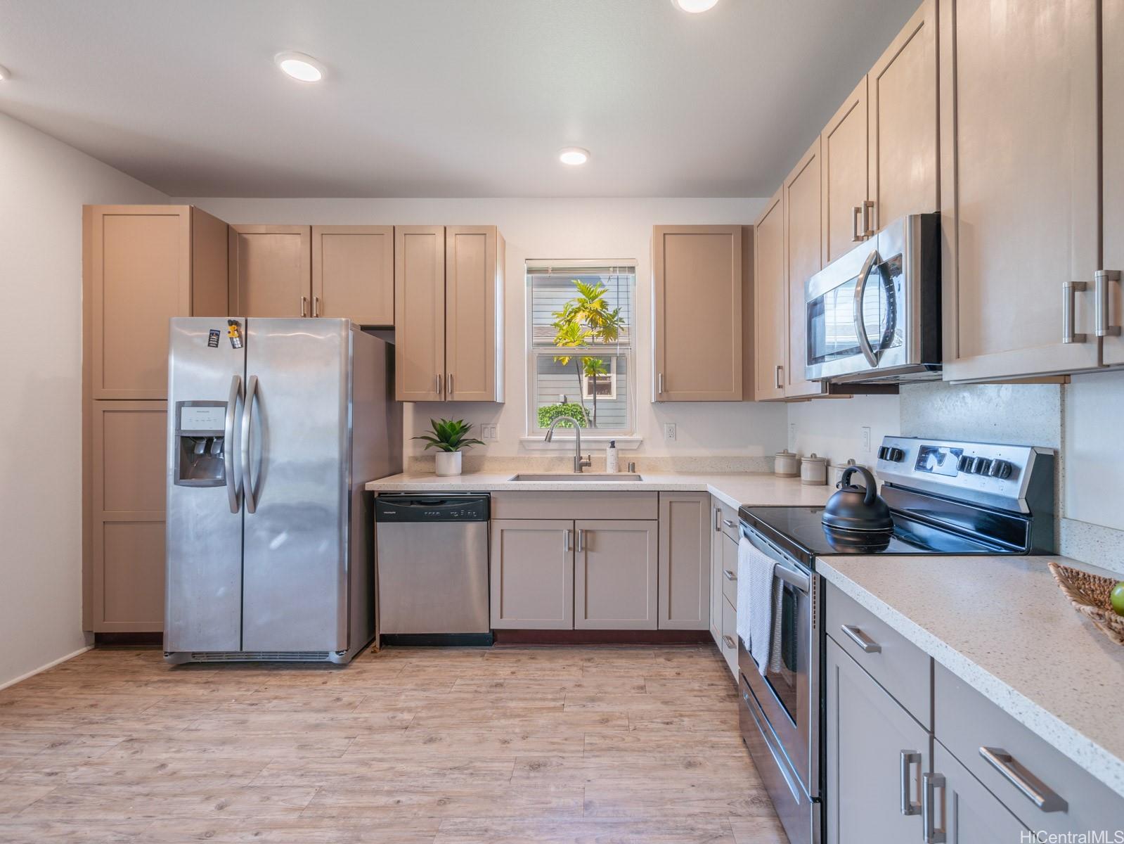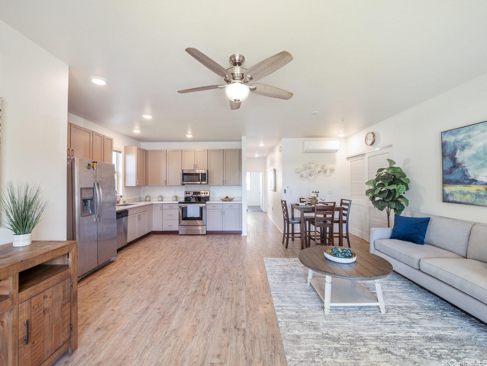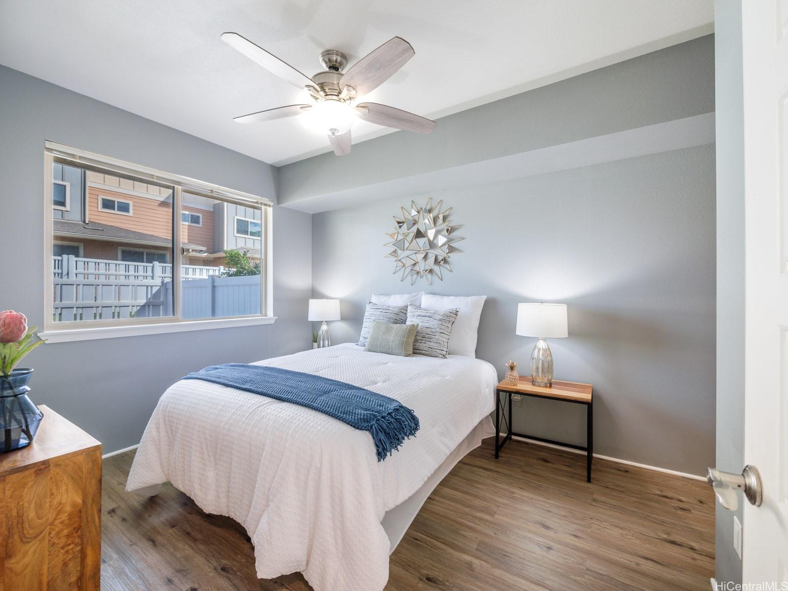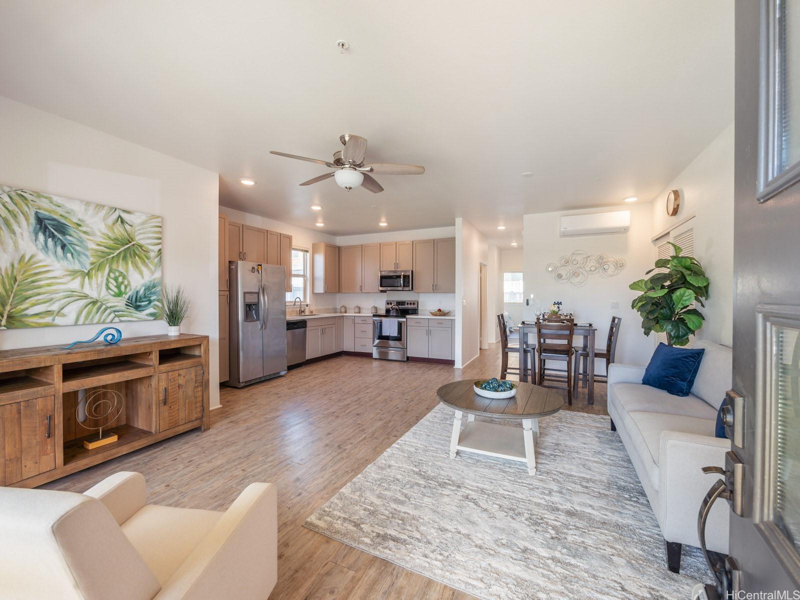 Welcome to this charming 2-bedroom 2-bath single level townhome nestled in a vibrant community of Ho'opili. The open floor plan seamlessly connects the living room, dining, and kitchen areas providing an ideal layout for both relaxation and entertaining. The well appointed kitchen features modern appliances, plenty of counter space and ample storage making meal preparation a breeze. Retreat to the spacious primary bedroom complete with a private en-suite bathroom and walk-in closet for added convenience and privacy. The second bedroom offers flexibility for guests, a home office, or whatever suits your lifestyle needs. Outside, you will find your own private fenced in yard, a perfect place for your furry friend or fun kids play space. All this just minutes away from all conveniences such as a rail, UH West campus, Ka Makana Ali’i mall, stores, restaurants, beach and so much more. Come see it today!
