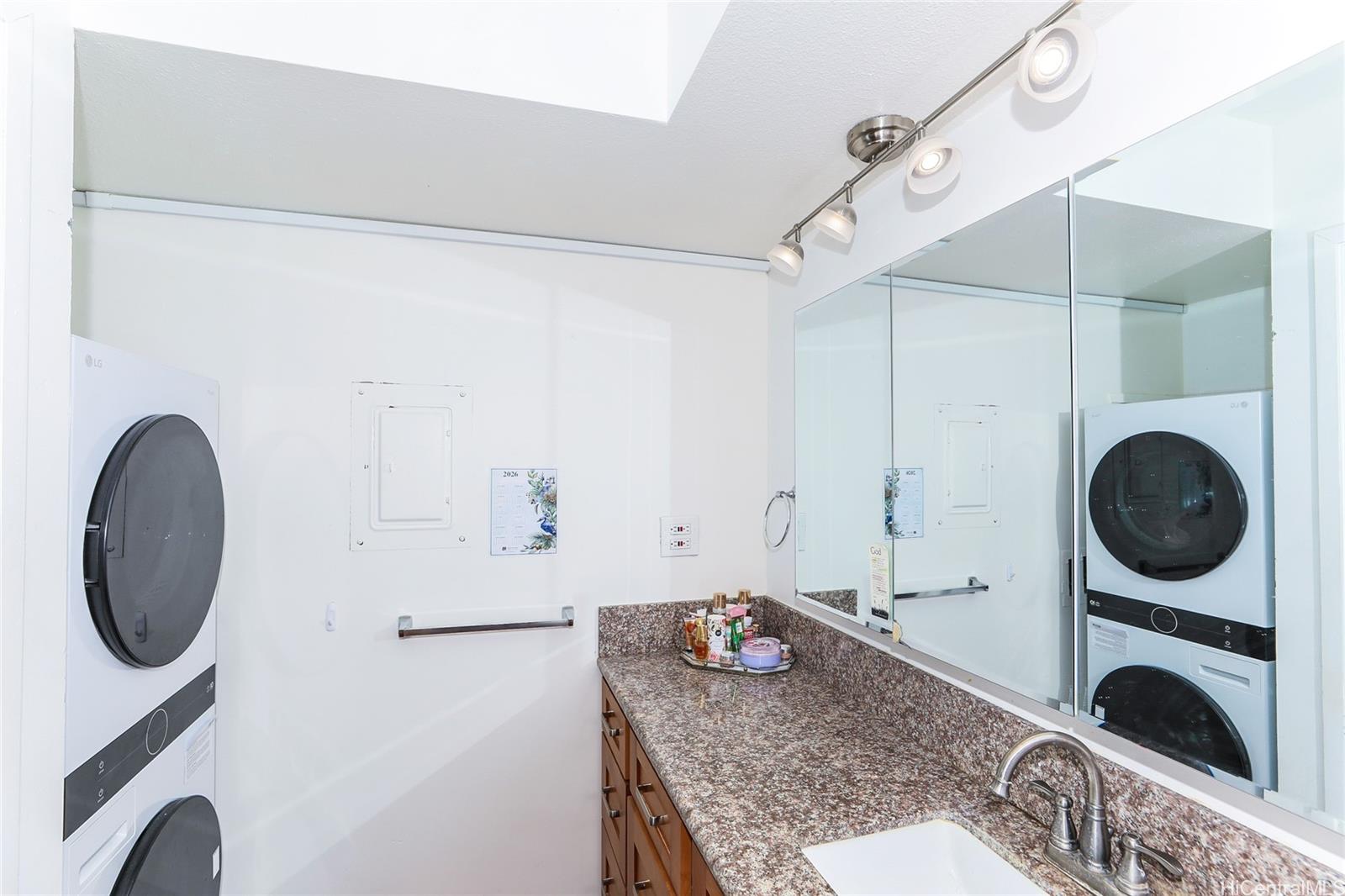 Unit 1307 is move-in ready and features brand-new stacked washer and dryer—an uncommon convenience in Waikiki—along with window A/C, luxury vinyl tile flooring, and quartz countertops in both the kitchen and bathroom. The upgraded walk-in tiled shower with built-in seating adds a modern, comfortable touch.