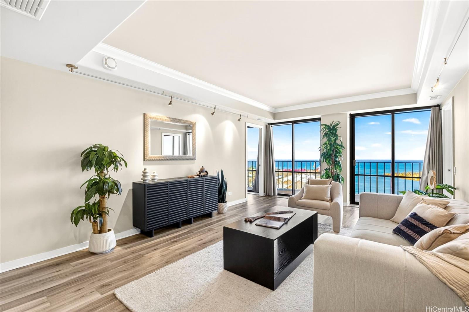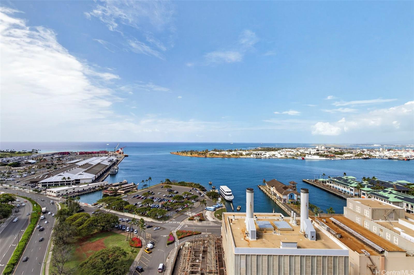 Wake up and wind down to panoramic ocean vistas that truly define island living. This well-maintained residence features vinyl flooring throughout and travertine tile in the bathroom for a clean and timeless finish. The living room is enhanced by showcase wall lighting and a recessed ceiling, creating a warm and elegant ambiance. The kitchen includes granite countertops, stainless steel appliances, and a wine chiller. Central air conditioning provides year-round comfort. The maintenance fee includes electricity, cable, internet, water, sewer, and refuse, offering exceptional value and convenience. One covered parking stall included. Harbor Square offers a sixth-floor recreation deck with pool and BBQ area. Located near restaurants, shops, businesses, and Downtown Honolulu.