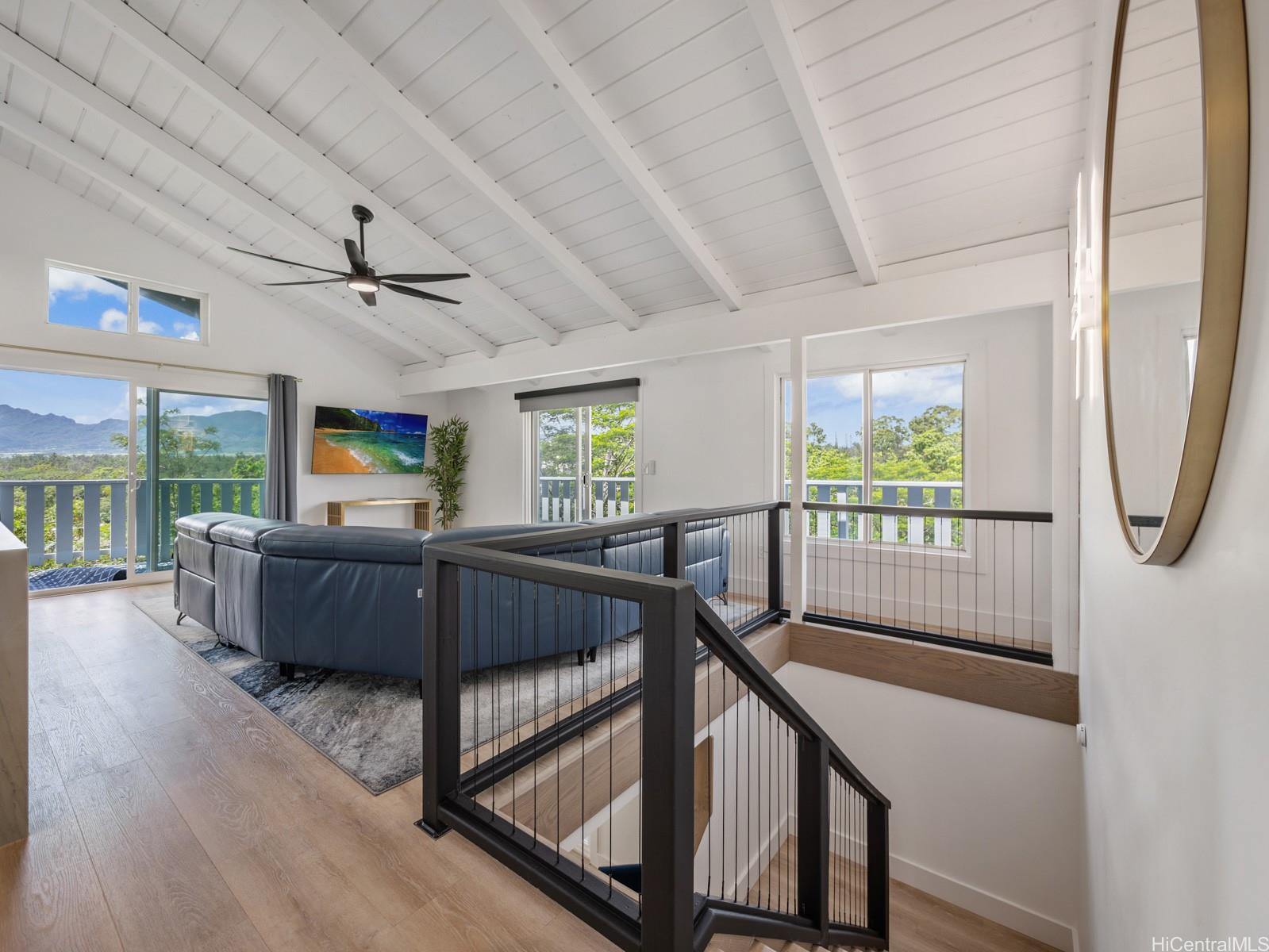 Vaulted ceilings create a bright, open feel in the main living areas, while the fully renovated kitchen features quartz countertops, brand-new appliances, custom cabinetry, and smart lighting. The primary suite opens directly to a wraparound lanai, where panoramic valley views become part of your everyday routine.