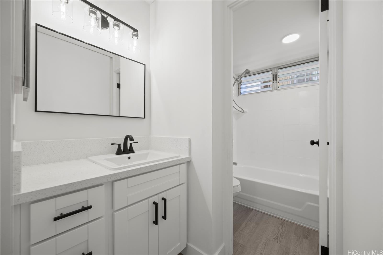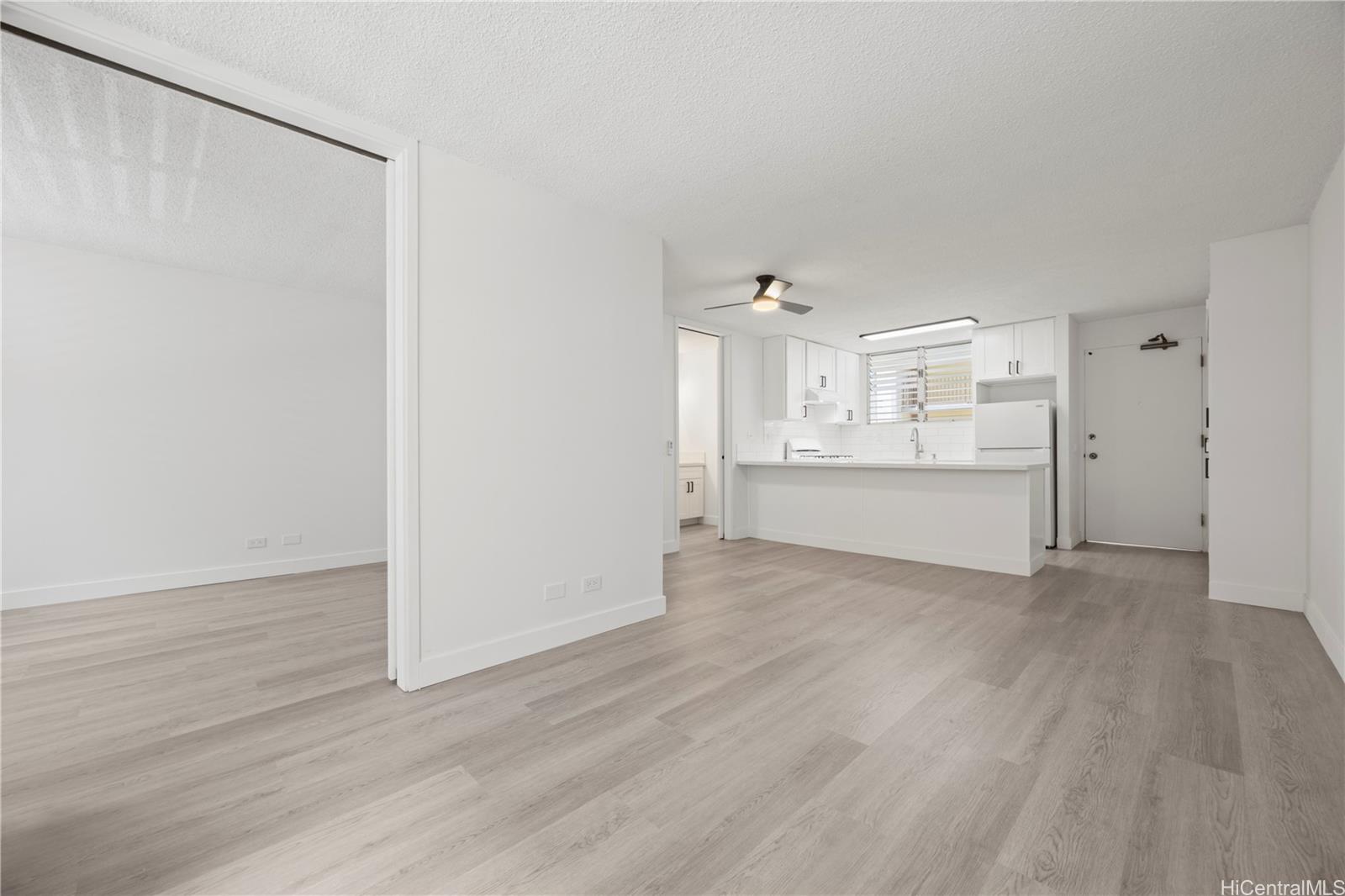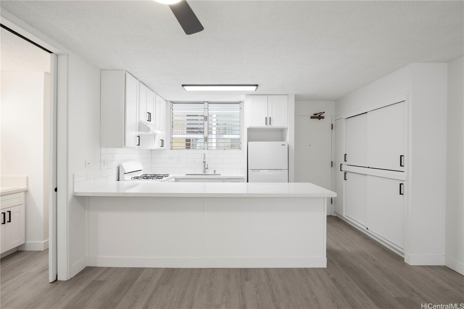 Newly renovated condominium in a prime location in the heart of Honolulu! This move-in ready unit features a brand-new kitchen with quartz countertops, modern cabinetry, and new appliances. Enjoy luxury vinyl flooring throughout, providing both style and durability, along with air conditioning for year-round comfort. The bathroom has been tastefully updated with a new vanity and contemporary finishes.
