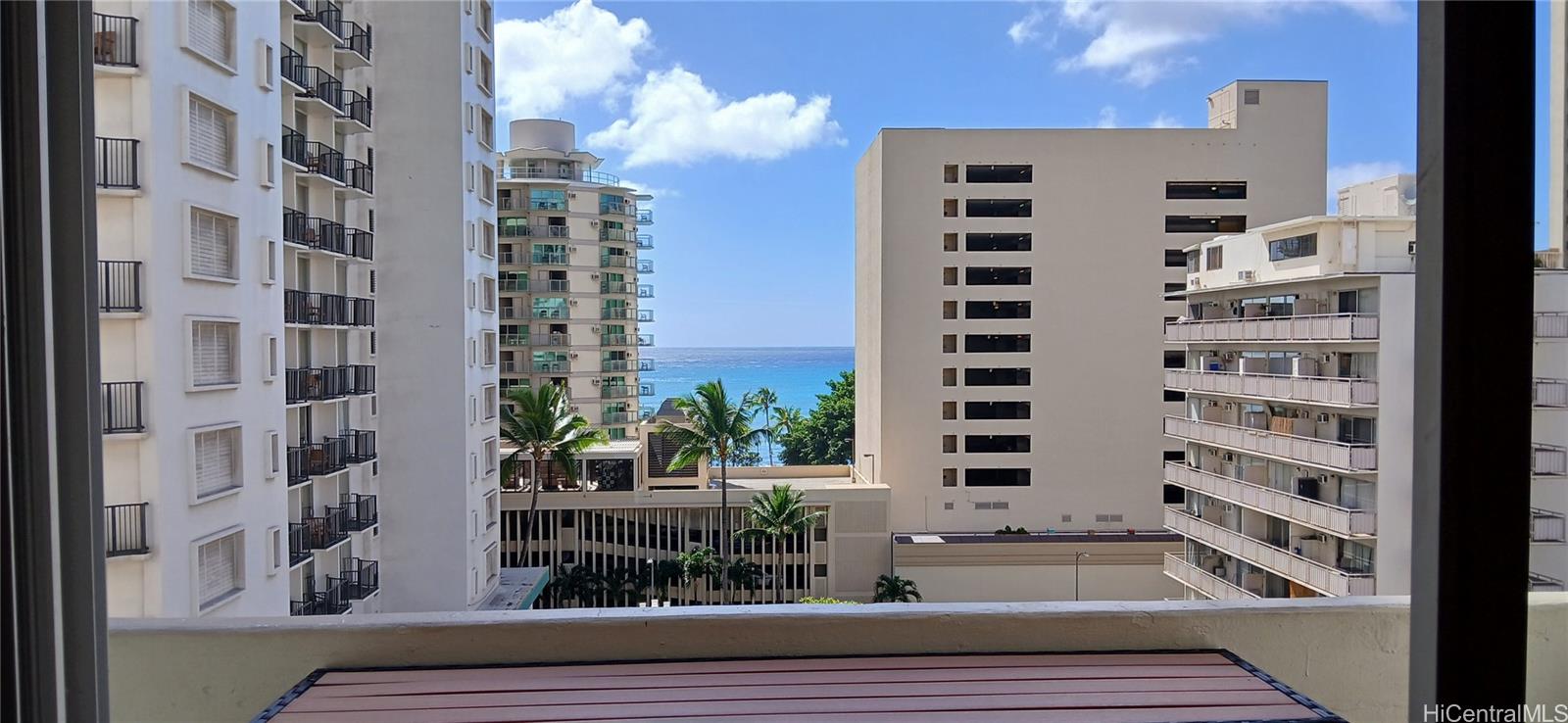 NEW PRICE - OCEAN VIEW with fresh Interior paint, re-sanded Bamboo flooring, New Bed & Chairs, AC & 3pc Lanai Bar Top set too. Only 2 short blocks to famous Waikiki Beach & Duke's statue makes a great short-term rental! Close to everything Waikiki has to offer: shopping, dining, parks, zoo & more. Close to bus line and public parking garage (prepaid) is available in the basement for hourly or up to 24 hours parking. Kuhio Village completed spalling and building exterior paint project in 2021 and lobby renovations 2023-2025 which include FOB system, 64-channel security camera system, sign-in kiosk, and key vault system. Kuhio Village has on-site security from 4pm to 6am daily and on-site building AOAO office, surfboard rack and bike rack rentals also. The new laundry room is coming soon. 2026 Maintenance Fee $645.68 includes Electric, Water / Sewer, Hot Water, Cable TV, Internet, Security & onsite management; Special Assessment of $75.33 monthly through Dec 2027. Kuhio Village is zoned Resort Mixed-use which allows for daily rentals (or less than 30 day rentals) legally without an NUC. Great Opportunity to have a legal short-term rental property or a studio to call home.