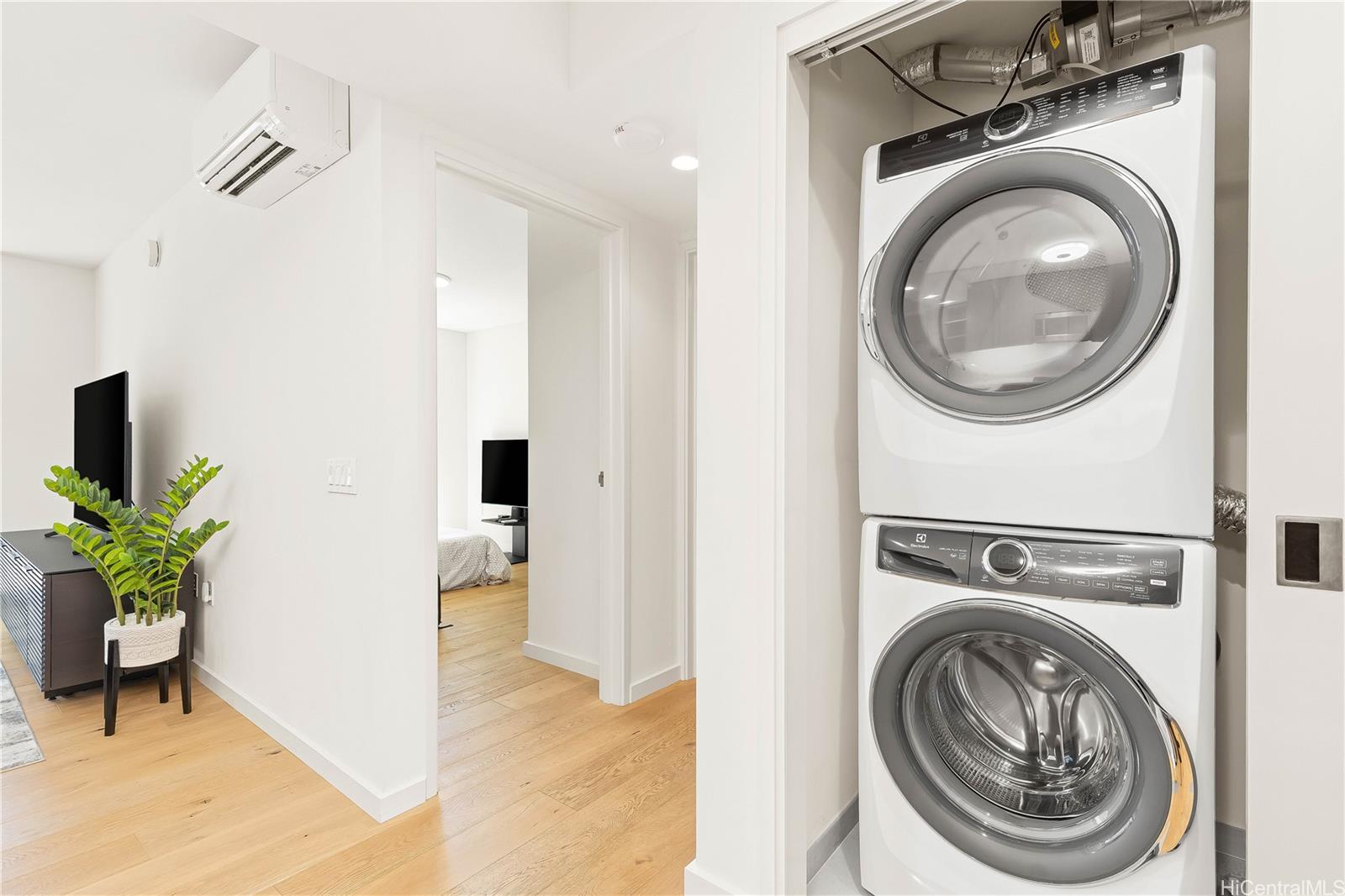 This upgraded residence at Sky Ala Moana West features quality finishes and thoughtful improvements throughout. Quality upgrades include engineered white oak wood flooring, upgraded kitchen and laundry appliance packages, Toto Neorest bidet toilet, California Closet system, and Hunter Douglas roller screen shades. Additional storage provides added convenience. The spacious 99 sf lanai offers ocean views and is perfect for relaxing. Residents enjoy a wide range of resort-style amenities including two pools, a fitness center, spa, BBQ cabanas, dog park, children's play area and multiple private rooms for meetings or celebrations. Conveniently located near Ala Moana Center, dining, shopping and beautiful beaches. The building allows 30-day minimum rental, offering additional flexibility for owners. Furnishings available for purchase separately. *One or more photos have been enhanced.*