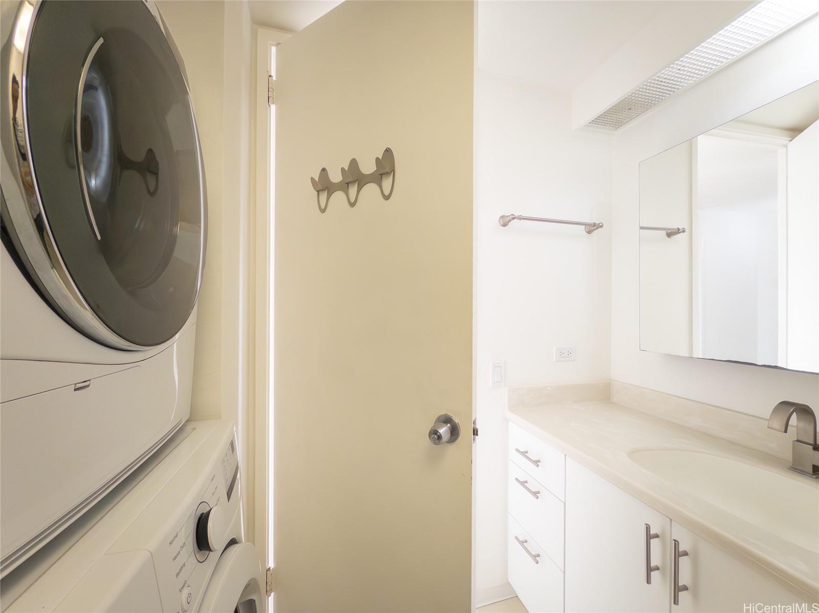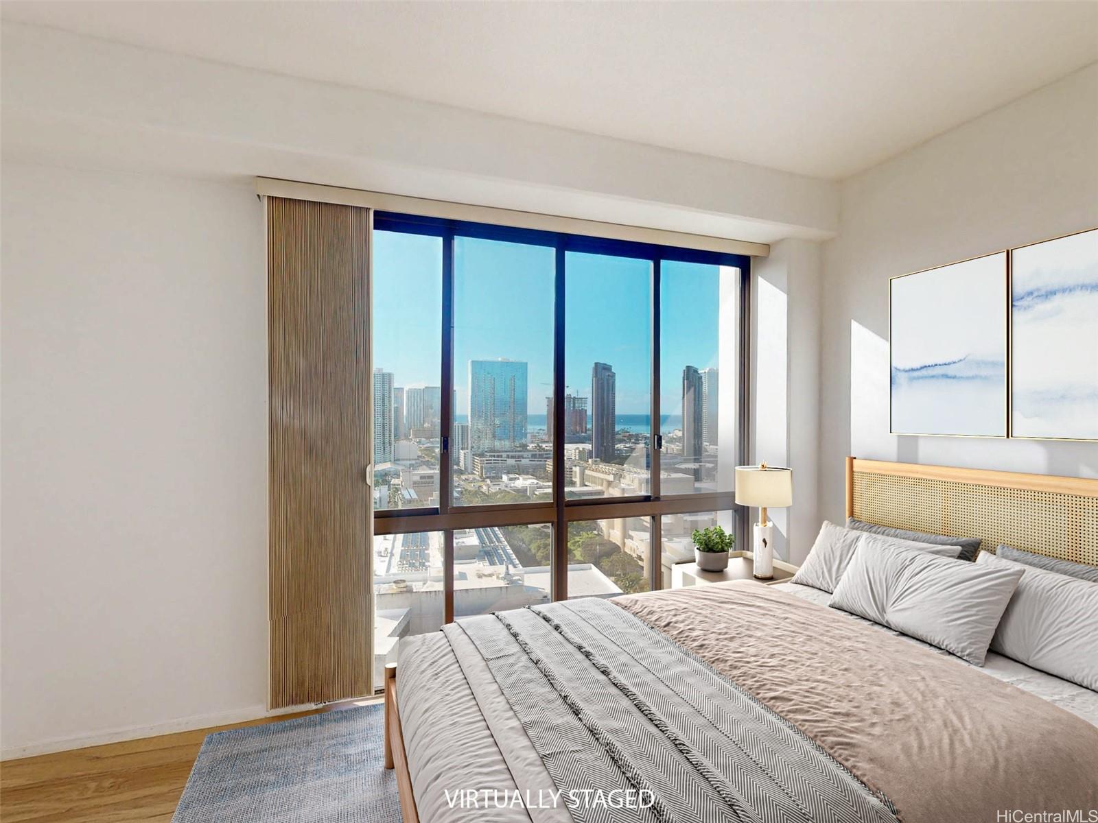 ALL UTILITIES INCLUDED. This 2-bedroom, 2-bath corner residence at Harbor Square offers ocean and mountain views in the heart of Downtown Honolulu. Recent updates include stainless steel kitchen appliances, central A/C with Smart Thermostat, a new in-unit washer and dryer, primary bath renovation and updated luxury vinyl plank flooring. The functional layout provides comfortable living for socializing or a quiet retreat. It comes with a covered end parking stall and 24/7 security. Maintenance fees INCLUDES electricity, water, sewer, cable, and internet. Enjoy spending time on the recently updated pool deck with ocean views, use of the convenient surfboard and paddle board storage, and a warm-welcoming secured lobby area. Conveniently located within walking distance of the waterfront, Iolani Palace, Aloha Tower, Kaka'ako, and a variety of dining and retail options. Ala Moana Beach Park is approximately one mile away. For qualified VA buyers, a VA assumable loan at 2.25% may be available, subject to lender approval and eligibility requirements.