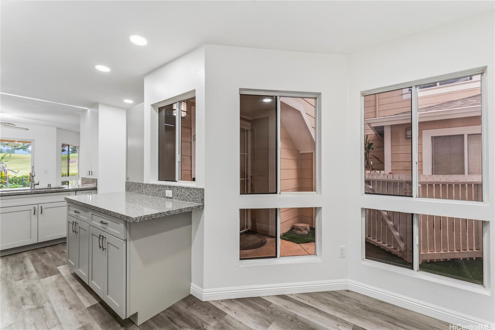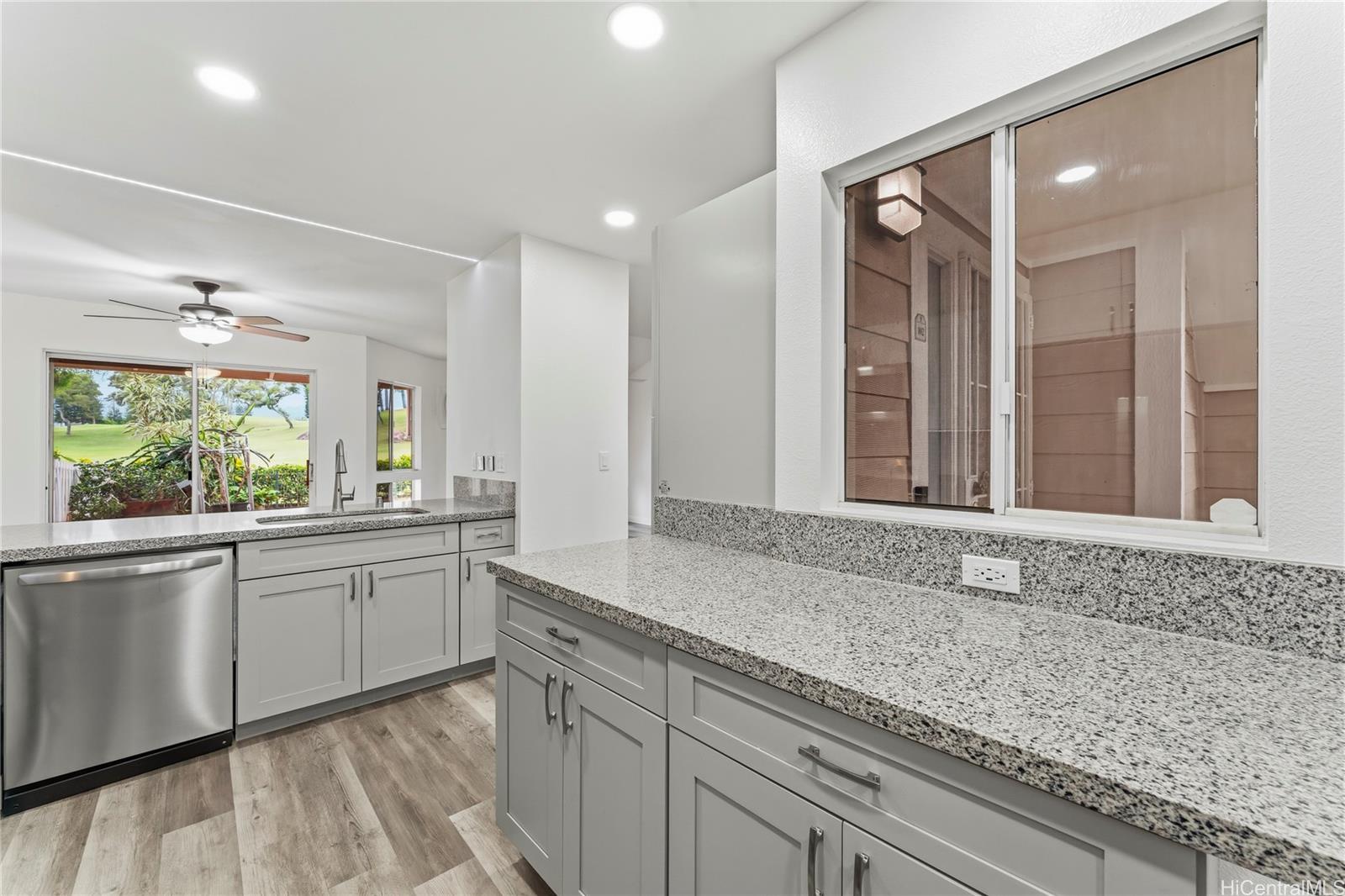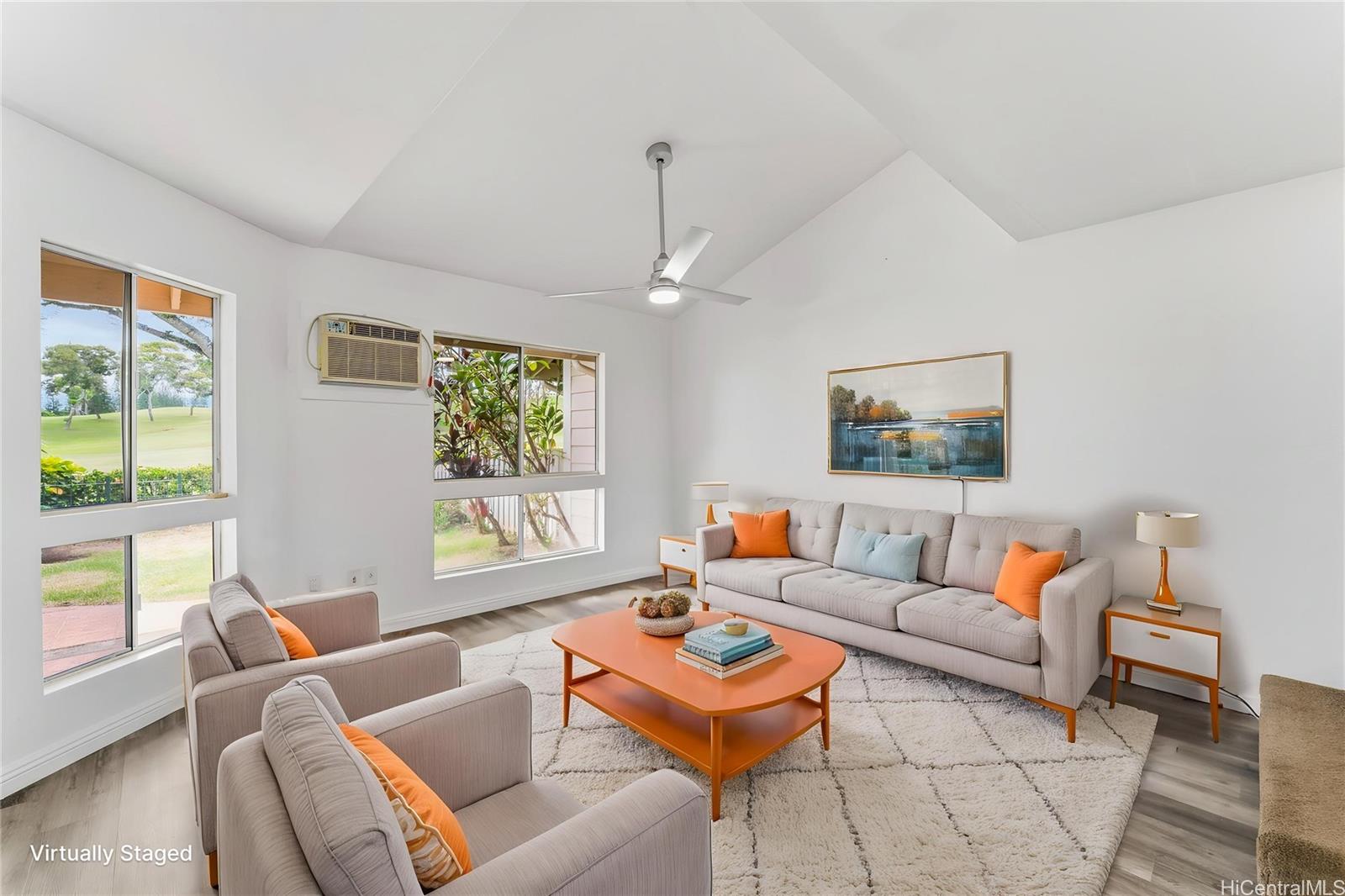 Golf course frontage 3 bedroom, 2.5 bath townhome in Greens at Waikele featuring 4 parking spaces! Recently remodeled kitchen plus vinyl plank flooring on main level. Upstairs primary bedroom has a large walk-in closet, golf course views, and the updated primary bathroom awaits with modern luxuries. Spacious interior layout is bolstered by a large, fenced-in private yard space overlooking Waikele Country Club. Ample storage and full sized washer/dryer are found in the 2 car garage, plus an additional 2 cars may be parked directly outside the garage. This well maintained community with generous guest parking is conveniently located near Waikele Premium Outlets, dining options, freeway access and more.
