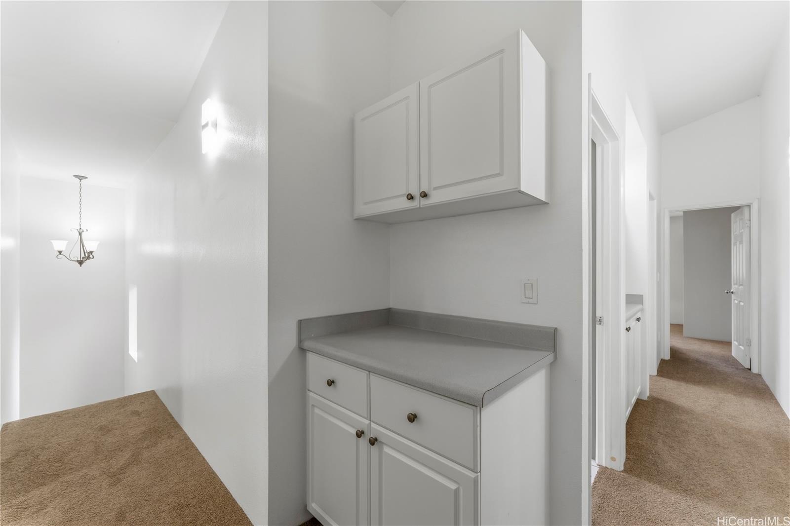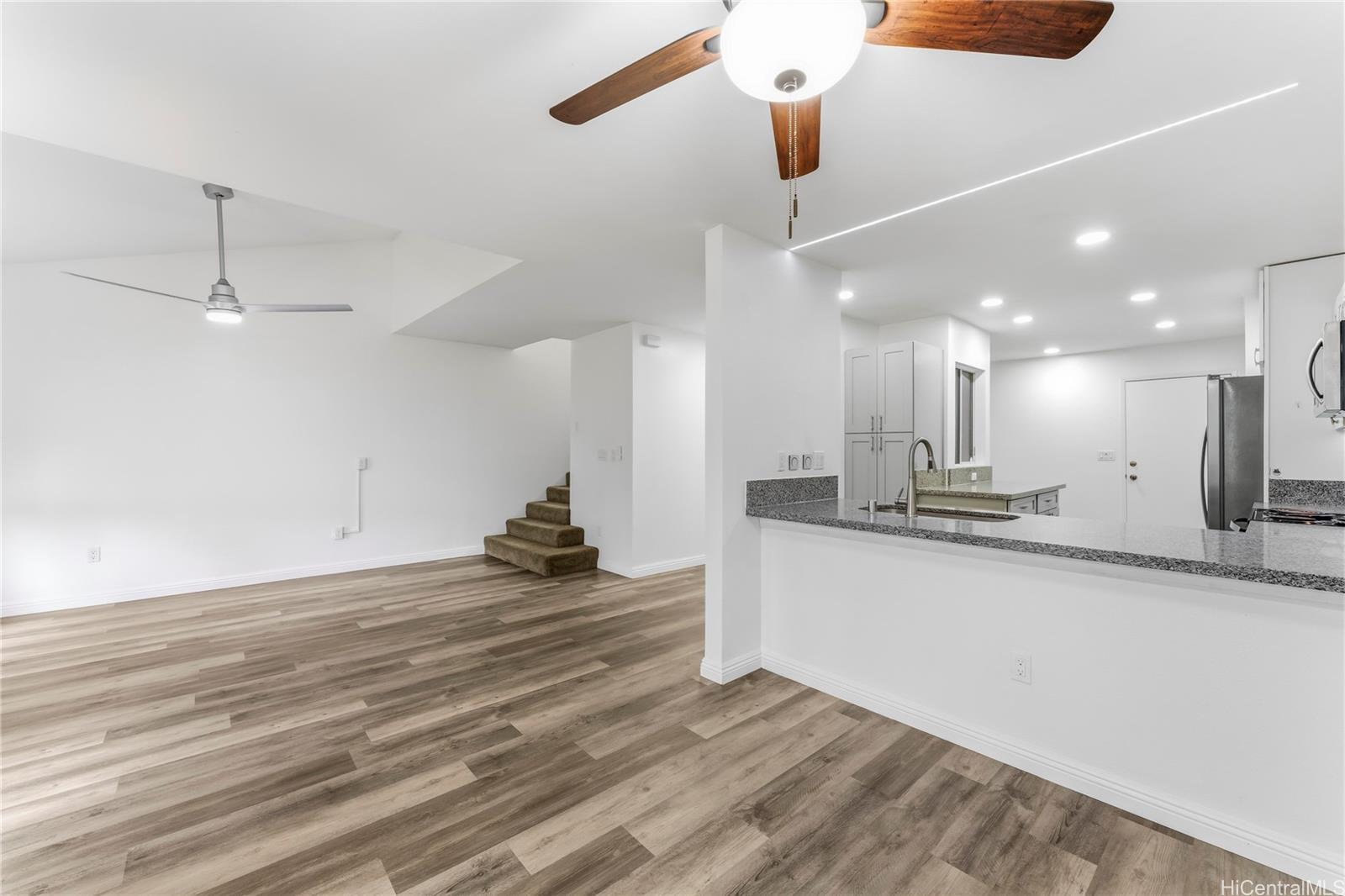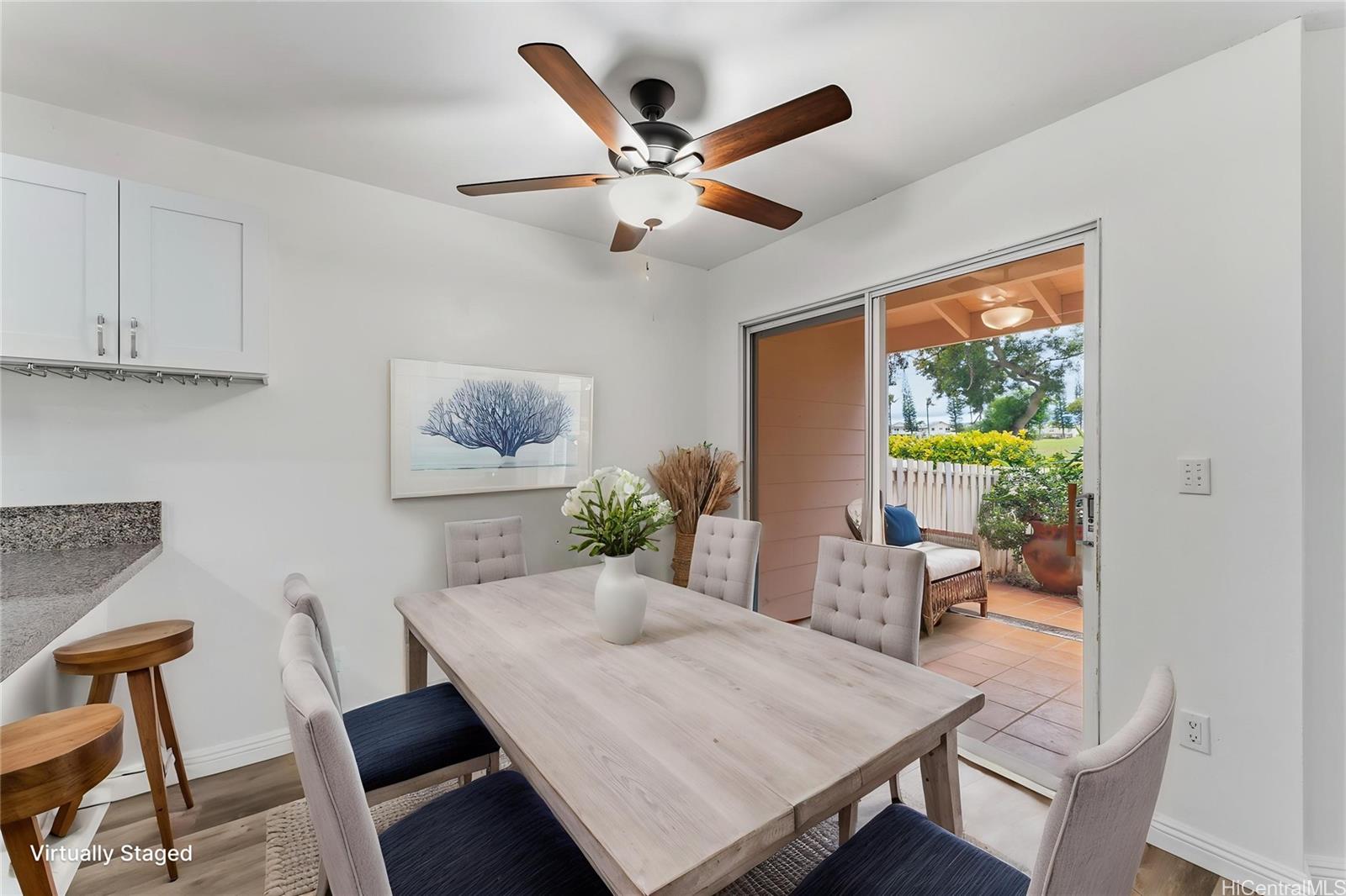 Golf course frontage 3 bedroom, 2.5 bath townhome in Greens at Waikele featuring 4 parking spaces! Recently remodeled kitchen plus vinyl plank flooring on main level. Upstairs primary bedroom has a large walk-in closet, golf course views, and the updated primary bathroom awaits with modern luxuries. Spacious interior layout is bolstered by a large, fenced-in private yard space overlooking Waikele Country Club. Ample storage and full sized washer/dryer are found in the 2 car garage, plus an additional 2 cars may be parked directly outside the garage. This well maintained community with generous guest parking is conveniently located near Waikele Premium Outlets, dining options, freeway access and more.