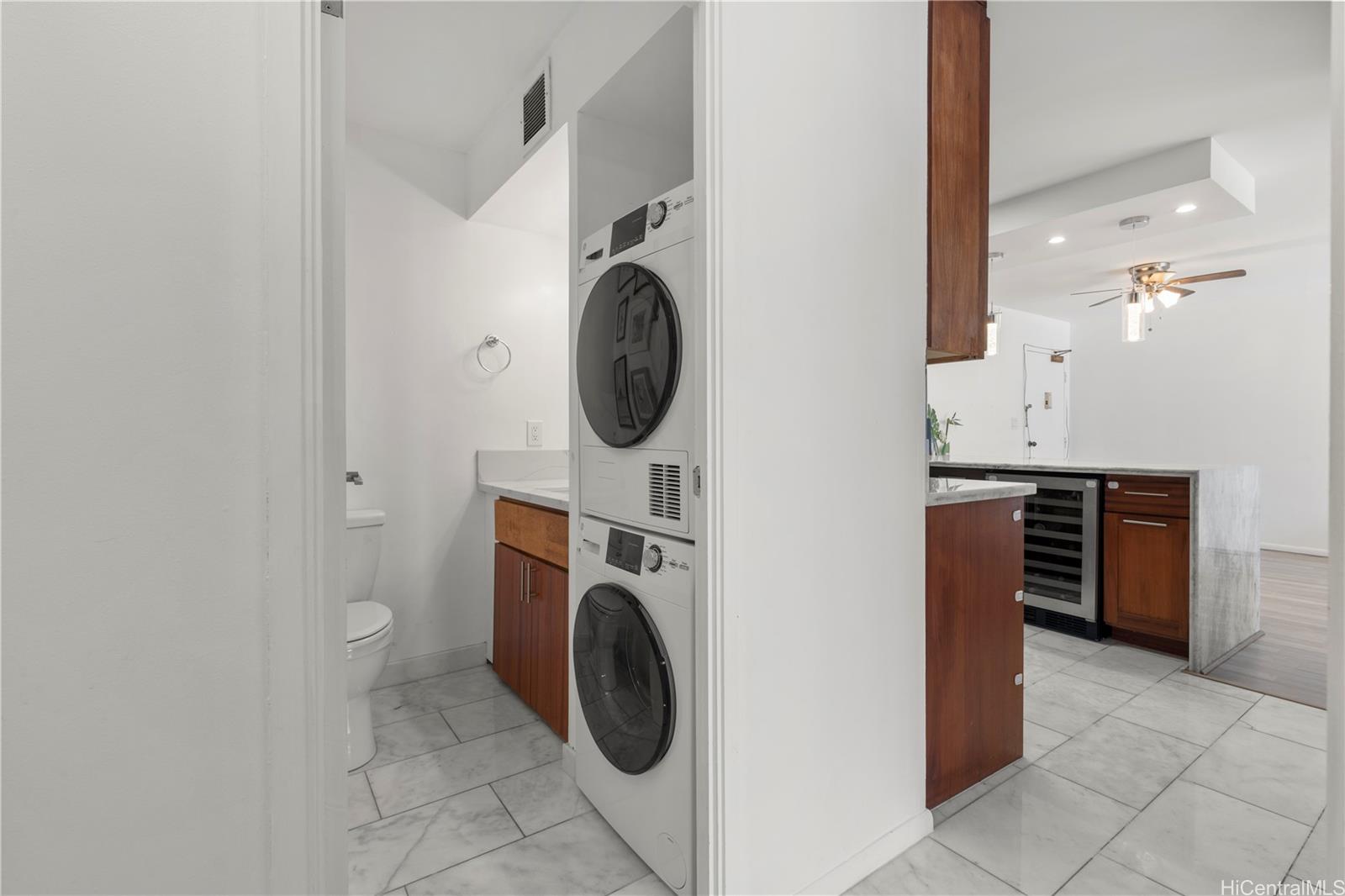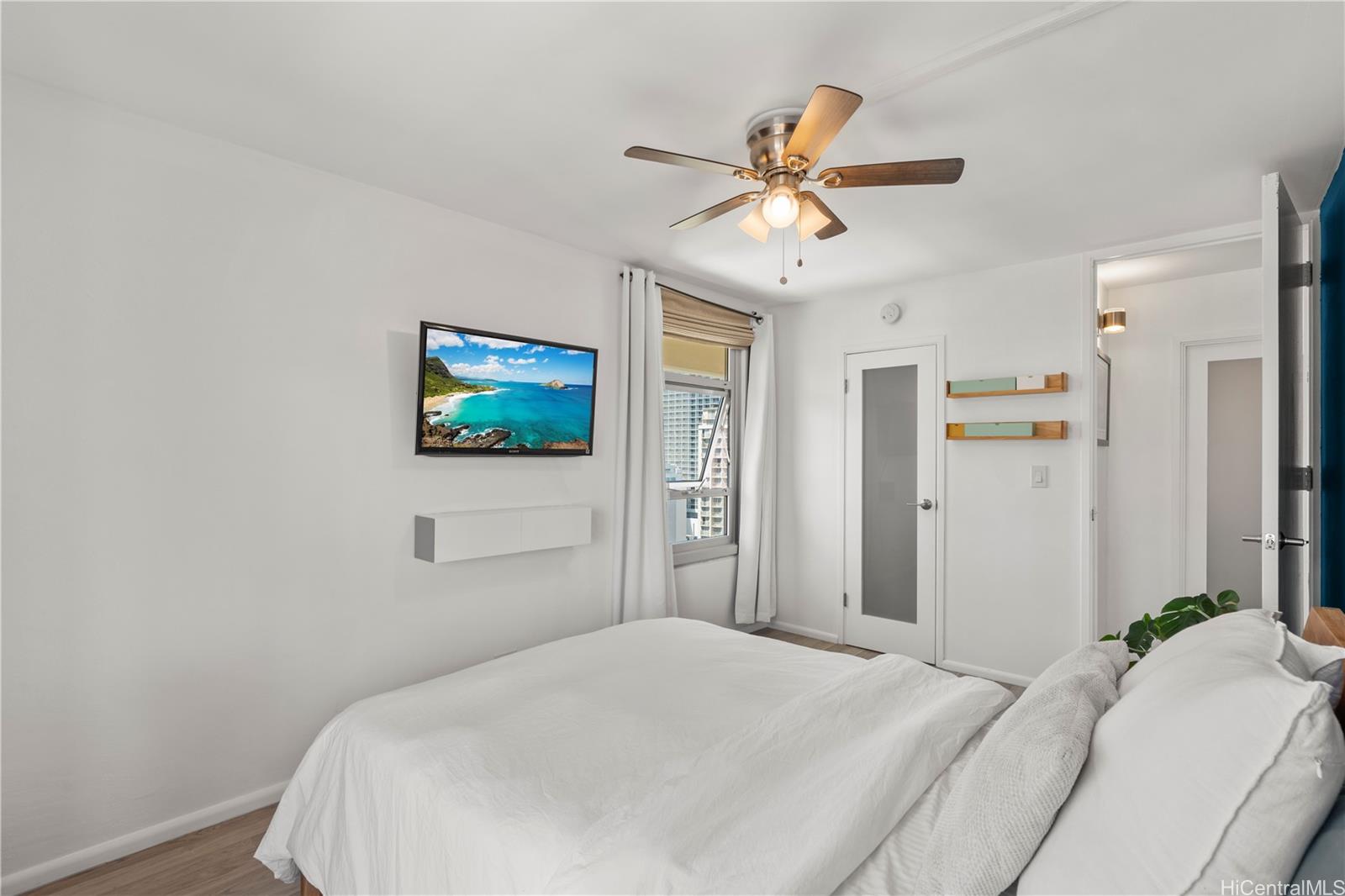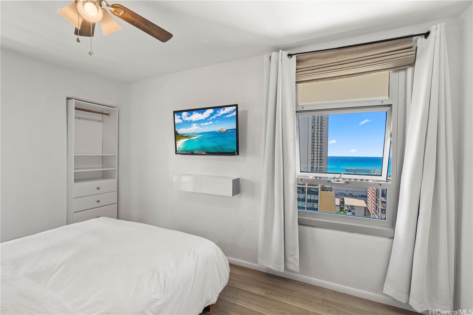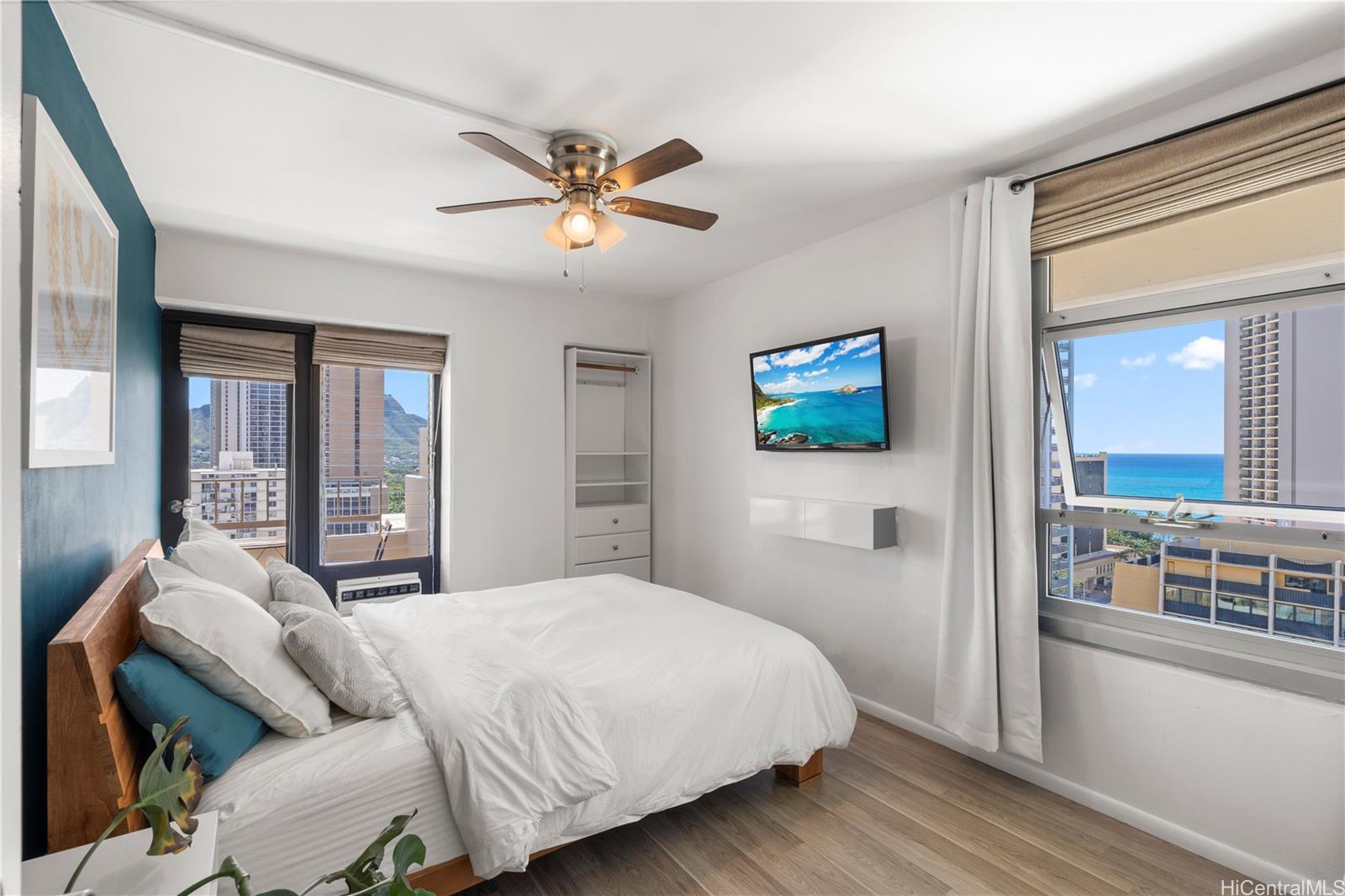 The beach is calling from this stunning, turnkey 2-bedroom penthouse retreat in the heart of Waikiki! Meticulously renovated, this 830 sq. ft. home at the Governor Cleghorn offers breathtaking views of the turquoise Pacific Ocean, Koolau mountains, and a peek-a-boo view of iconic Diamond Head. The interior features a gourmet kitchen with custom cabinetry, stainless steel appliances, and a wine refrigerator. Unwind in your expansive primary suite, complete with a walk-in closet and a spa-inspired bath. Enjoy seamless indoor-outdoor living on your spacious private lanai with custom benches, perfect for sunset cocktails and cool trade winds. Modern conveniences include an in-unit washer/dryer, A/C, a storage room in the lanai, and a highly desirable ground-level parking stall located just steps from the secure keyed elevator. The building features a resident manager and a refreshing swimming pool for entertaining friends and family. Perfectly positioned two blocks from world-famous Waikiki beaches and steps from the International Market Place, this is your opportunity to live where every day feels like a vacation!