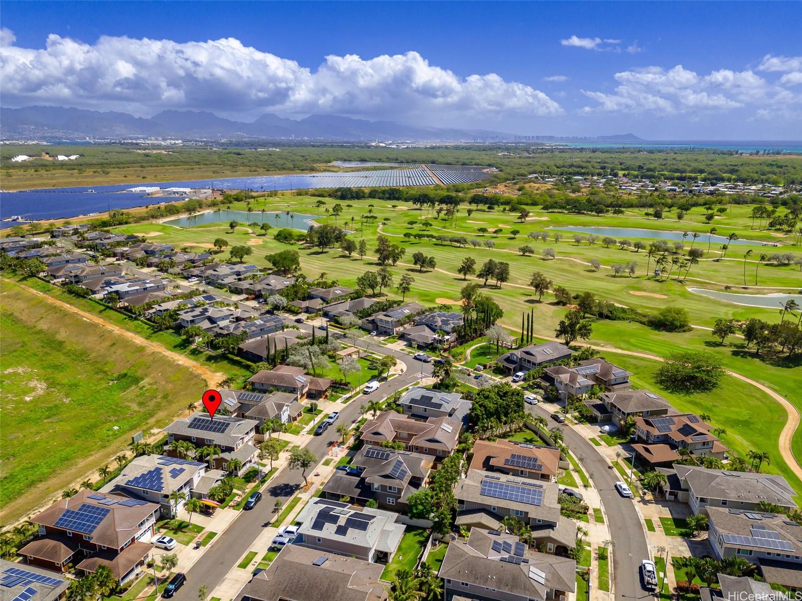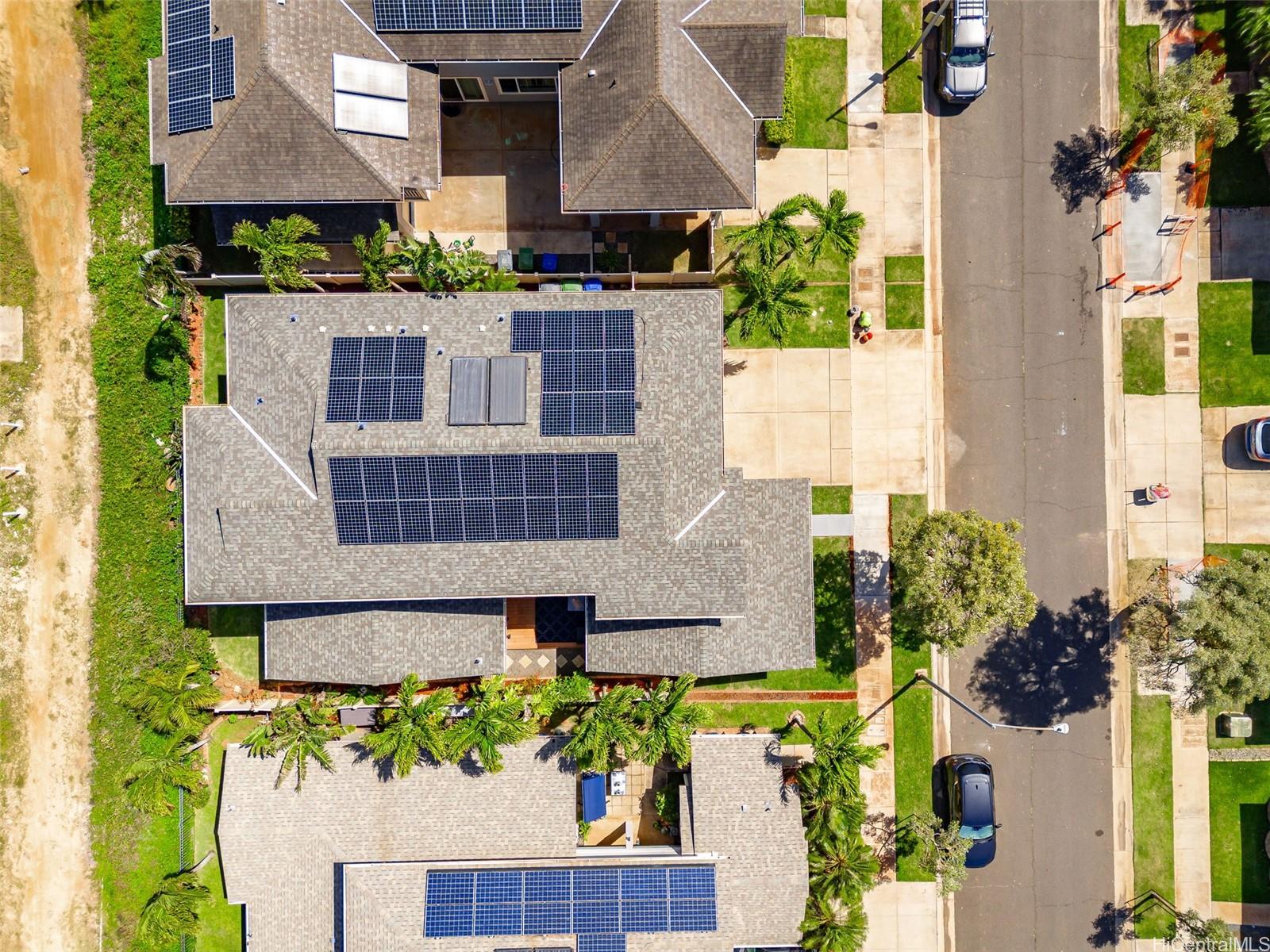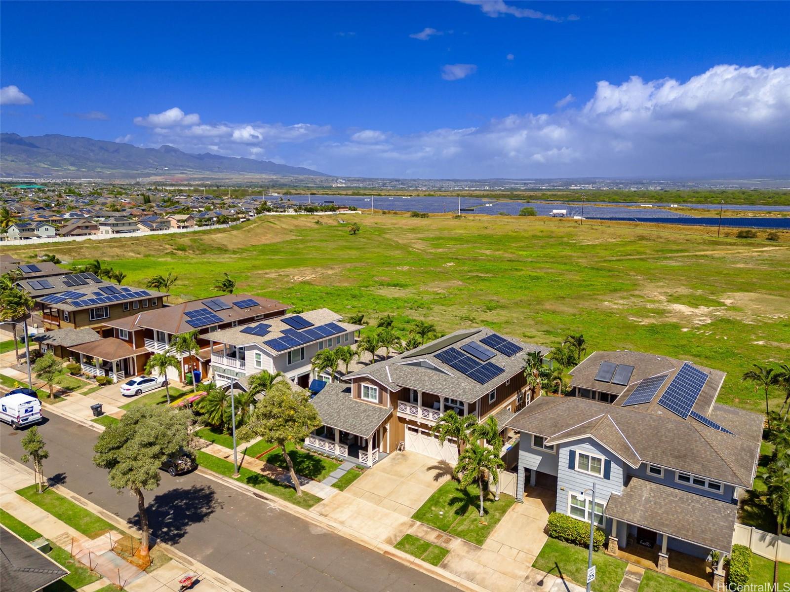 Welcome to Haleakea, one of the premier neighborhoods on the Ewa Plains, with wide sidewalks, larger lots and executive style homes including this jewel! Just over 2600 sq ft of space gives you 4 bedrooms and 3 full baths, including 1 full bath and bedroom on the main floor. The large kitchen will become the heart of your new home with the adjoining dining area and family room creating a hub for daily life. The main floor also features a large front room that can be a formal sitting room, children’s playroom, tv room or gym. Let’s not forget outdoor space...an inviting front porch to greet guests, a side lanai for a barbecue grill, smoker or party space and a large back lanai, perfect for relaxing in the evening and enjoying the mountain views. Upstairs, you’re greeted with a spacious landing that leads to the bedrooms and primary suite. On the second floor you also have a porch overlooking the front of the house and a lanai from the primary bedroom that overlooks the green space behind the house. Wait! There's more...a BRAND NEW AC, newer roof, 34 OWNED solar panels, 2 batteries and EV charger. Check out this beautiful home! Photos were taken prior to tenants moving in.