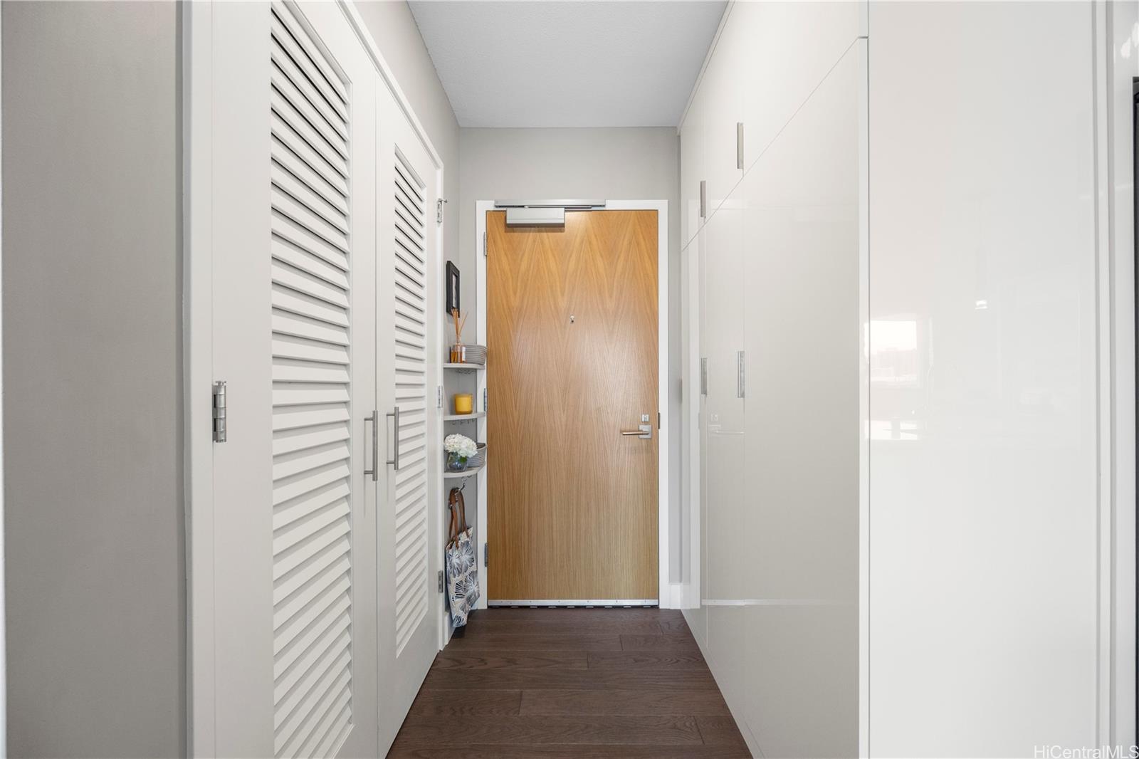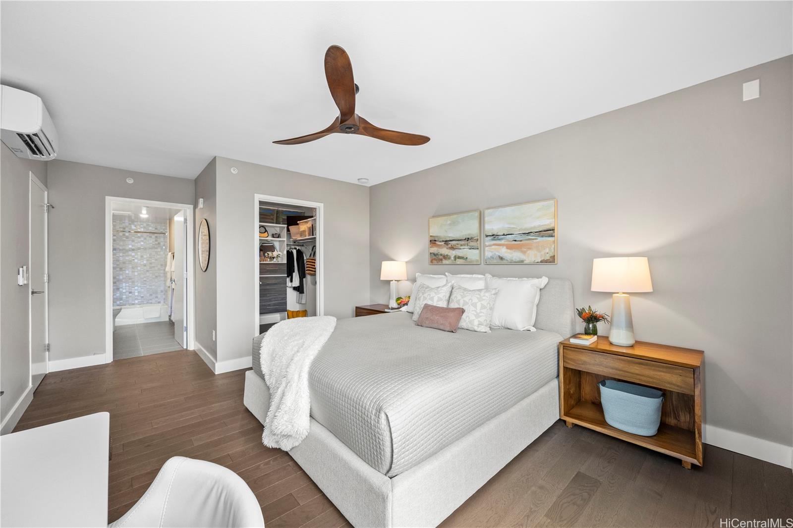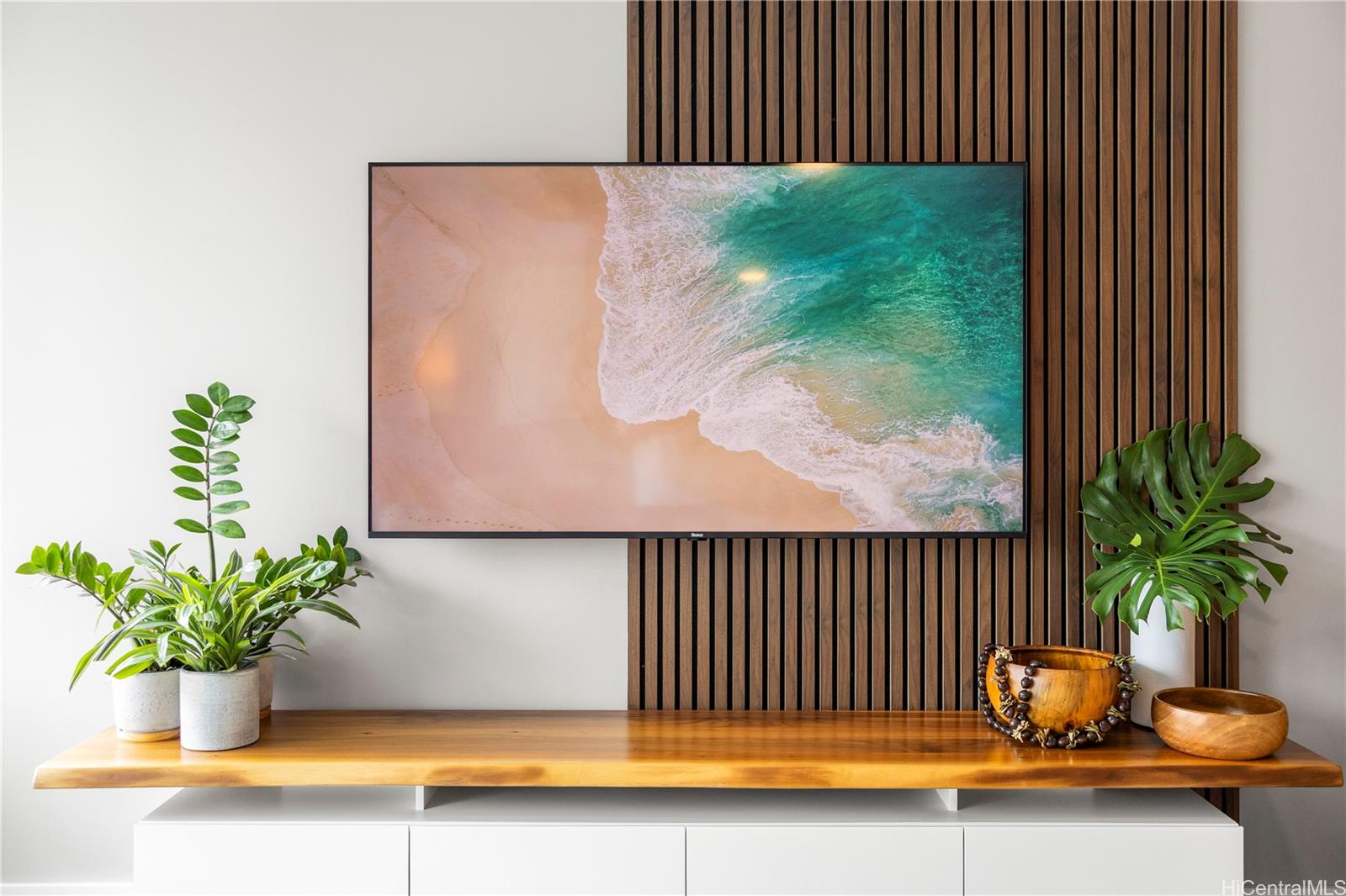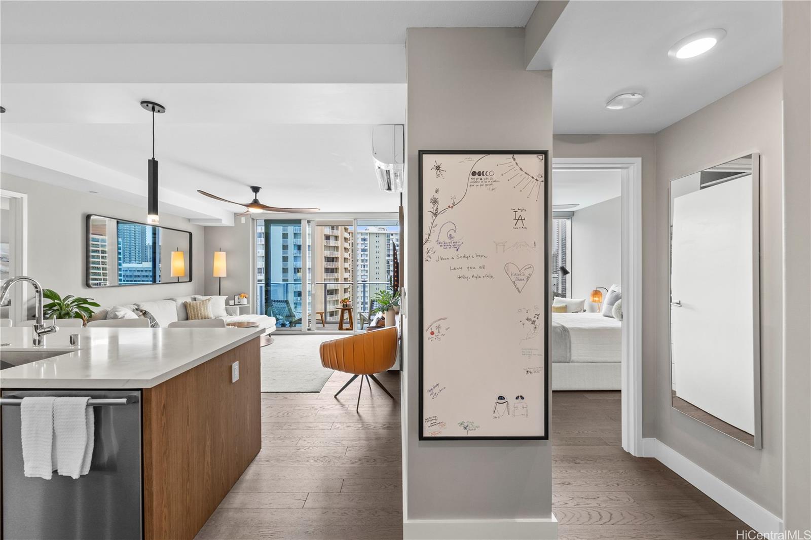 Exquisitely upgraded and meticulously maintained, this 2-bedroom, 2-bath residence at Azure Ala Moana blends elevated design with everyday functionality with an impressive array of custom enhancements. Rich French oak engineered wood floors run throughout, complemented by warm neutral tones. The living area features elegant wall paneling and a 65-inch TV with LED lighting. The reimagined entry offers full-height custom cabinetry for shoe and pantry storage, plus a functional drop zone that integrates seamlessly with the home’s finishes. Both bedrooms include custom closet systems and storage beds for optimal organization, while the guest room adds full-height built-ins and a Frame TV. Bathrooms are upgraded with additional hooks/towel bars, porcelain flooring and designer tilework for a refined look. Additional highlights include contemporary ceiling fans and motorized shades throughout, with blackout shades in bedrooms for comfort and privacy. Designer pendant/ceiling lights in the kitchen. Offered fully turnkey, the home includes designer furnishings, artwork, accessories, kitchenware, and bathware—creating a true move-in-ready lifestyle.