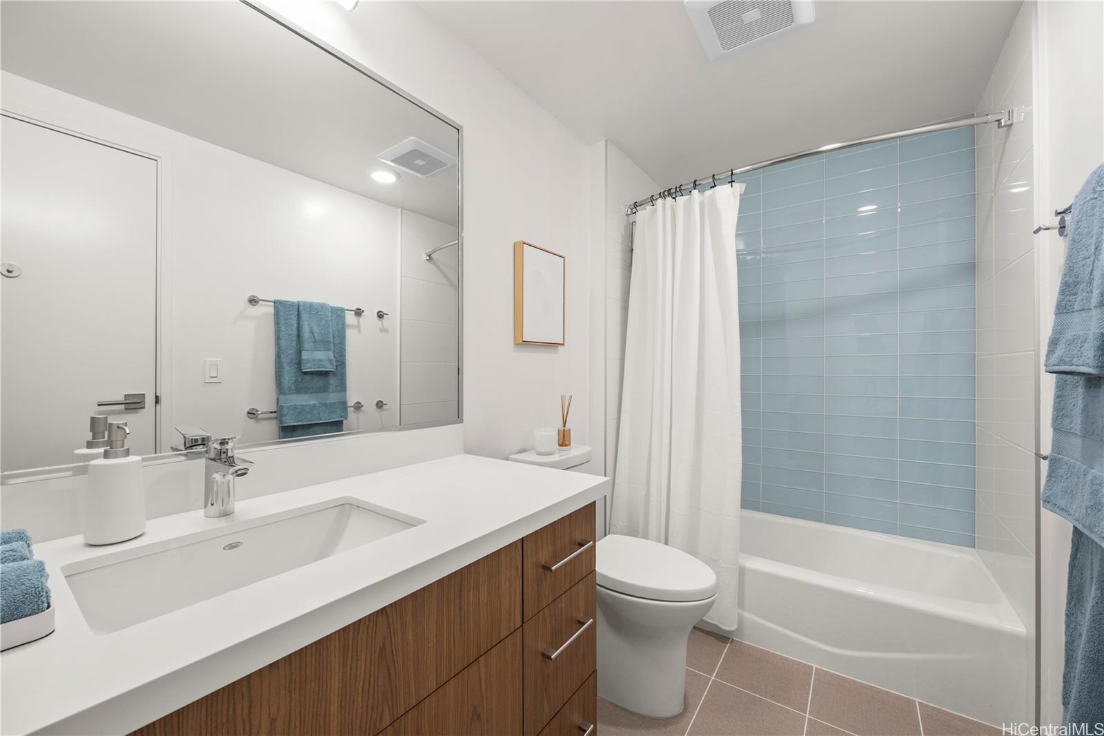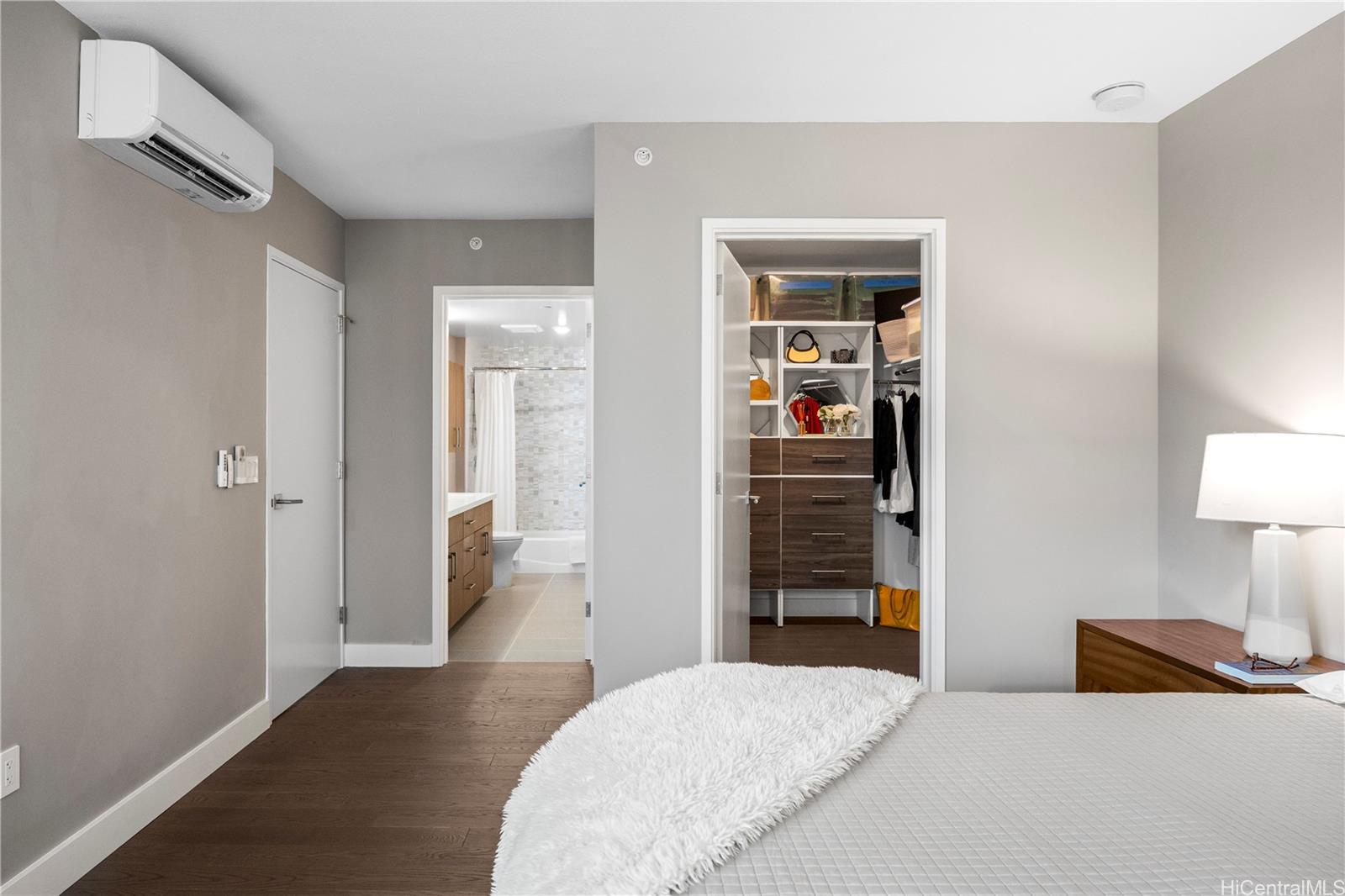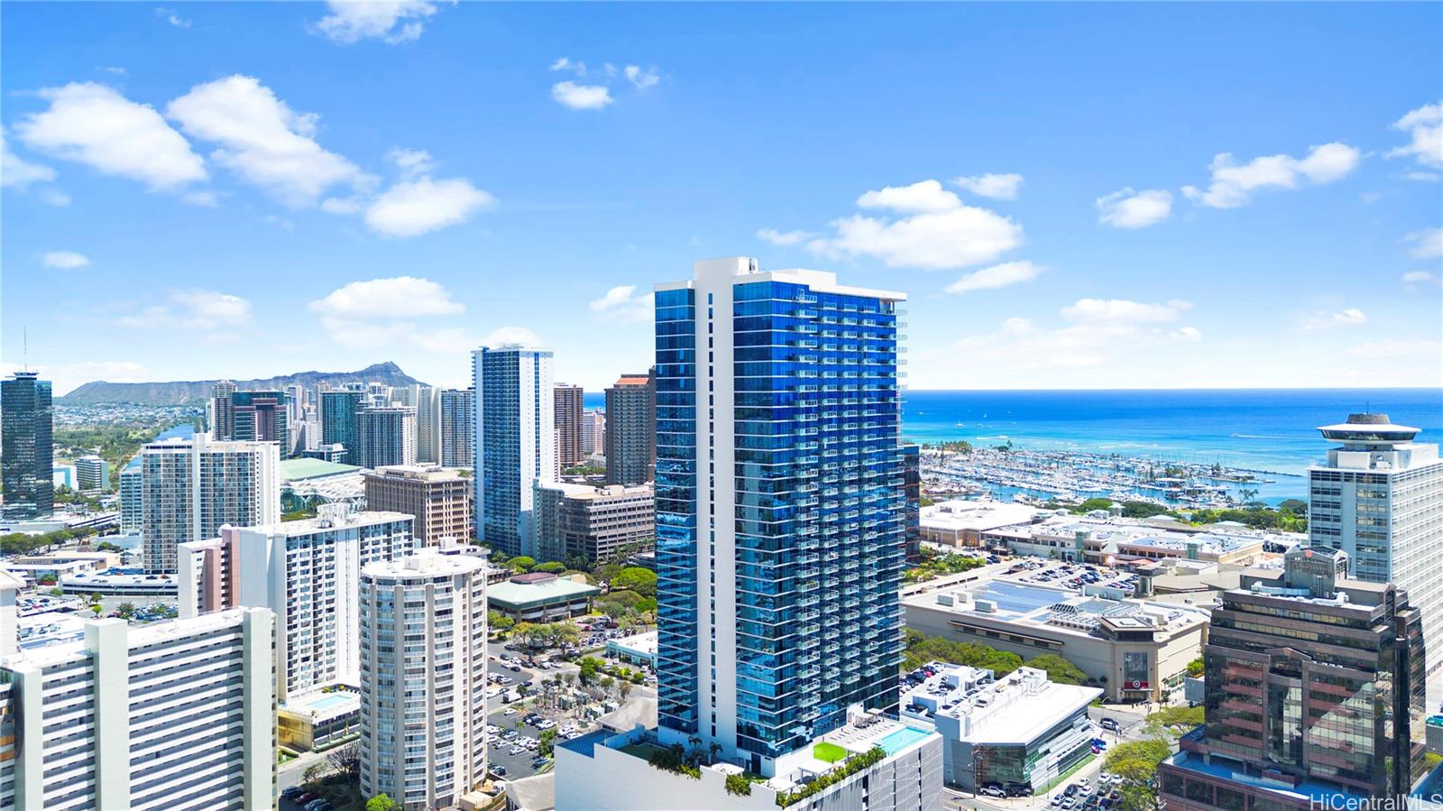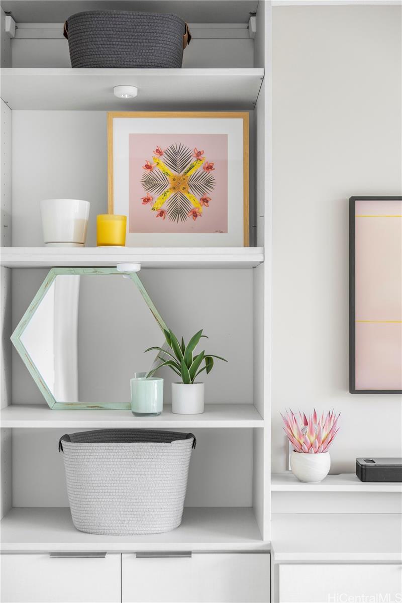 Exquisitely upgraded and meticulously maintained, this 2-bedroom, 2-bath residence at Azure Ala Moana blends elevated design with everyday functionality with an impressive array of custom enhancements. Rich French oak engineered wood floors run throughout, complemented by warm neutral tones. The living area features elegant wall paneling and a 65-inch TV with LED lighting. The reimagined entry offers full-height custom cabinetry for shoe and pantry storage, plus a functional drop zone that integrates seamlessly with the home’s finishes. Both bedrooms include custom closet systems and storage beds for optimal organization, while the guest room adds full-height built-ins and a Frame TV. Bathrooms are upgraded with additional hooks/towel bars, porcelain flooring and designer tilework for a refined look. Additional highlights include contemporary ceiling fans and motorized shades throughout, with blackout shades in bedrooms for comfort and privacy. Designer pendant/ceiling lights in the kitchen. Offered fully turnkey, the home includes designer furnishings, artwork, accessories, kitchenware, and bathware—creating a true move-in-ready lifestyle.