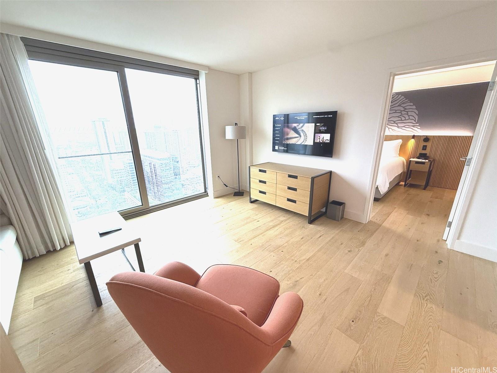 ホノルルの中心部に位置するスカイ・アラモアナ・イーストの高層階にある1ベッドルーム/1バスルームのユニットです。床から天井までの窓からは、街並み、山々、そして一部海を一望でき、自然光がたっぷりと差し込みます。洗練されたデザインのこのユニットは、モダンな内装、現代的な家具、そして効率的な空間利用が特徴です。スカイ・アラモアナは、プール、フィットネスセンター、24時間セキュリティなど、リゾートスタイルのアメニティを備えた比較的新しい開発物件です。アラモアナ・ショッピングセンター、アラモアナ・ビーチパーク、ワイキキ、そして様々なレストランやエンターテイメント施設までわずか数分という便利な立地です。このユニットはホテルレンタルプログラムの一部となっており、好立地で収益性を求める投資家にとって絶好の機会です。家具付きで、すぐにでも入居可能です。
