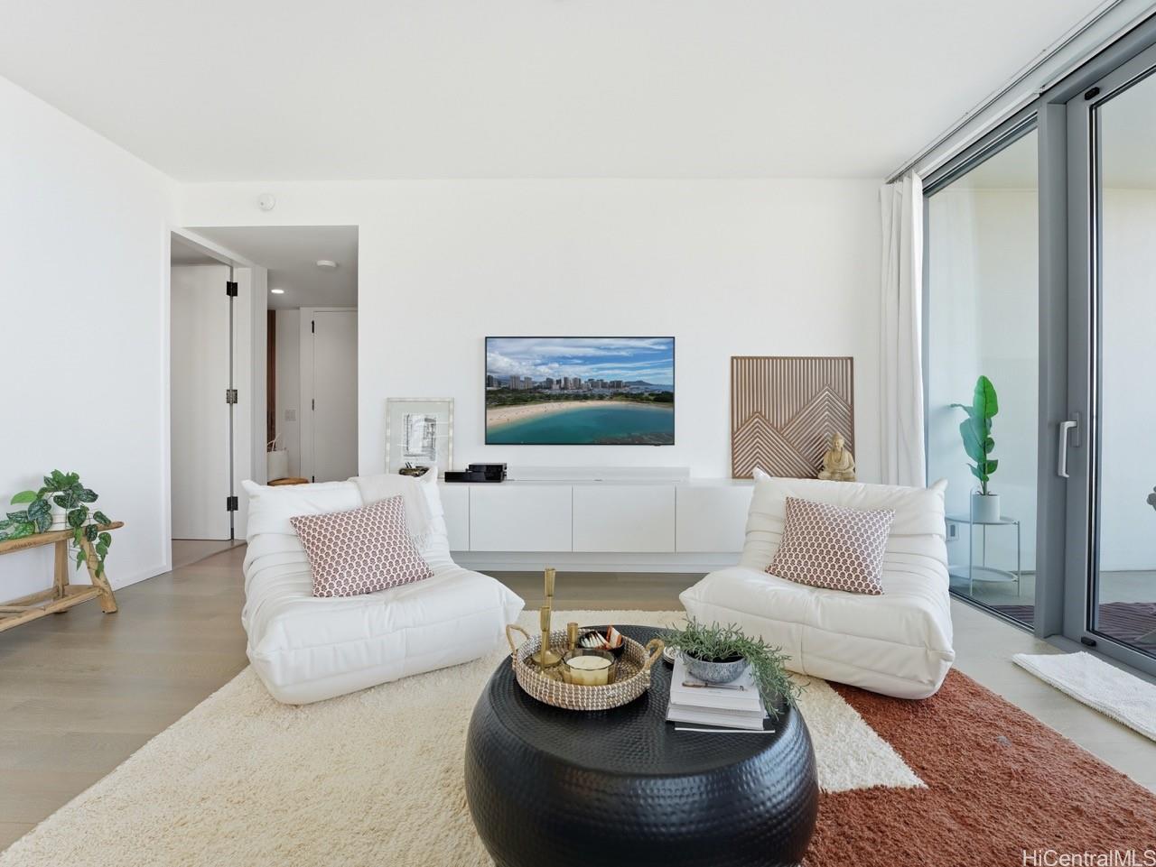 The highly coveted "01" corner unit at Ko'ula - featuring breathtaking views of the ocean & horizon, sunsets, Kewalo Boat Harbor, and the newly renovated Victoria Ward Park. This well laid out 1-bedroom has a spacious living room flow to your dining/kitchen area, and provides actual outdoor living space with a deep and usable lanai with privacy walls on either side. Upgrades include modern fixtures, a repainted interior for a bright and airy feel, electronic blinds, drapes, and full black-out curtains in your bedroom for undisturbed rest. This unit is fully furnished with higher-end furniture, each piece carefully chosen for this home. Our parking stall is not the tighter compact stall that most units have...something to be mentioned. Ko'ula is most conveniently located just above a large green park/playground, the newest stores, restaurants, coffee shops, and gyms in all of Ward Village.