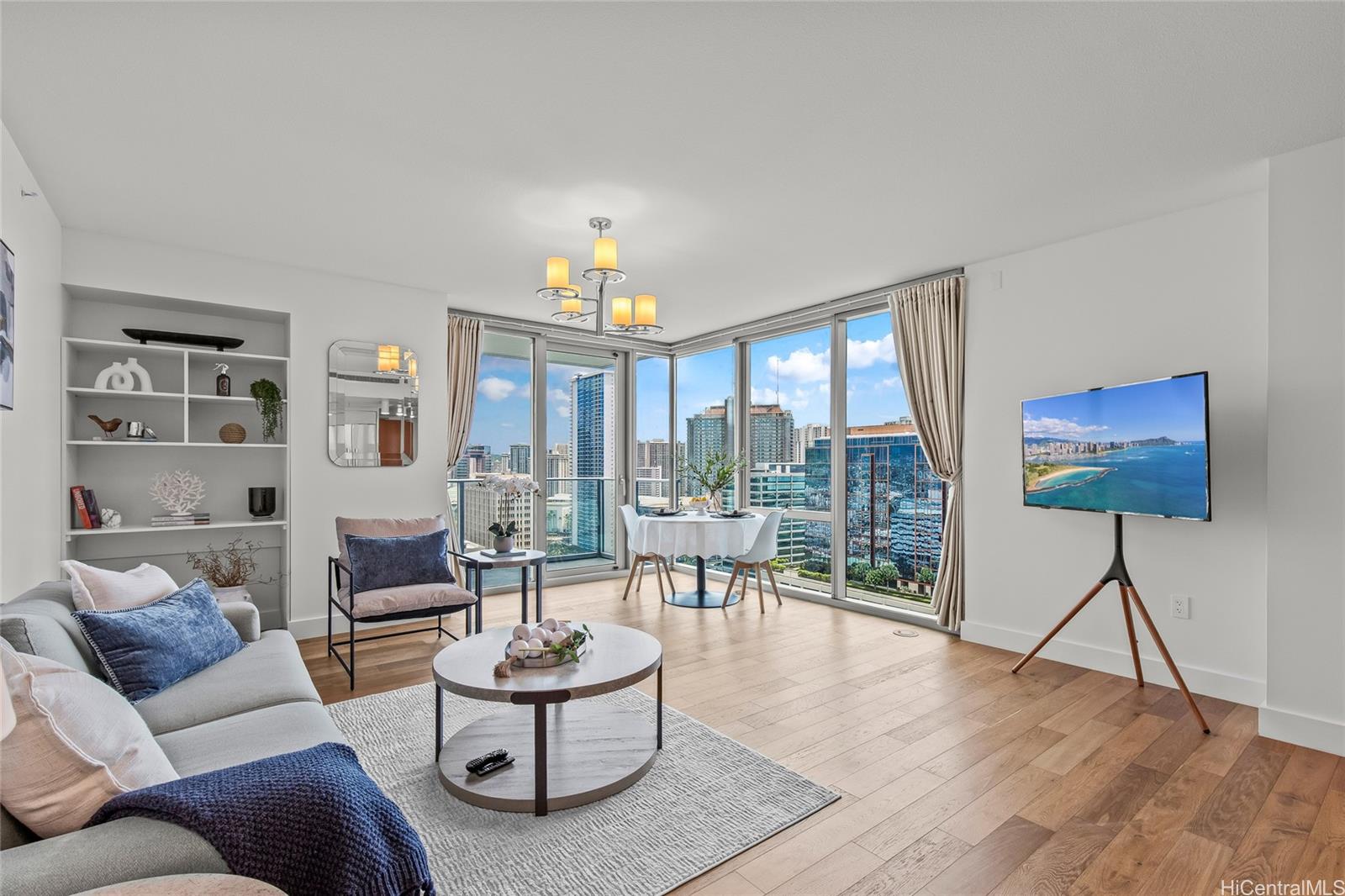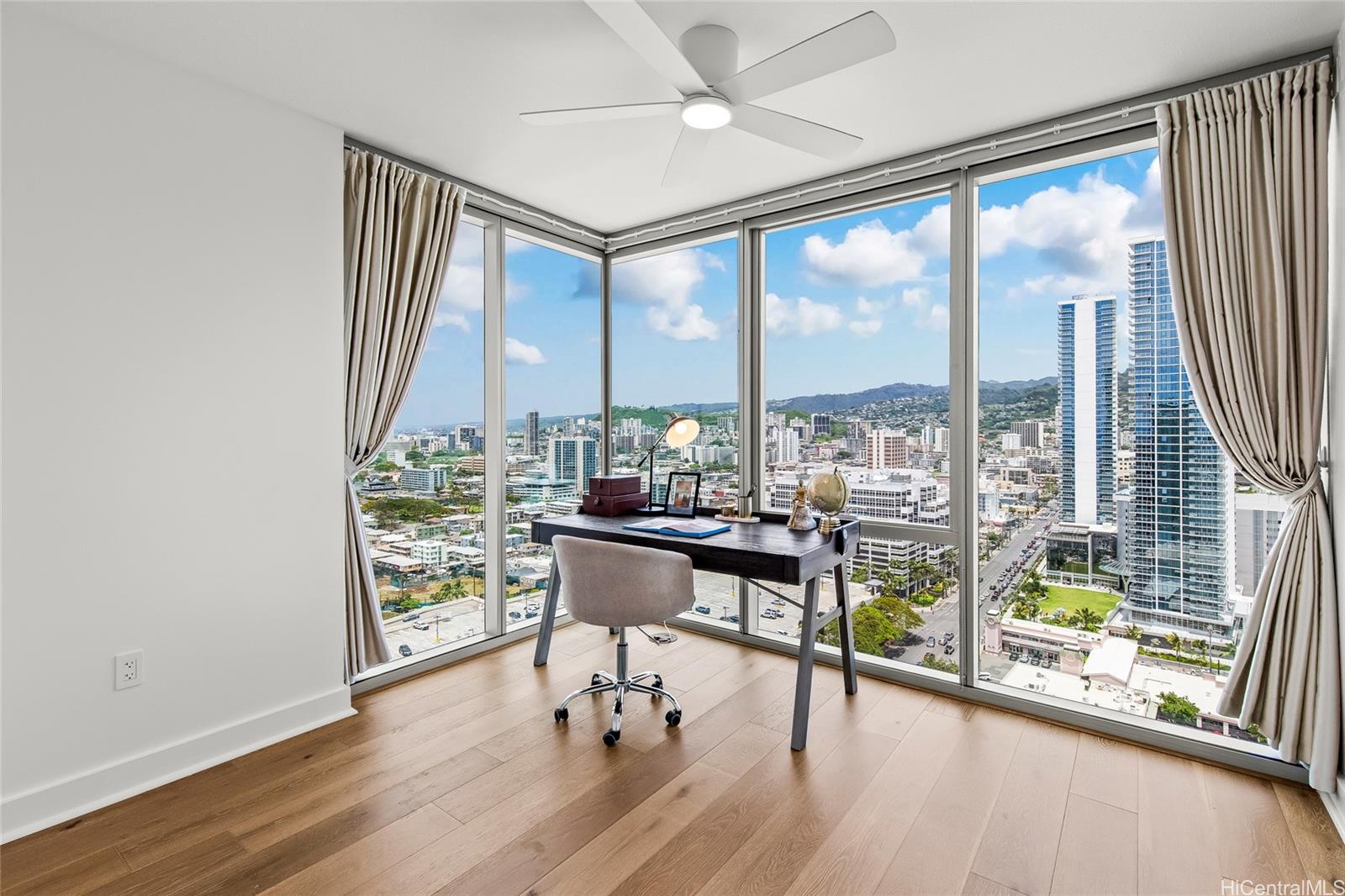 アジュール・アラモアナの希少物件、この最高級コーナーレジデンスには、ホノルルでは非常に希少で高価な5フィート×10フィートの専用収納室が備わっています。プレミアムスタック11に位置するこの物件は、メイン構造から突き出したジェットアウトデザインにより、より広い居住空間と、優れた採光、通風、眺望を実現する床から天井までのガラス張りの3つのコーナーが特徴です。リビングルームは全面ガラス張りのコーナーでオーシャンビューを楽しめるほか、ダイヤモンドヘッド、日の出、街の明かり、雄大なコオラウ山脈を望むことができ、昼夜を問わず心を落ち着かせたり、興奮させたりする空間となっています。オーシャンビュー、マジックアイランド、ハーバービューはMUSEによって遮られることはありません。2つのベッドルームはどちらもガラス張りのコーナーで、山と街の広大な眺望が広がります。内装のアップグレードとして、全室にエンジニアードウッドフローリング(カーペットなし)、キッチンとバスルームにはタイル、ダクト式スプリットエアコンシステムを採用し、セントラル空調のようなすっきりとした外観とエネルギー効率の高いゾーン制御を実現しています。2台分の専用駐車場付き。アジュール・アラモアナは、郵便番号96814エリアで最低30日間のレンタルが可能な数少ない建物のひとつで、柔軟性と高い賃貸収益性を誇ります。リゾートのアメニティには、ゲストスイート、フィットネスセンター、プール、シックなカバナなどがあります。